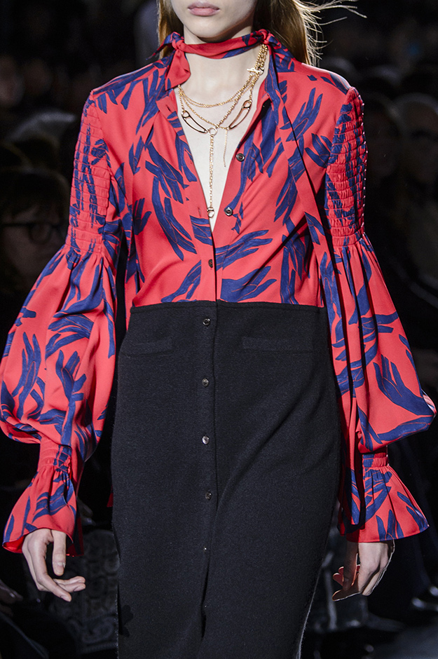 Основные элементы: яркие летящие платья и свободные блузки с принтами и бантами в духе 70-х, объемные дубленки, свитера и джемперы крупной вязки, объемные пальто, свободные брюки прямого кроя
