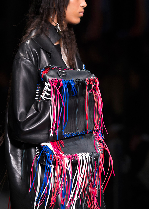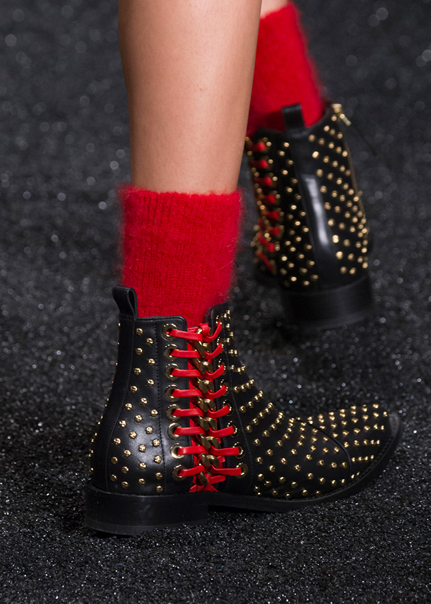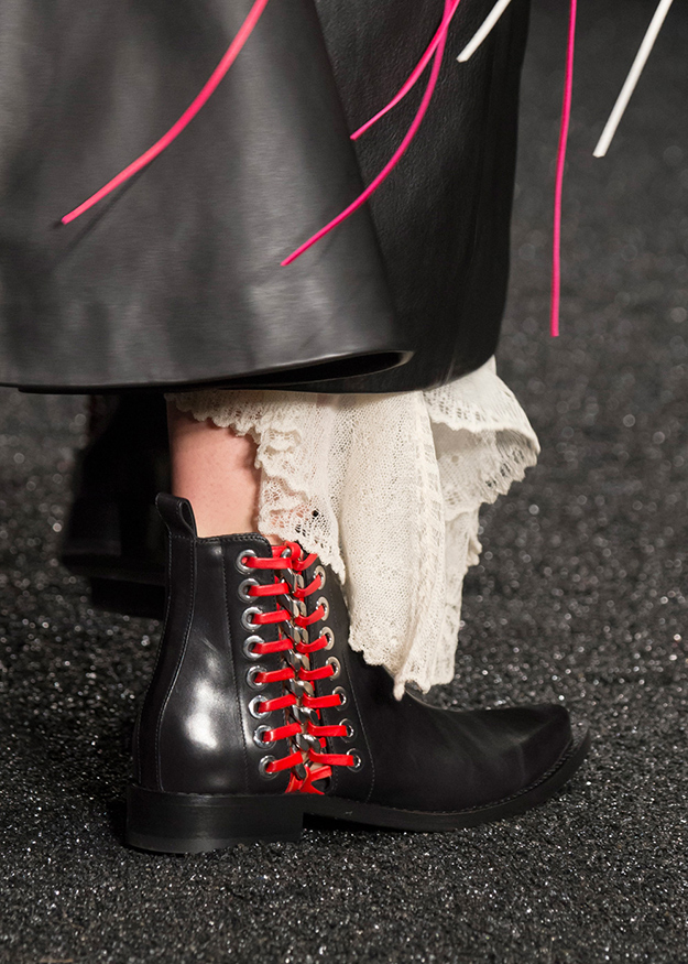 Аксессуары: черные кожаные ботинки с красной шнуровкой сбоку, ботинки с клепками, ботинки с вышивкой, сумки со множеством шнурков и лент, грубые украшения в кельтском стиле, очень длинные черные кожаные ремни, разноцветные носки