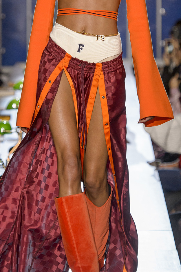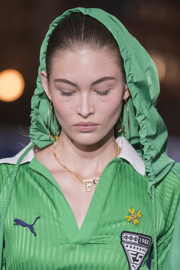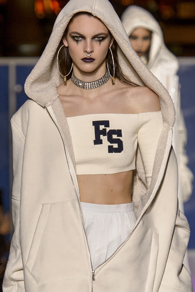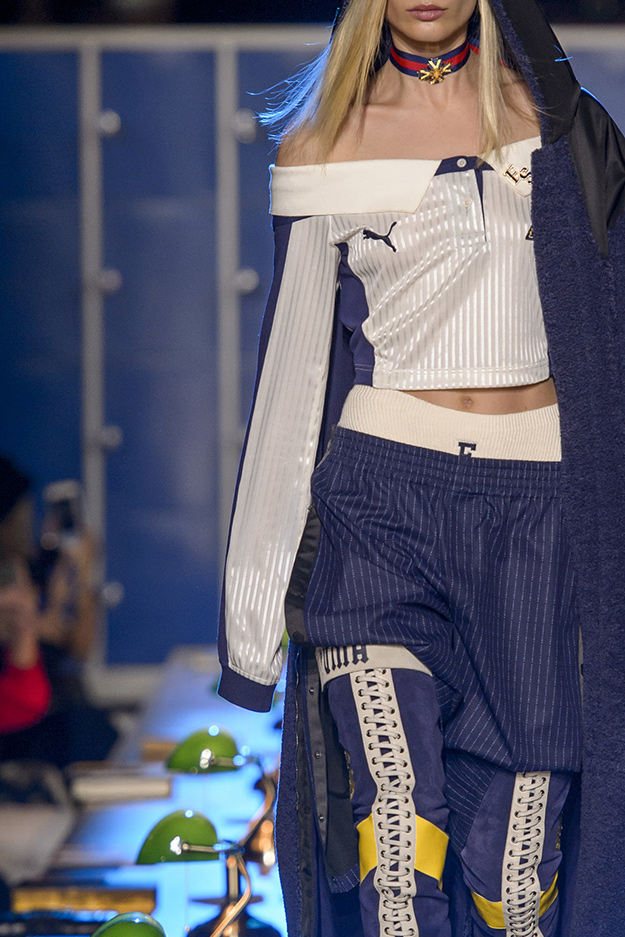 Модели были в образах ботаников, скейтеров, хипстеров, готов и хулиганов, которые ходили по библиотечным столам вместо подиума и подглядывали за гостями показа с балконов библиотеки. Коллекция сделана в лучших традициях Рианны: oversize здесь сочетается с сексуальными женственными силуэтами. В коллекции много одежды в школьной эстетике: спортивные куртки, чирлидерские платья, похожие на школьную форму, велюровые спортивные костюмы, поло и бейсбольные футболки.