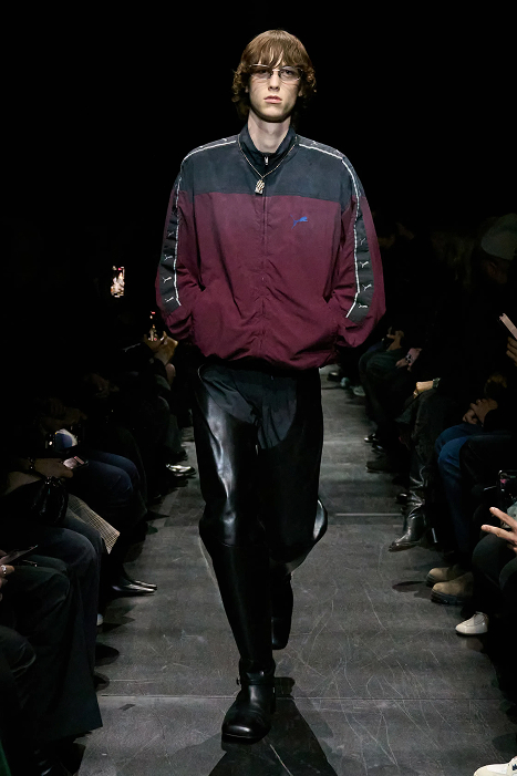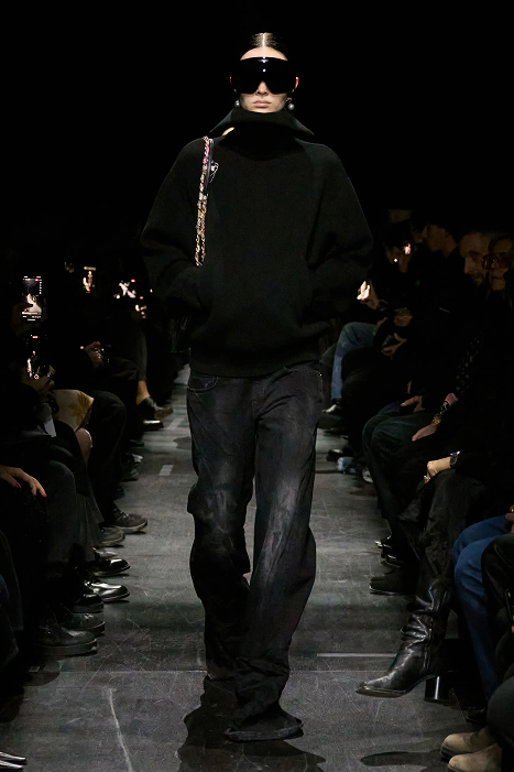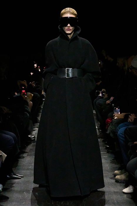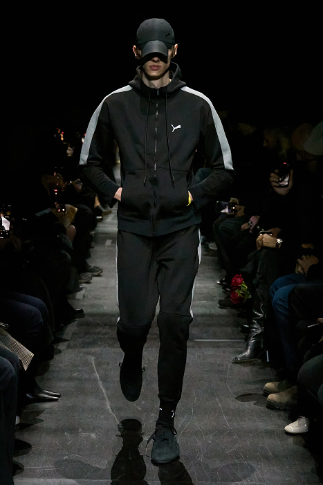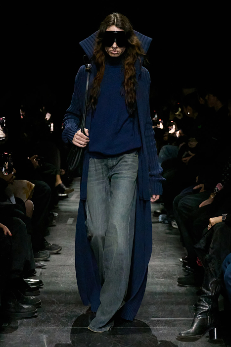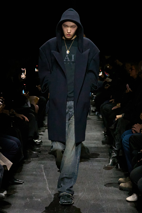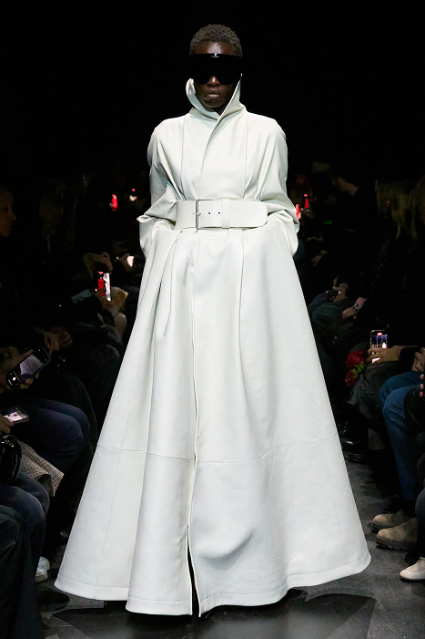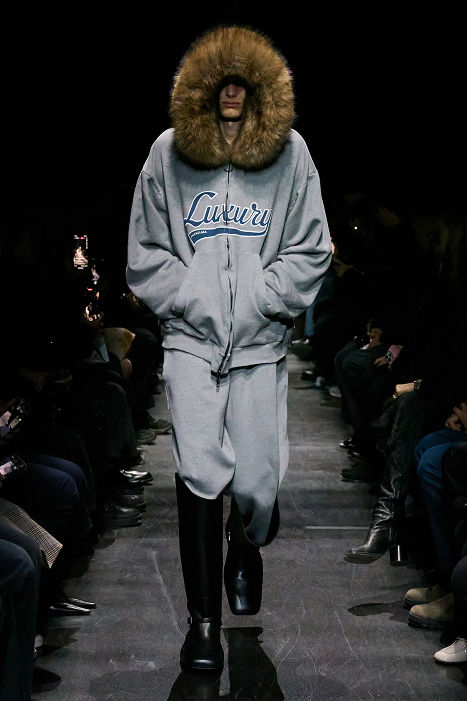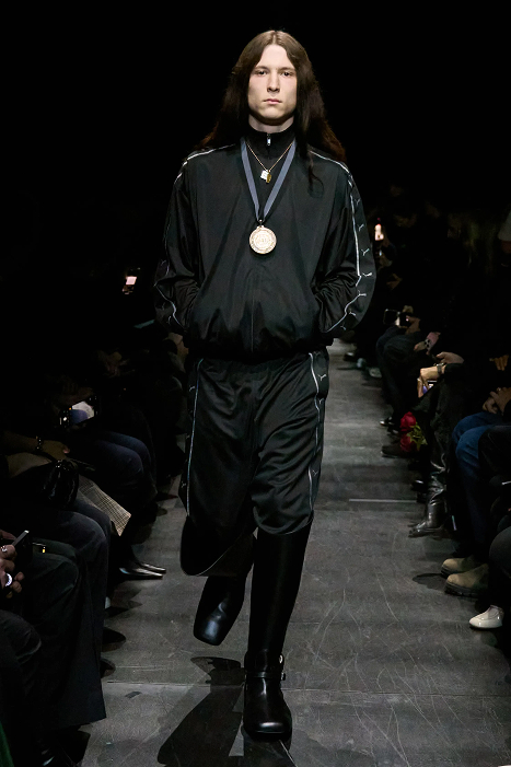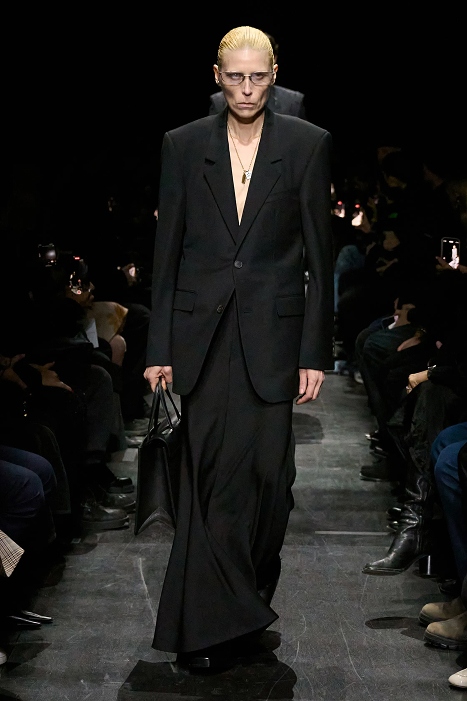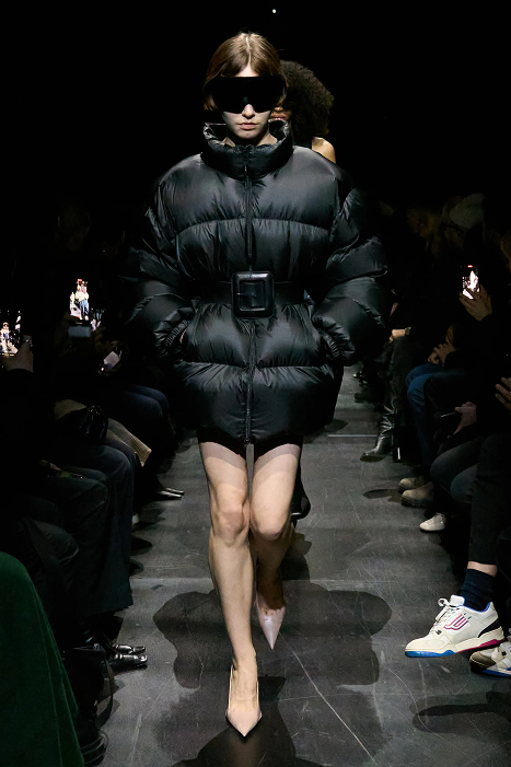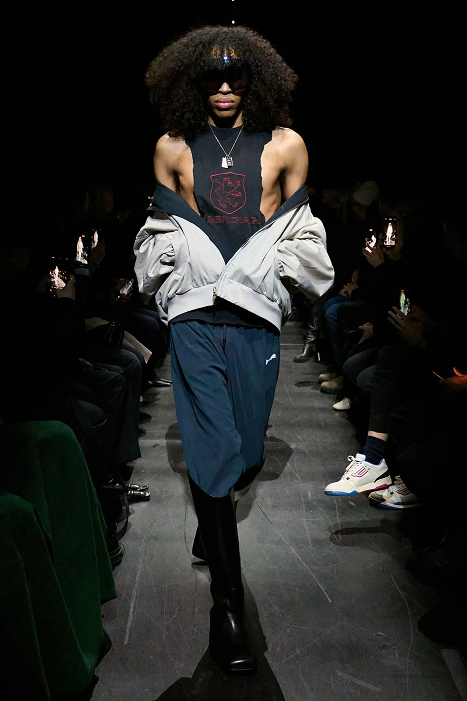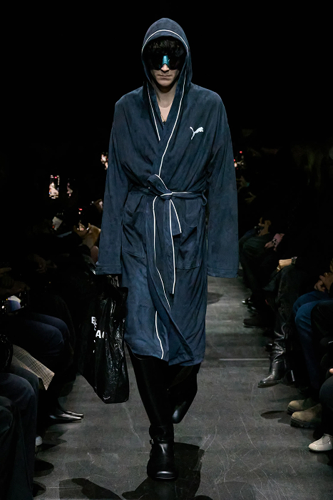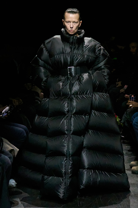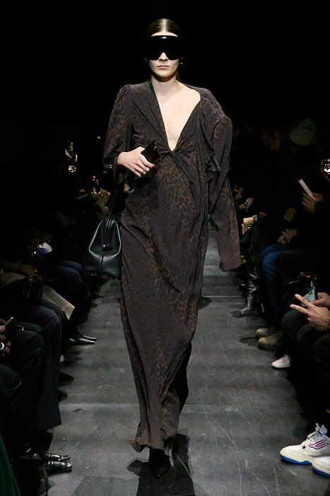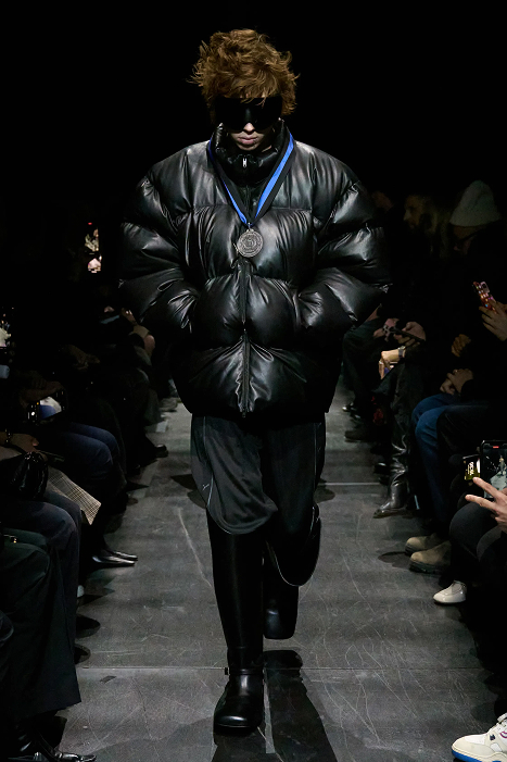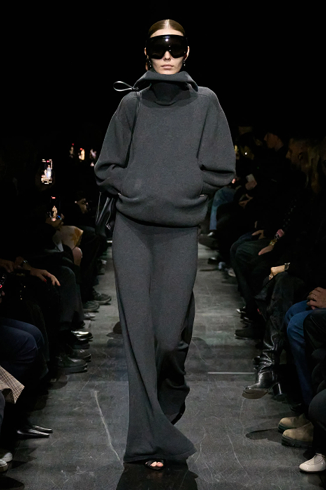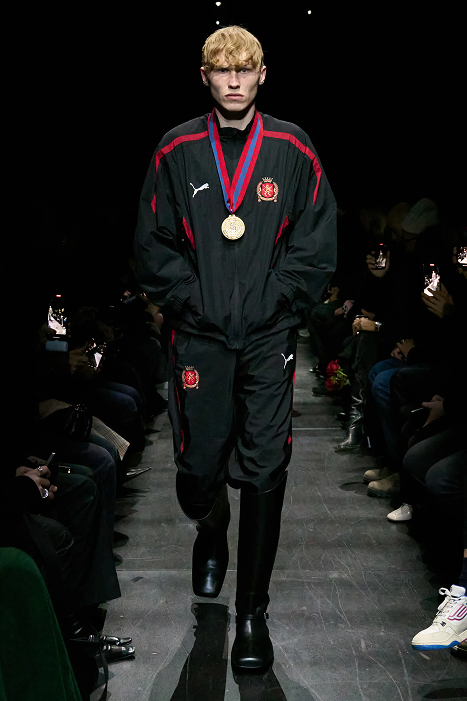 Гвасалия начал с нескольких офисных костюмов, некоторые из которых в свойственной ему манере были «рванными». Следом шли идеально сшитые однобортные пальто с активной линией плеча, еще дальше — деним, кожа, растянутый трикотаж. По мере развития гвасалиевской мысли мы приближались, пожалуй, к самим ярким и очевидным его героям: в рваных футболках и «вампирских» кардиганах, футуристических черных очках и безразмерных худи, высоких сапогах-чулках, халатах и платьях, созданных их кожи / меха / стеганого пуховика. Демна также показал целую секцию обтягивающих спортивных костюмов в сотрудничестве с Puma и украшенной «олимпийскими» медалями Balenciaga.