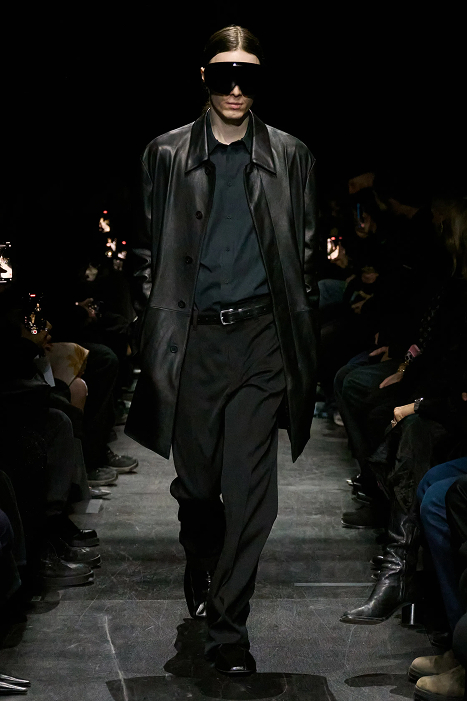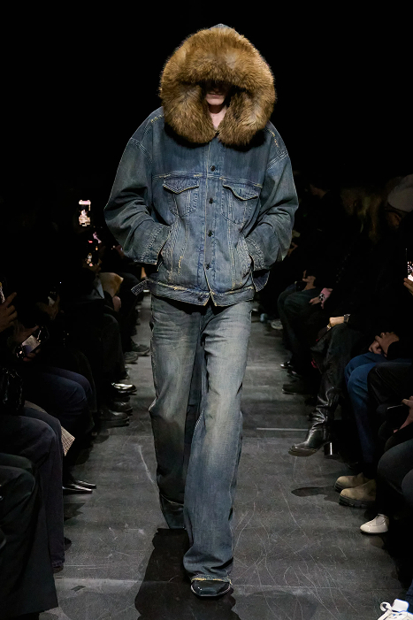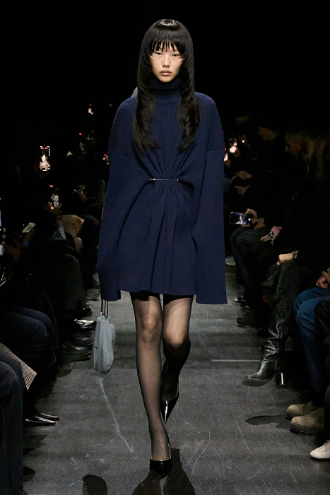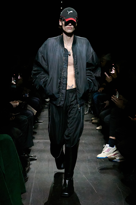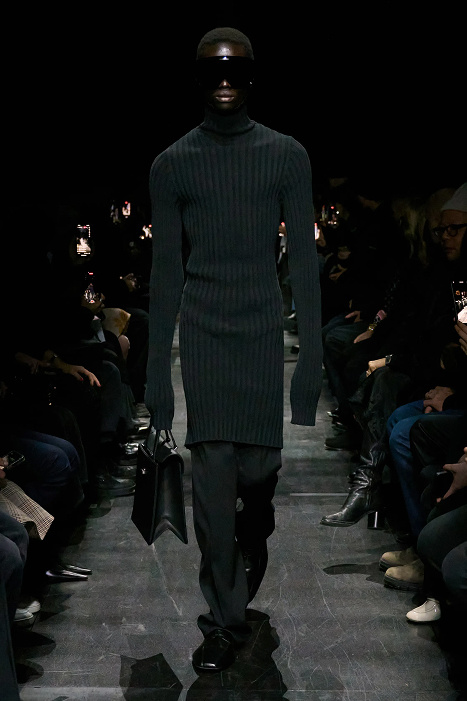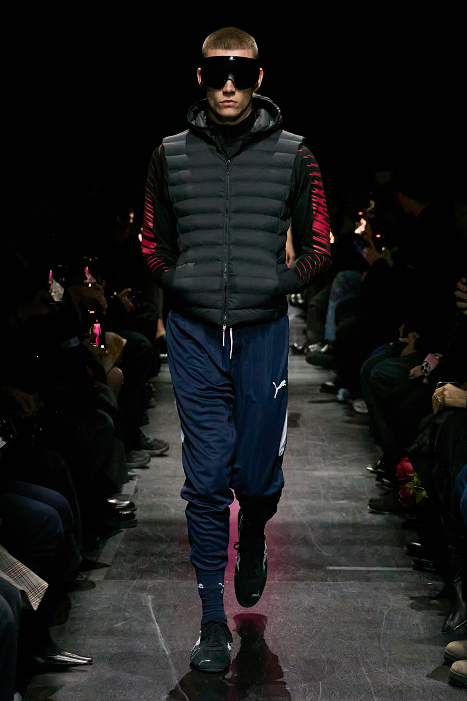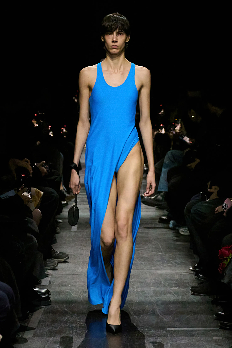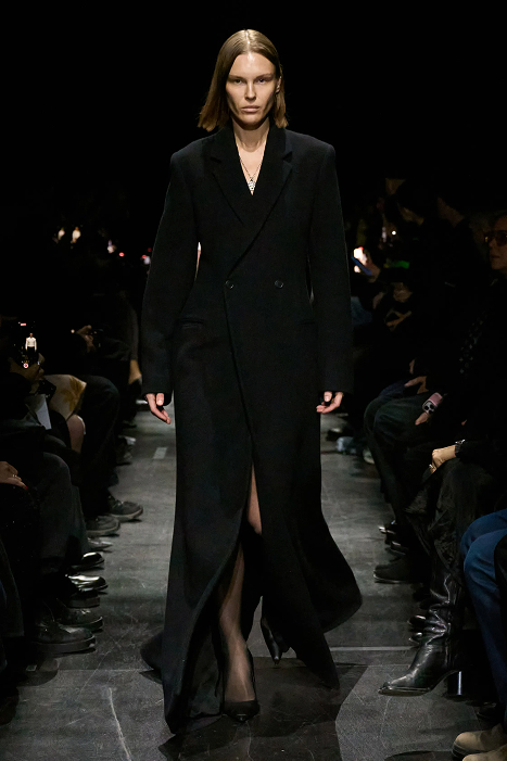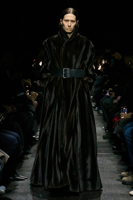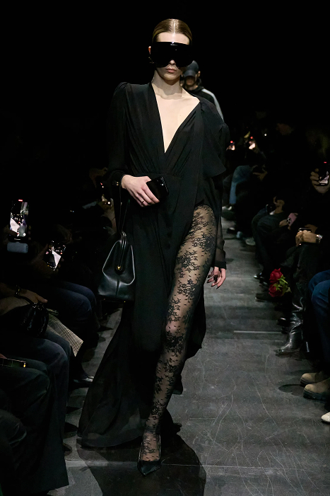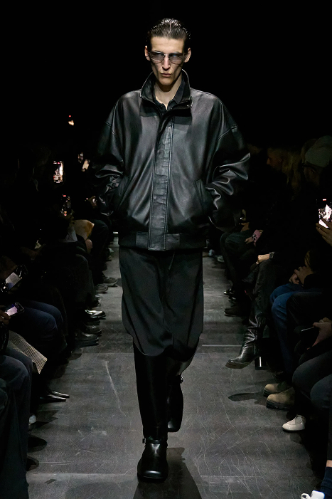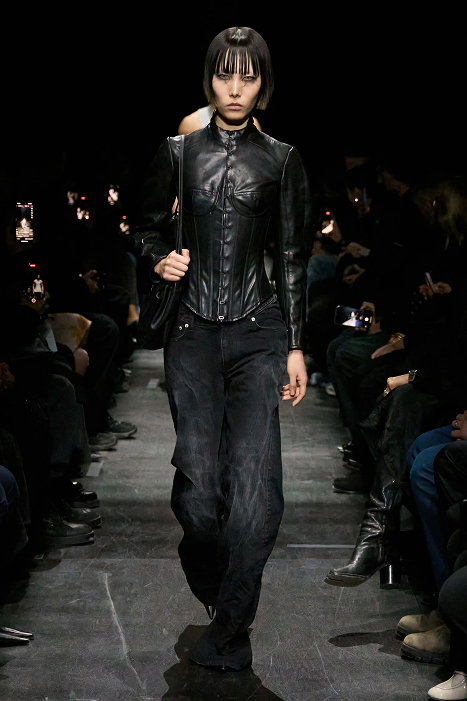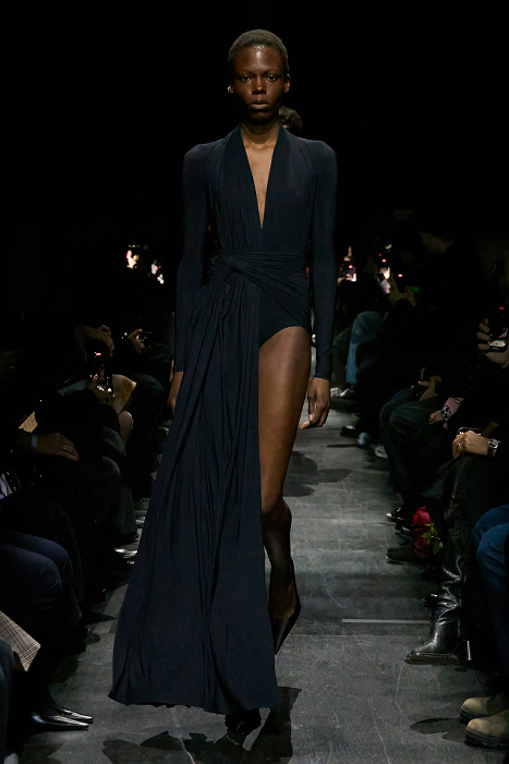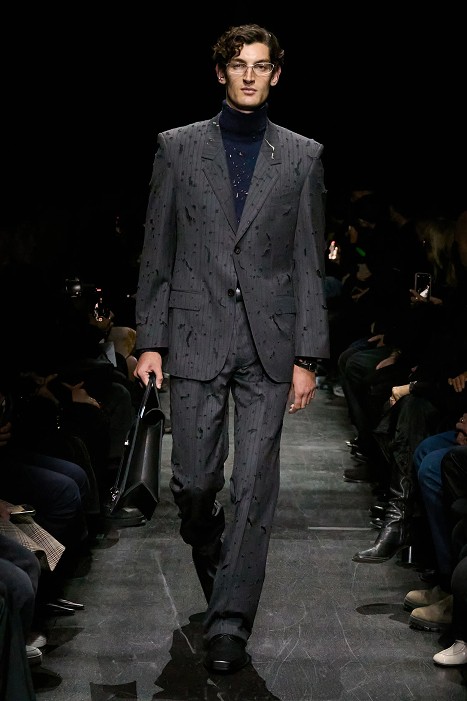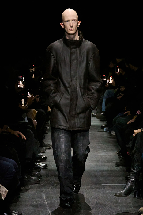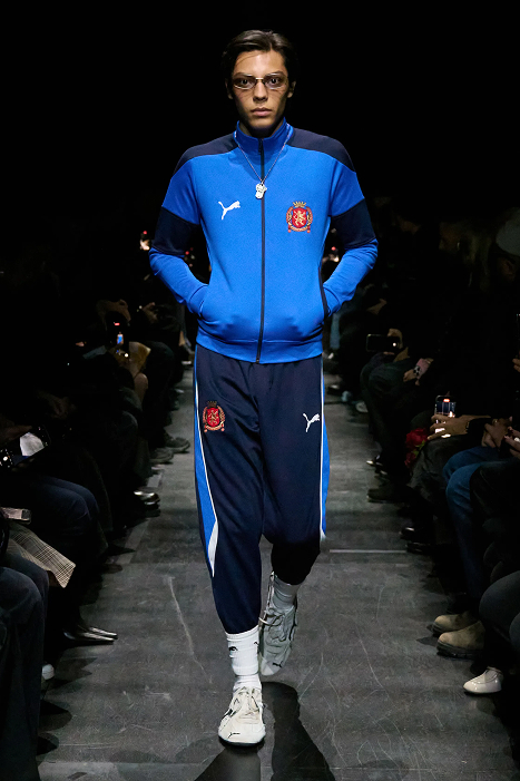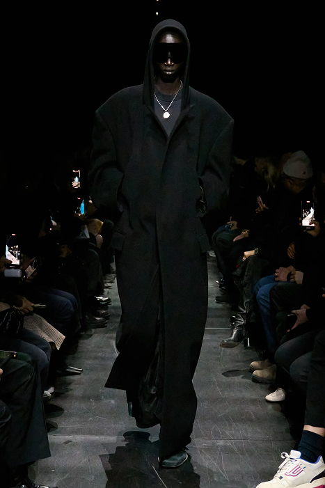 Гвасалия начал с нескольких офисных костюмов, некоторые из которых в свойственной ему манере были «рванными». Следом шли идеально сшитые однобортные пальто с активной линией плеча, еще дальше — деним, кожа, растянутый трикотаж. По мере развития гвасалиевской мысли мы приближались, пожалуй, к самим ярким и очевидным его героям: в рваных футболках и «вампирских» кардиганах, футуристических черных очках и безразмерных худи, высоких сапогах-чулках, халатах и платьях, созданных их кожи / меха / стеганого пуховика. Демна также показал целую секцию обтягивающих спортивных костюмов в сотрудничестве с Puma и украшенной «олимпийскими» медалями Balenciaga.