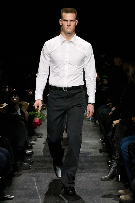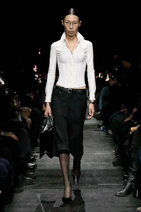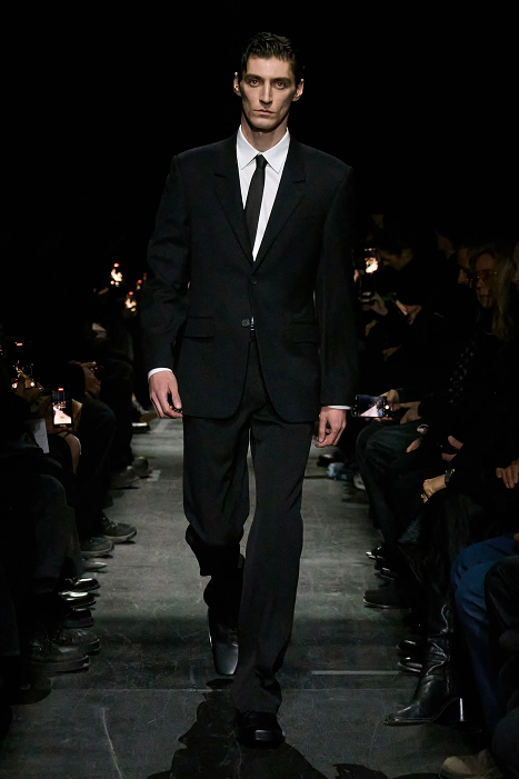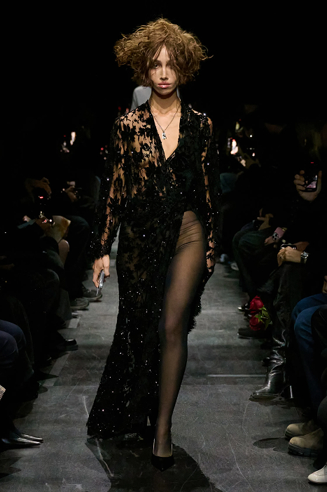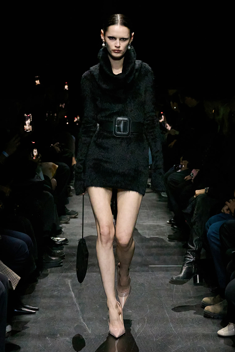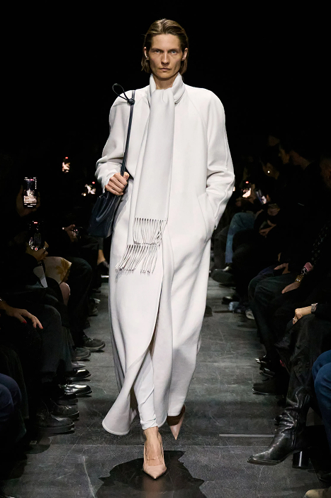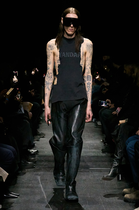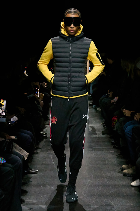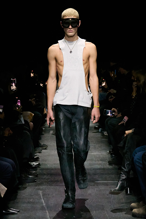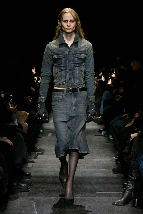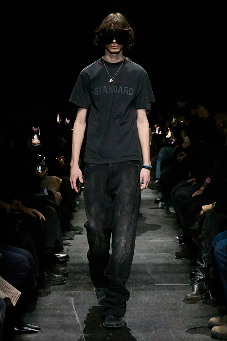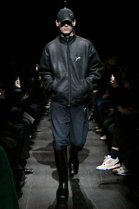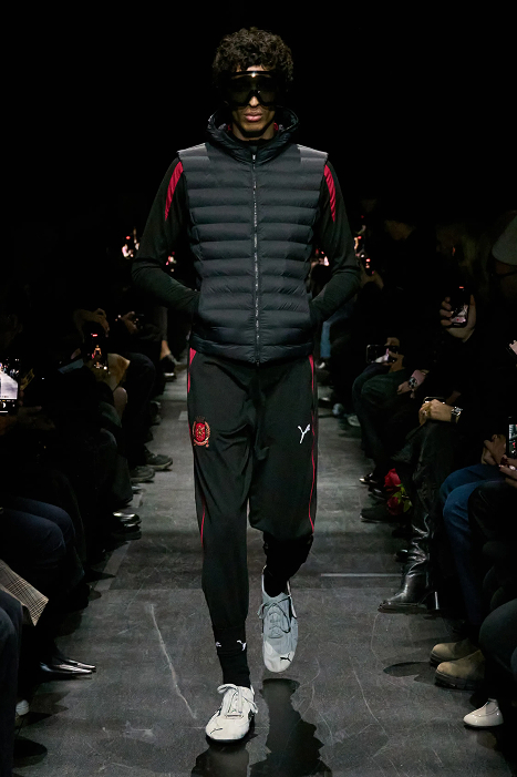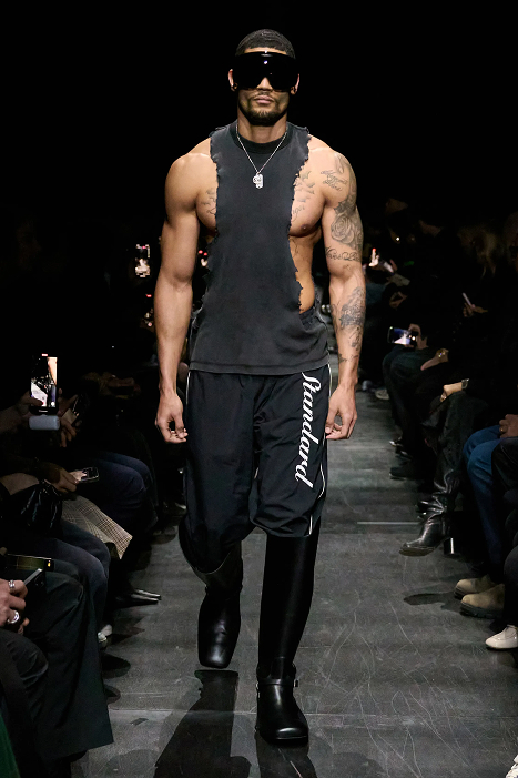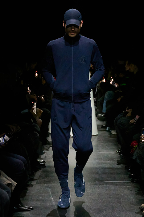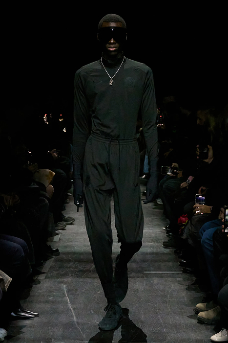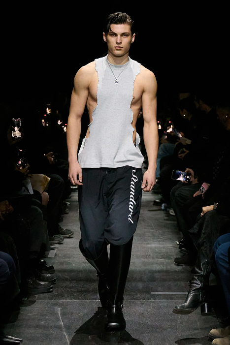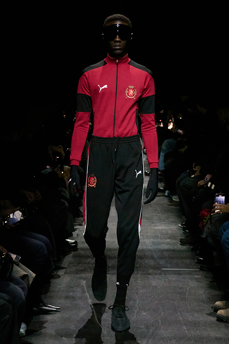 Гвасалия начал с нескольких офисных костюмов, некоторые из которых в свойственной ему манере были «рванными». Следом шли идеально сшитые однобортные пальто с активной линией плеча, еще дальше — деним, кожа, растянутый трикотаж. По мере развития гвасалиевской мысли мы приближались, пожалуй, к самим ярким и очевидным его героям: в рваных футболках и «вампирских» кардиганах, футуристических черных очках и безразмерных худи, высоких сапогах-чулках, халатах и платьях, созданных их кожи / меха / стеганого пуховика. Демна также показал целую секцию обтягивающих спортивных костюмов в сотрудничестве с Puma и украшенной «олимпийскими» медалями Balenciaga.