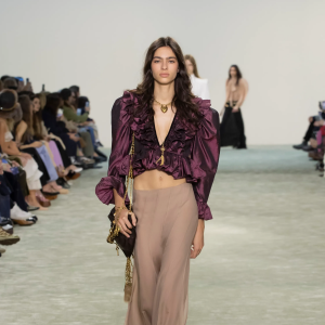 Так, увидели на шоу прямые кожные жакеты с изящными воротничками в паре с юбками-конфетти; удобные шаровары из шерсти и бомберы с «заниженной талией»; полупрозрачные блузоны, которые носили с трикотажными воротниками и асимметричные юбки с необработанными швами. Обратили внимание на кольчужные юбки и рыбацкие сапоги; отороченные мехом пальто, юбки, будто придуманные из повязанных вверх тормашками свитеров, и многослойные кейпы с покатыми плечами.