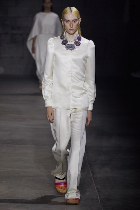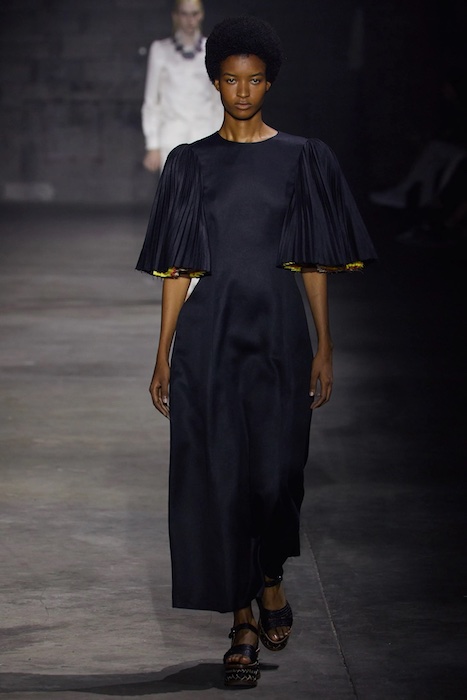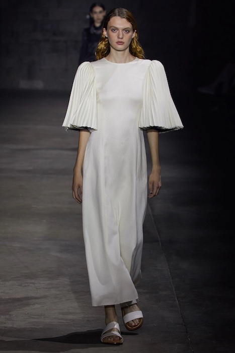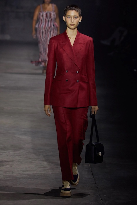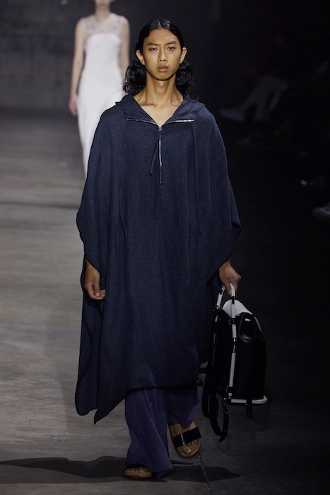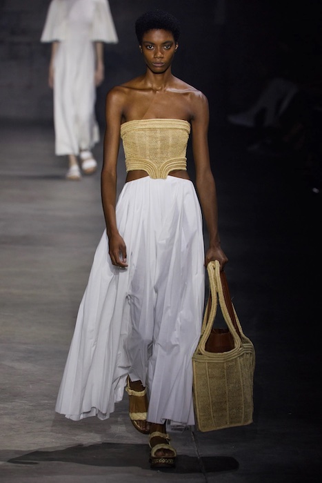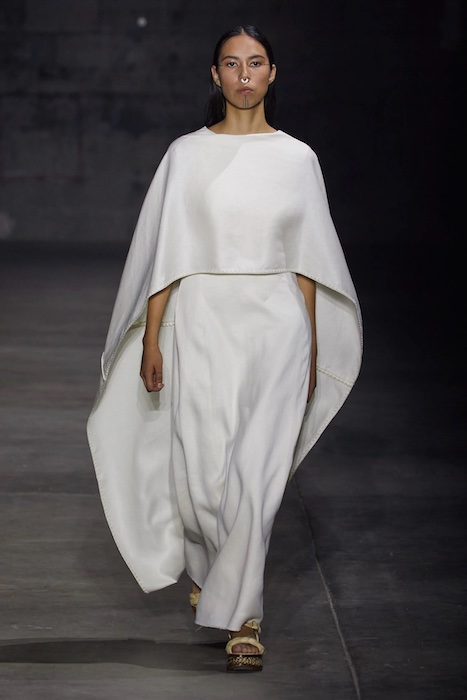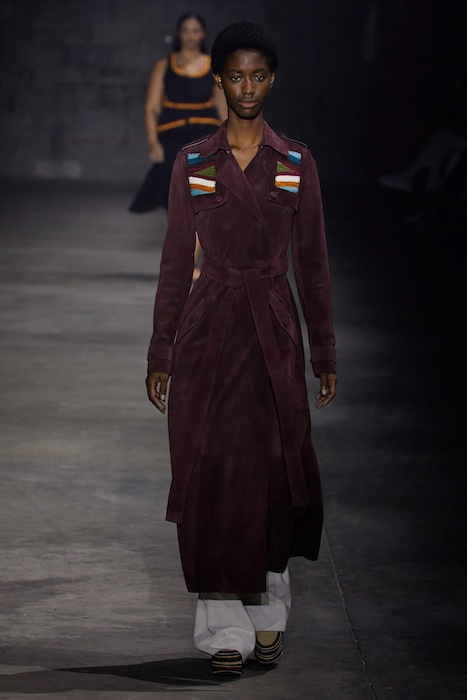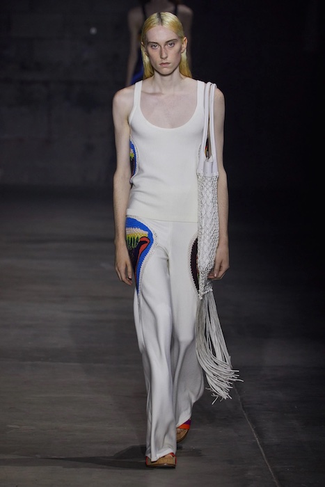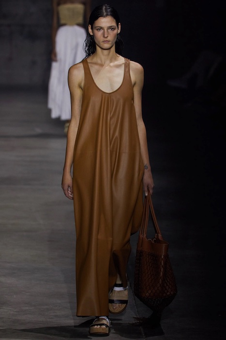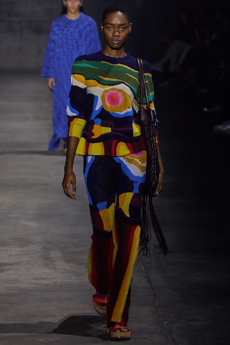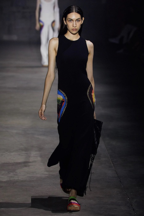 Из сезона в сезон дизайнер Габриэла Херст остается верна одним и тем же силуэтам и материалам: кожаные платья, пончо, вязаные комбинации, юбки с бахромой и лаконичные удобные костюмы. Вязаные платья c вышивками и гаучо-накидки бренд не первый год делает в сотрудничестве с организацией Manos del Uruguay, которая поддерживает рукодельниц из сельских районов Уругвая. Тканные вещи с традиционными узорами навахо создаются при помощи аналогичного некоммерческого проекта Madres & Artesanas Tex в Боливии. Принты и аппликации с лотосом сделаны на основе рисунков близкого друга Херст, а с ботинками и яркими сандалиями на подошве из экологичных материалов Габриэле помогал французский обувной дизайнер Робер Клержери.