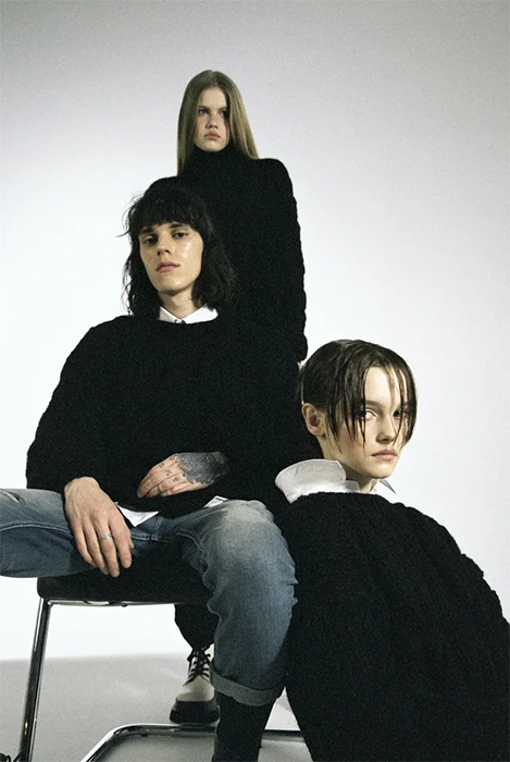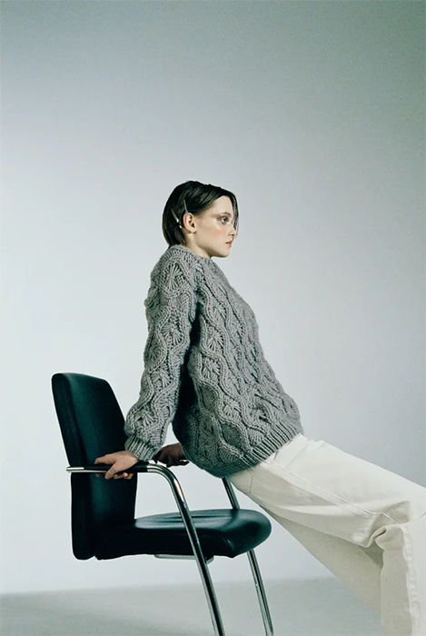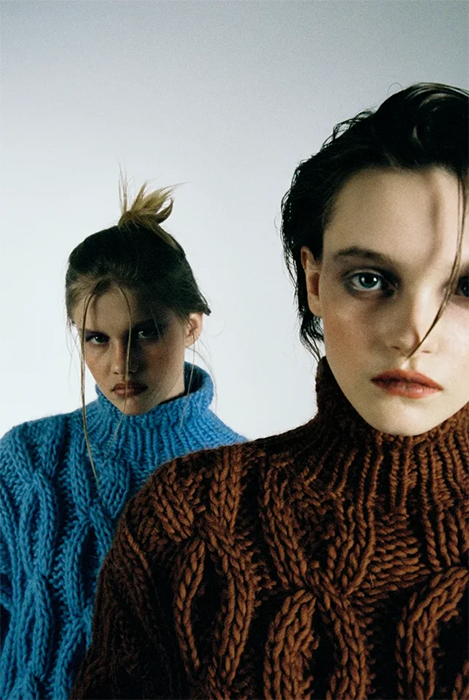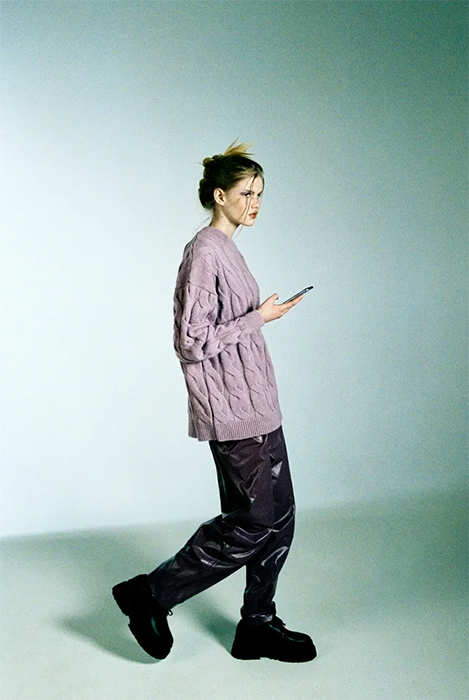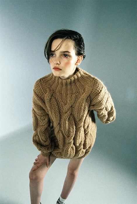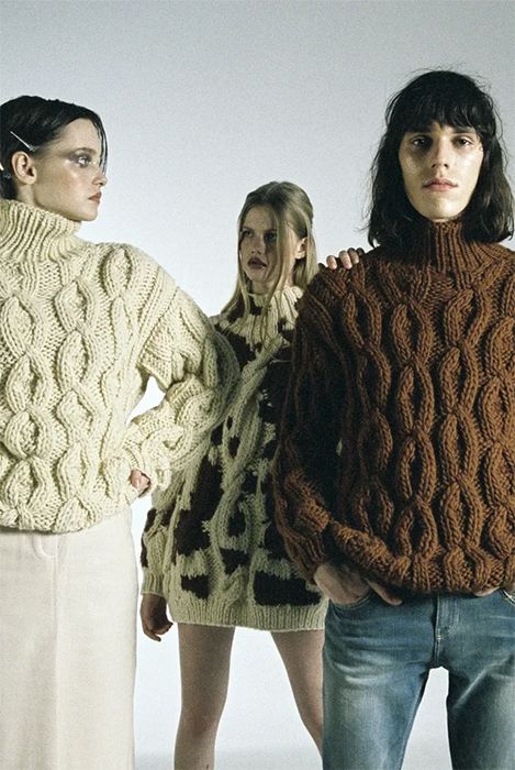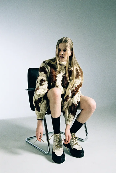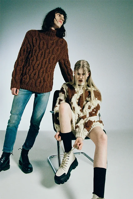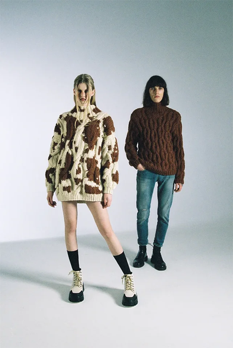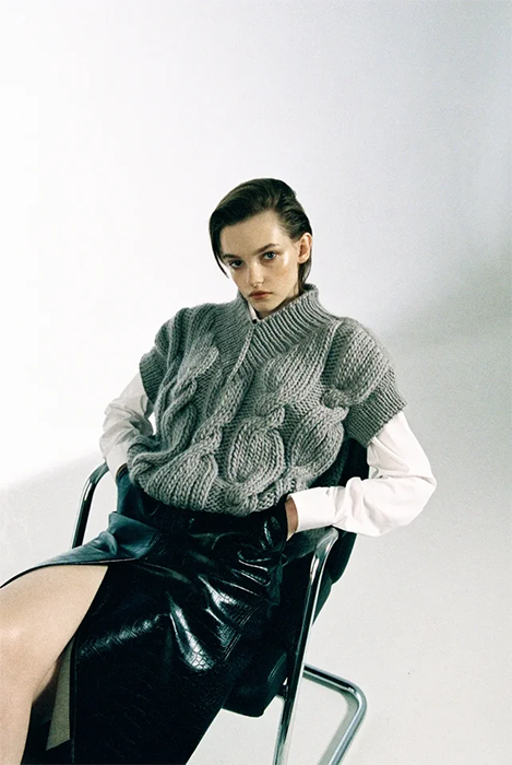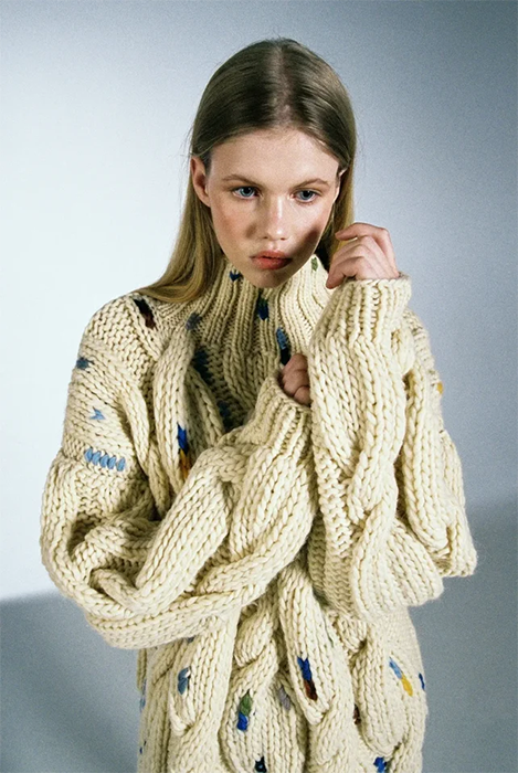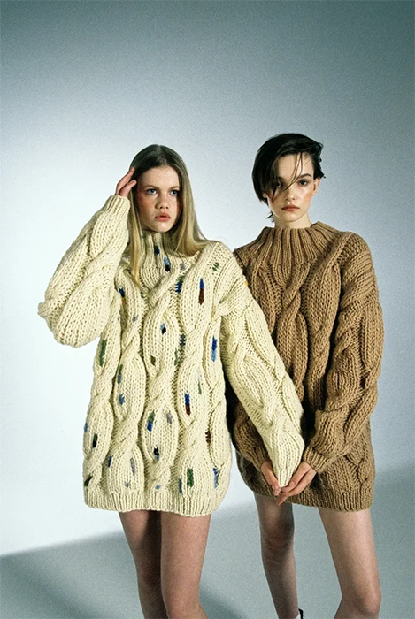 Специализацией российской марки Mirstores считаются связанные вручную свитеры. В новой коллекции они дополнены вышитыми цветными каплями и пятнистой расцветкой, как на коровьей шкуре. Также есть лаконичные комплекты фактурной вязки (с юбками мини и миди), брюки-бананы и прямые брюки из искусственной кожи. Все эти вещи бренд везет в Париж: во время Недели моды Mirstores будет представлен в шоуруме Dear Progress.