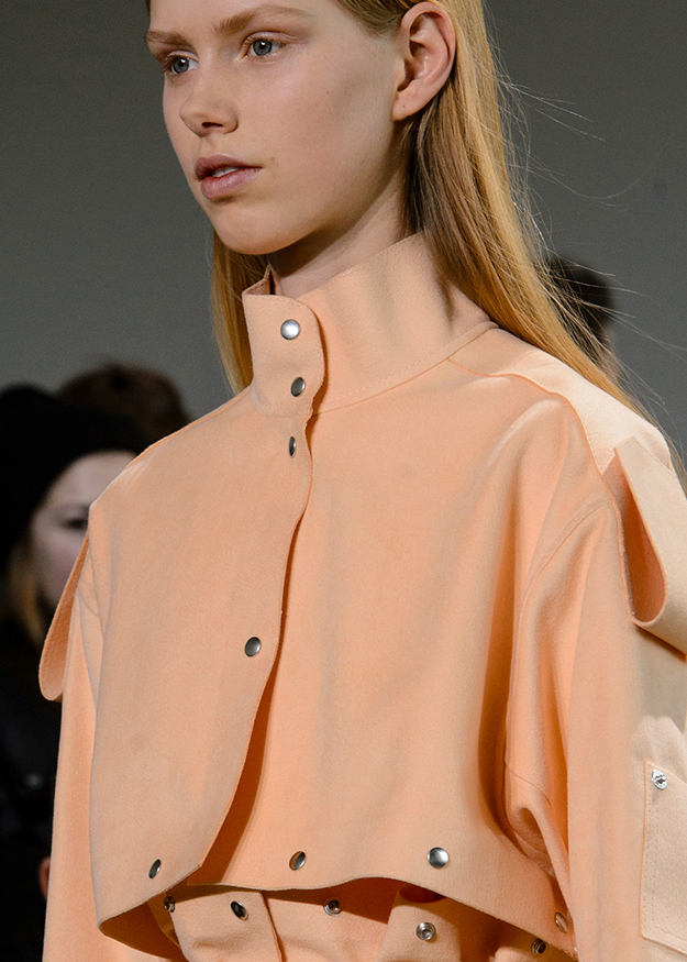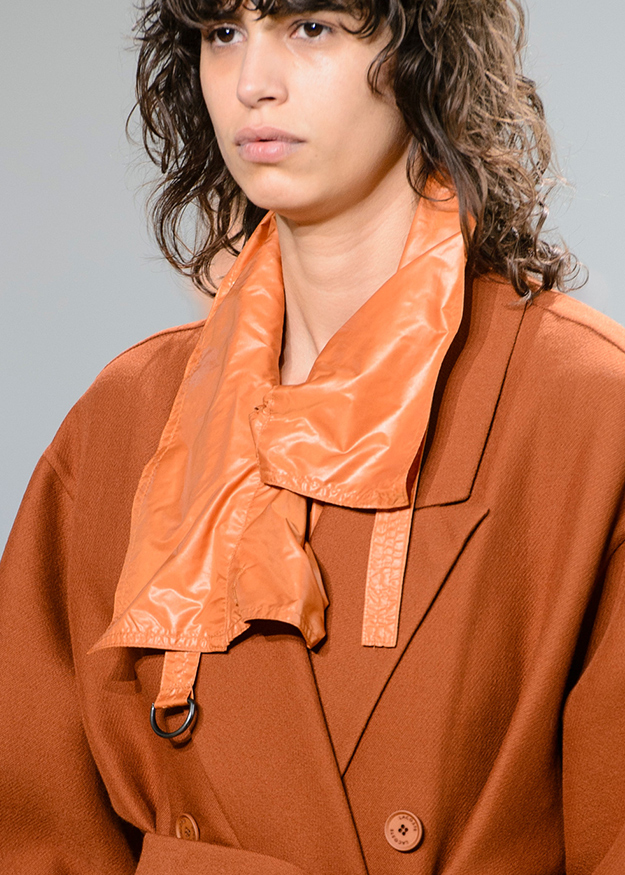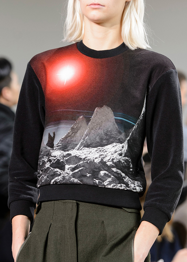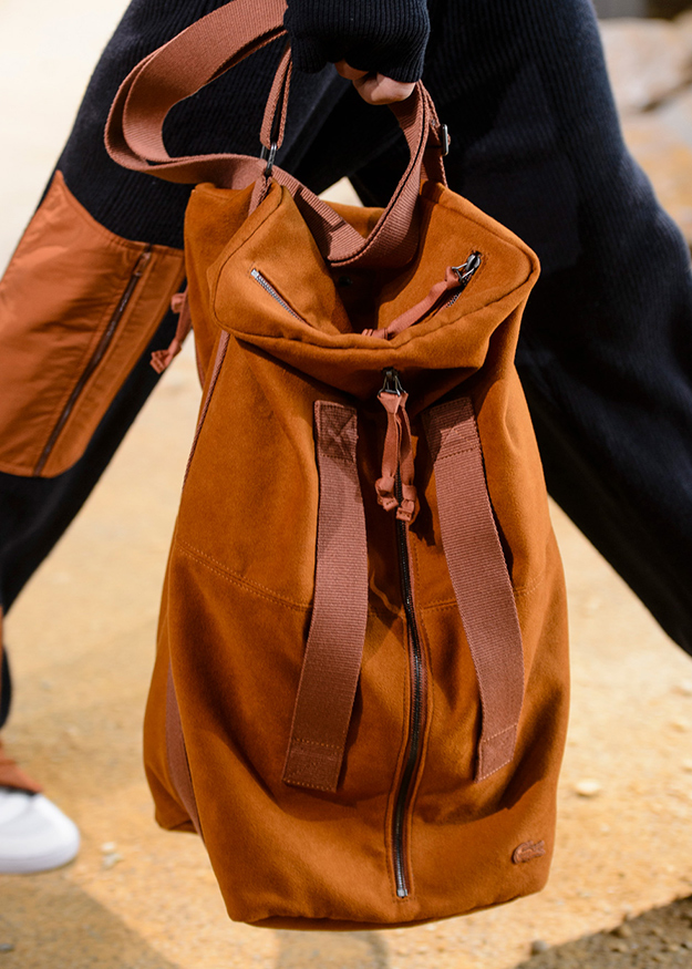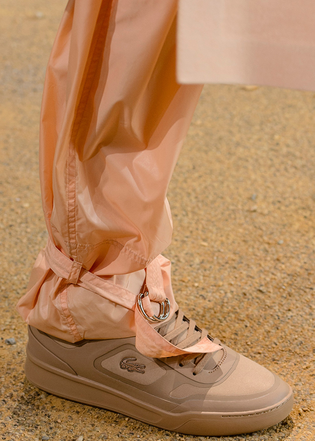 Кожаные плащи, комбинезоны как у механиков, дутые пуховики, анораки, брюки карго, сапоги из лакированой кожи, большие сумки и космические принты — все это в декорациях, напоминающих не то пустыню, не то Марс. Цветовая гамма в целом нейтральная, лишь с небольшими акцентами красного и фиолетового. Униформа для путешественников XXI века Фелипе Оливейра Баптиста была вдохновлена ретрофутуризмом и винтажной спортивной одеждой, что можно воспринимать как кивок в сторону теннисного наследия Lacoste.