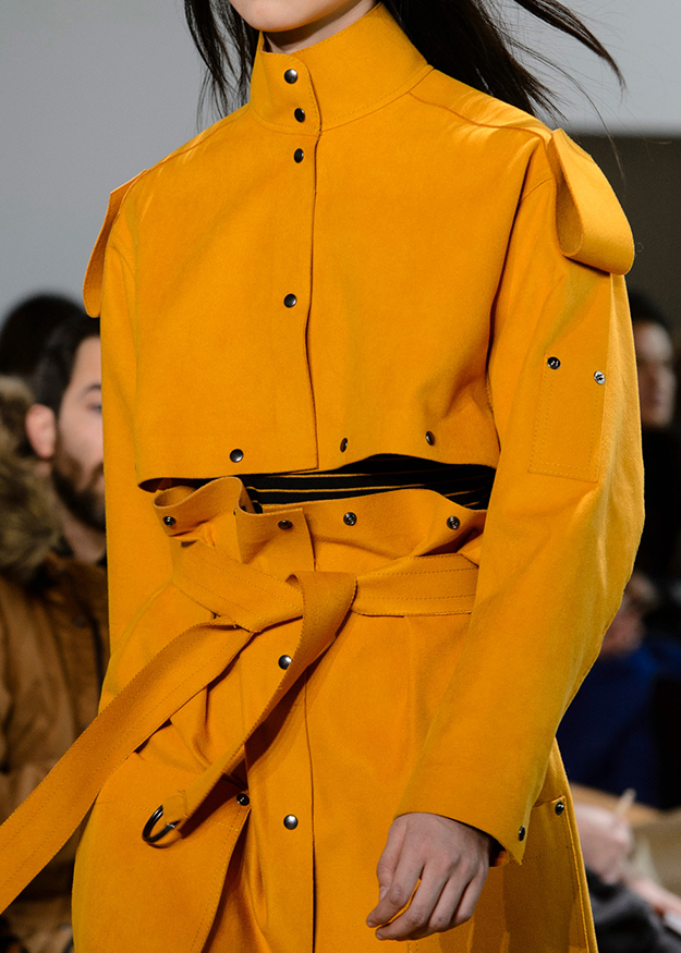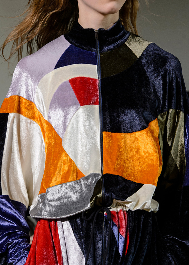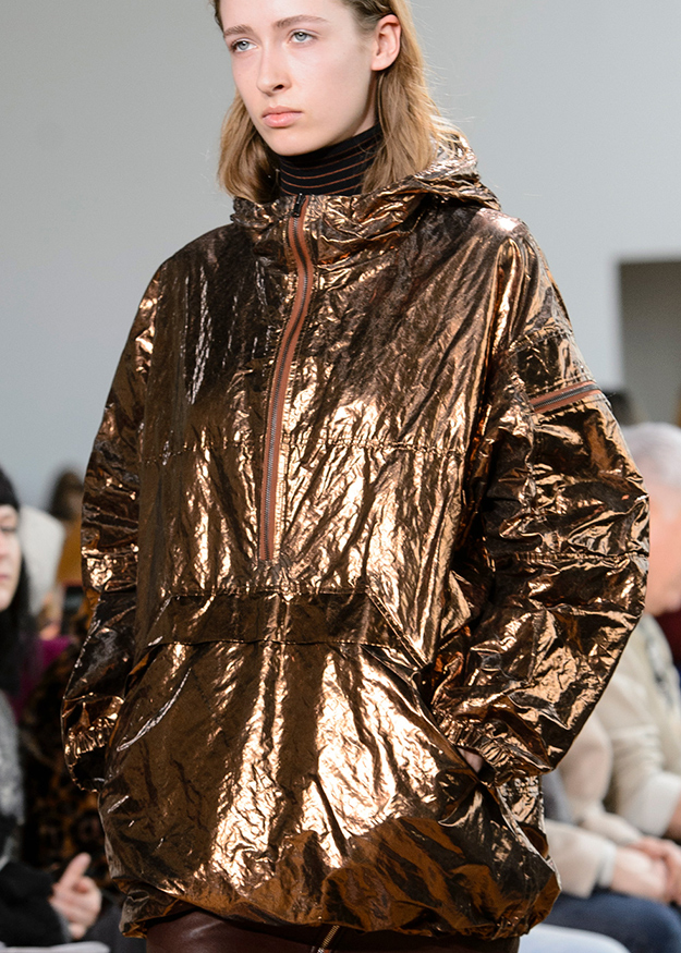 Основные элементы: кожаные плащи, комбинезоны свободного кроя, замшевые костюмы, блестящая куртка анорак, бархатные платья