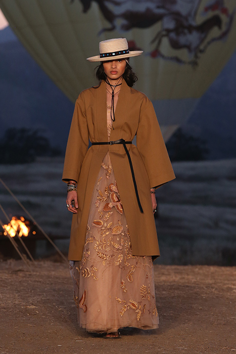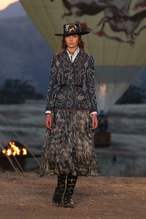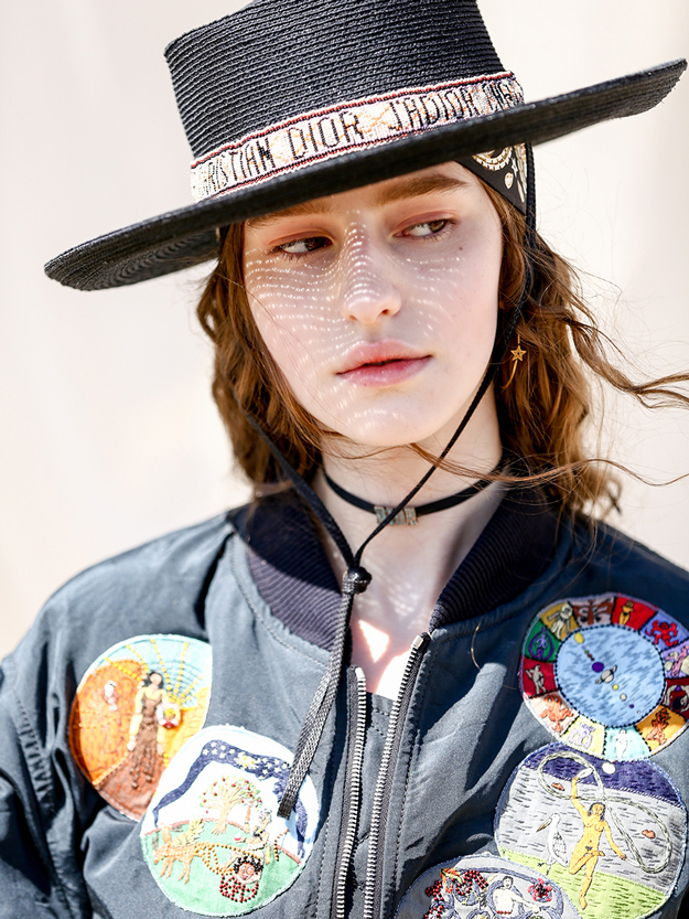 Круизную коллекцию Christian Dior креативный директор Мария Грация Кьюри представила в горах Санта-Моники. По словам дизайнера, коллекция посвящена связи женщины с природой. Отправная точка в мудборде — пещера Ласко, случайно открытая в 1940 году четырьмя подростками. В 1951 году Кристиан Диор выпустил коллекцию, вдохновленную наскальными рисунками из пещеры, а теперь этот ход повторила Кьюри. Дизайнер перенесла древние изображения на полупрозрачные платья в пол, вязаные накидки и шубы. В мудборде коллекции также есть работы художницы Джорджии О’Кифф и колода Таро женского начала, которую создали Карен Вогел и Вики Нобл. Каждый образ из коллекции дополнен шляпой — с изображением животного или расшитой камнями.