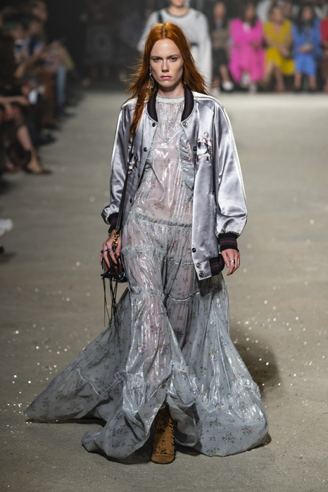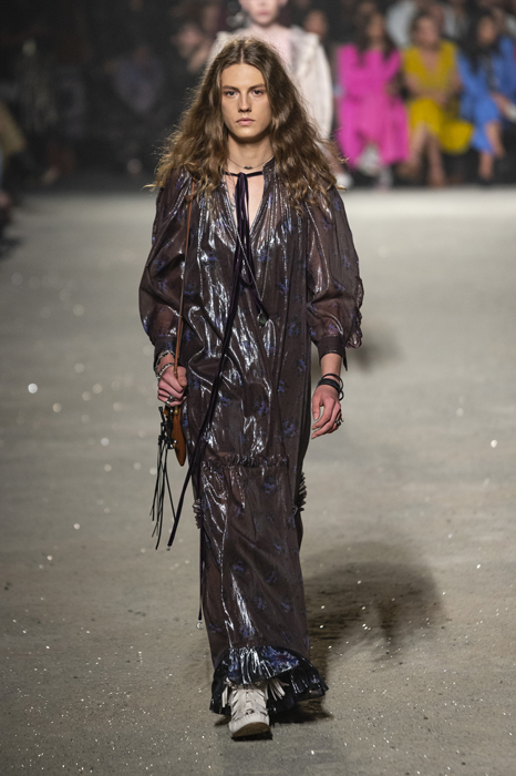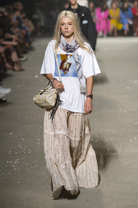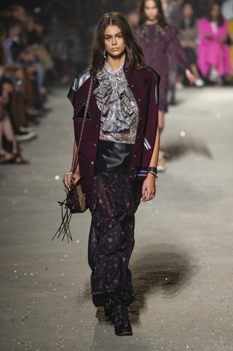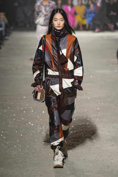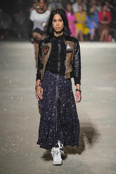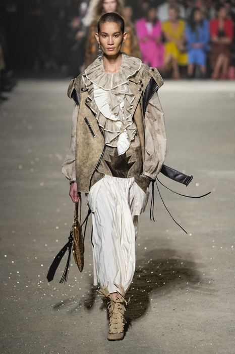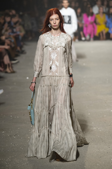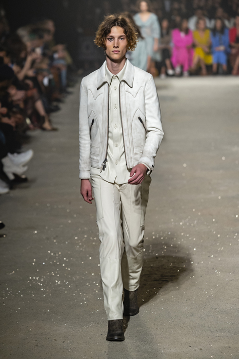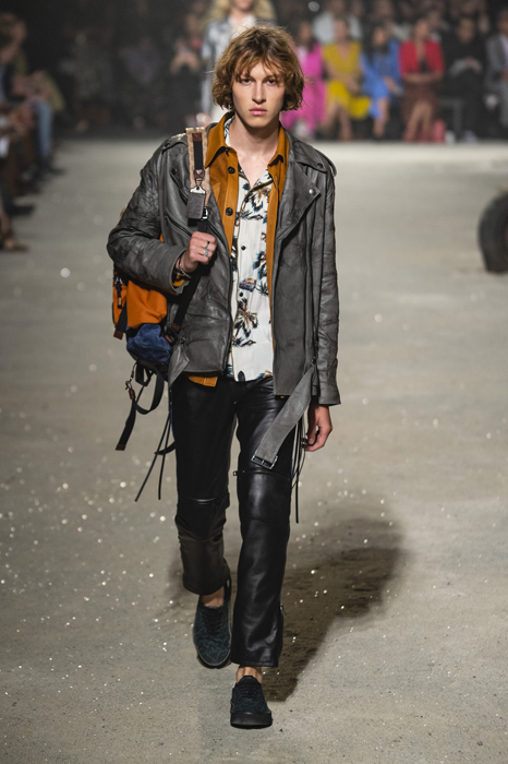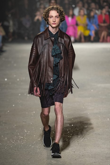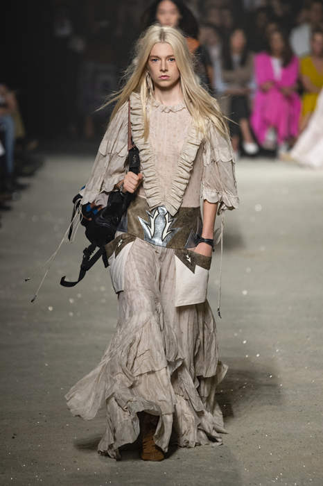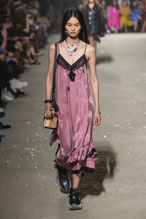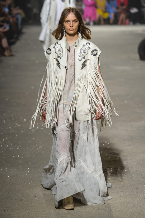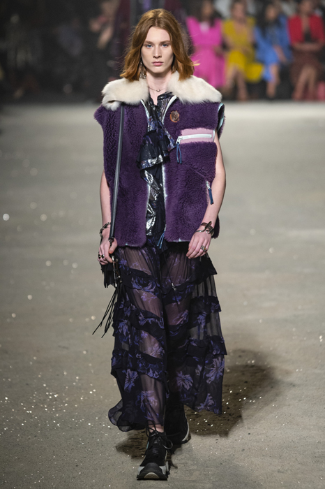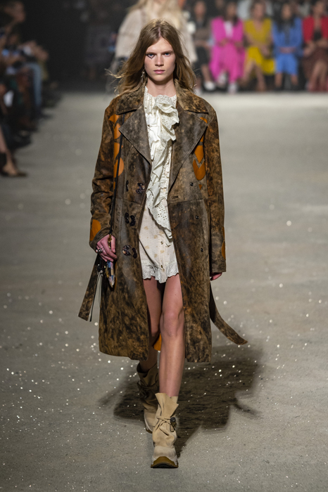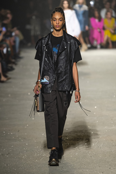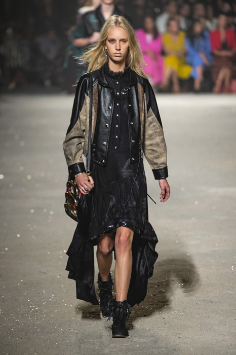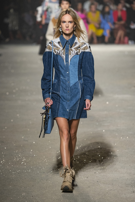 Ориентиром для весенне-летней коллекции Coach 1941 стал город Санта-Фе в штате Нью-Мексико: креативный директор бренда Стюарт Веверс пробыл в нем только 24 часа, но этого хватило, чтобы растащить атмосферу города на цитаты. Так получились пушистые жакеты, пародирующие флисовые куртки Patagonia, платья из переливающейся ткани в духе моды 1980-х и много кожаных вещей: сумки и рюкзаки с бахромой, жилеты и куртки, в которых легко представить себя героем автомобильного путешествия по Турквойсу или по крайней мере завсегдатаем бара The Matador в Санта-Фе.