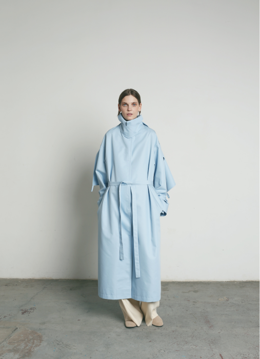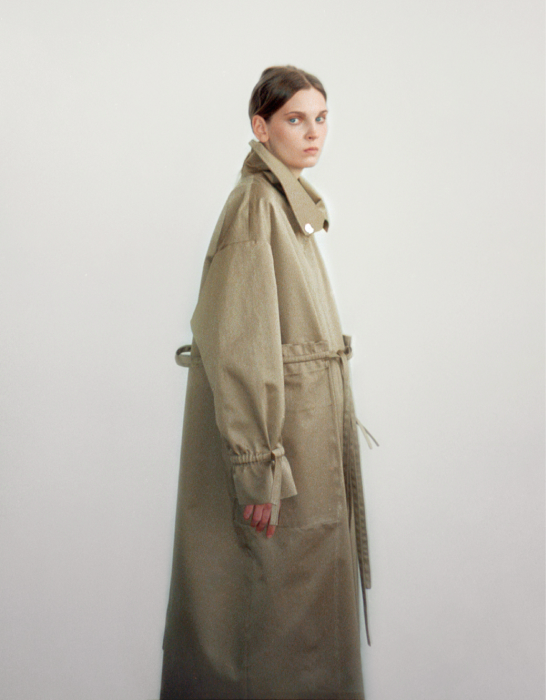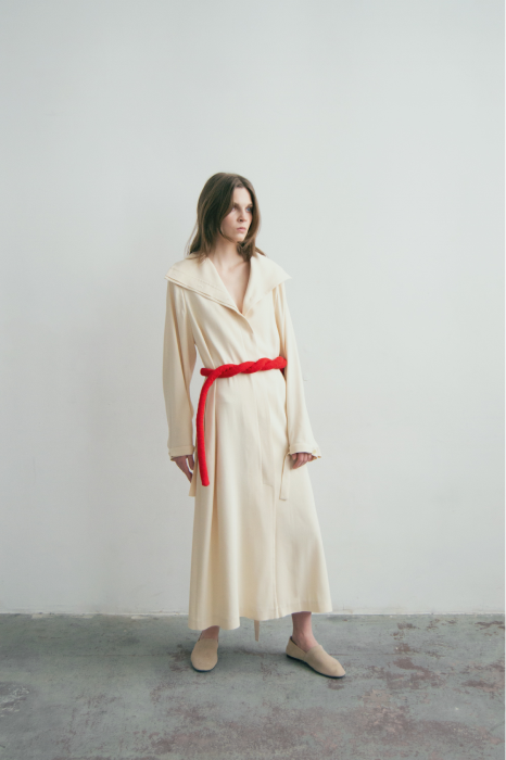 Весенняя коллекция дизайнера Татьяны Чернышевой родилась из образов «Летнего сада» Анны Ахматовой: с розами, плывущим лебедем, воображаемым скрипом корабельных мачт. Это свободное настроение передают шелковые платья с высоким воротником, которые «плывут» в движении, и куртки с поясом-жгутом. Несколько вещей декорированы толстой веревкой по краю — отсылка к морскому канату. У тренчкотов тоже много интересных деталей: отстегивающая кокетка, карманы на поясах-кулисках и высокий защитный воротник.