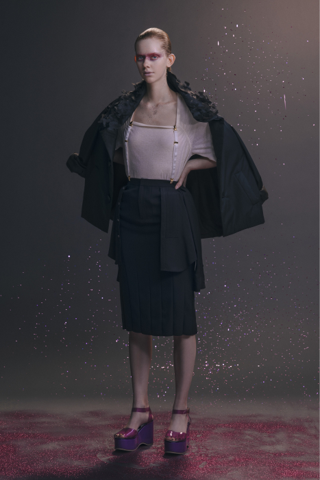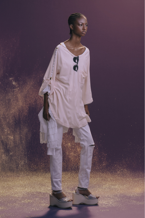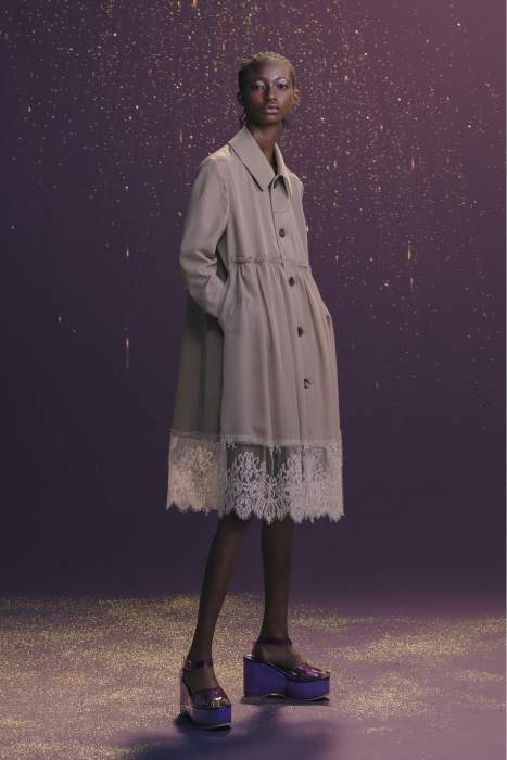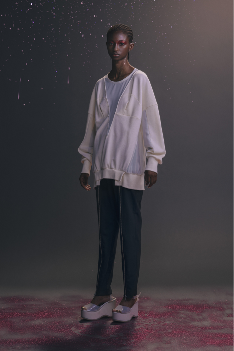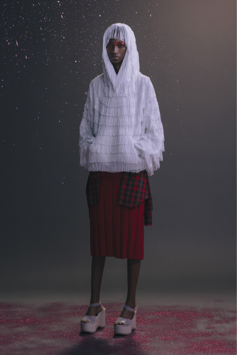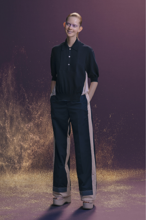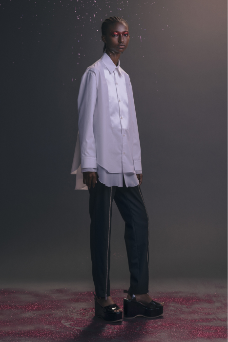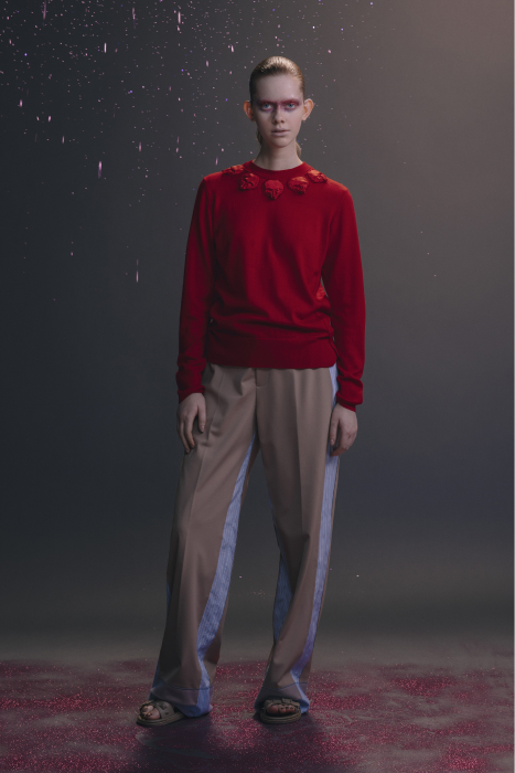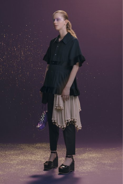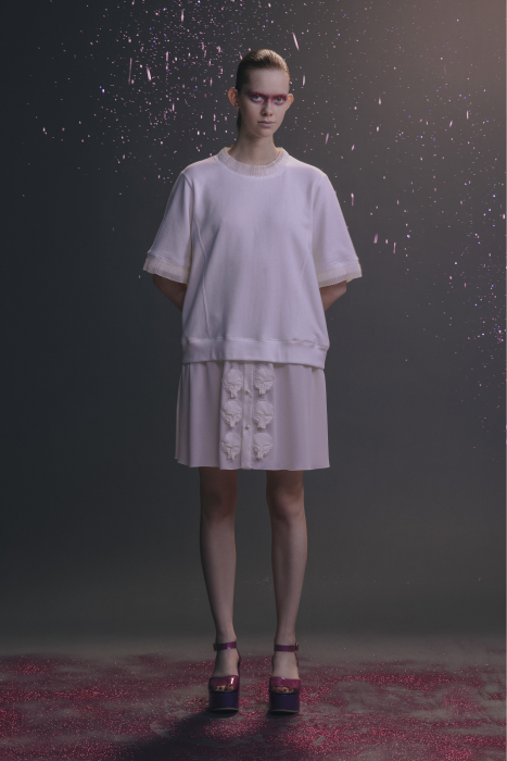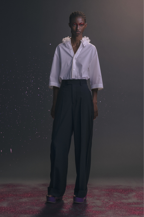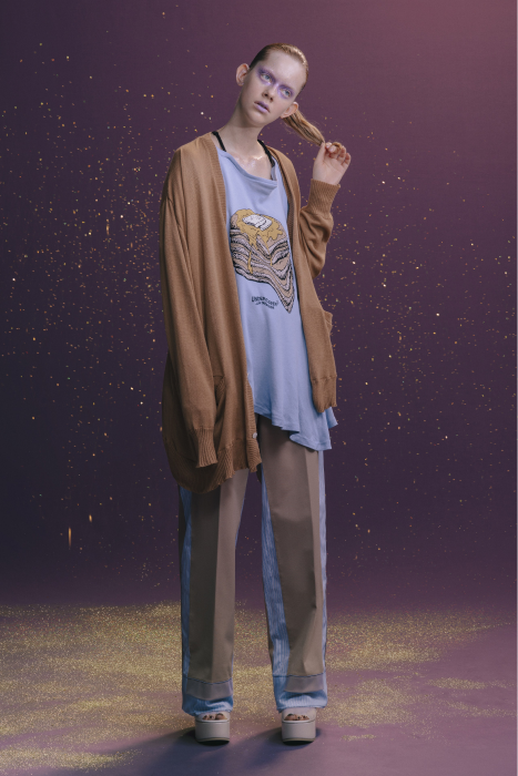 У Undercover никогда не было круизных коллекций. Сезон Resort 2023 — дебют Джуна Такахаши. По задумке дизайнера, межсезонные коллекции будут состоять из практичных вещей на каждый день — никакой театральности и необычных силуэтов, которые у Undecover часто встречаются на подиуме. Но даже «база» у Такахаши получается с характером. Воротник белой рубашки украшают шифоновые лепестки. Футболка расшита бисером. Белые толстовки с капюшоном декорированы сборками и бахромой. А брюки выглядят как гибрид офисных и пижамных. Еще есть бомберы с молниями по бокам, тренчкоты с кружевом и двухслойные кардиганы из шифона.