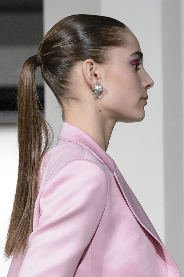 Прически и макияж: гладкие волосы, собранные в высокий хвост; яркие тени плюс розовая подводка