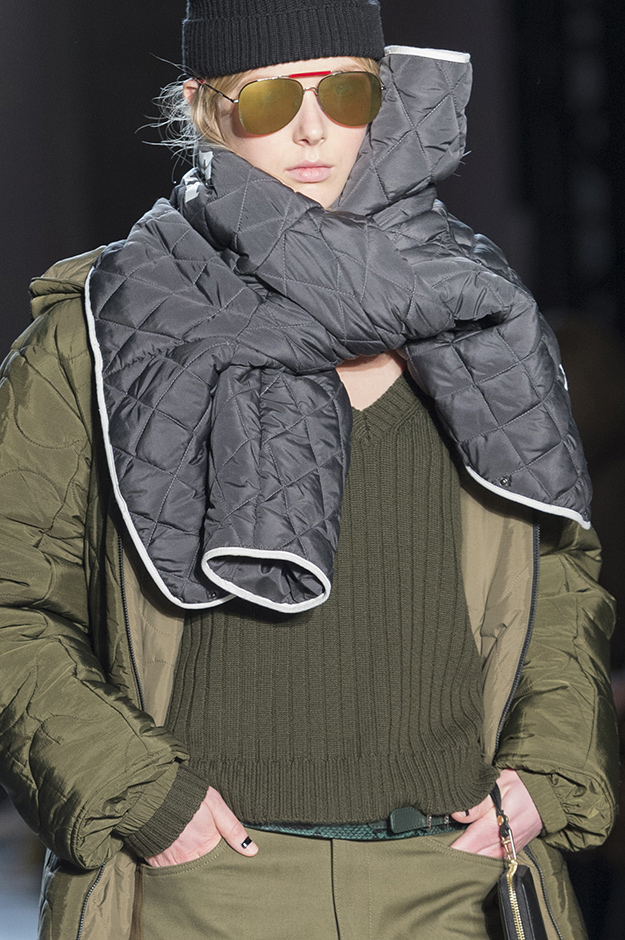 Стайлинговые приемы: многослойность, платья в бельевом стиле с брюками, стеганые куртки, повязанные вокруг шеи