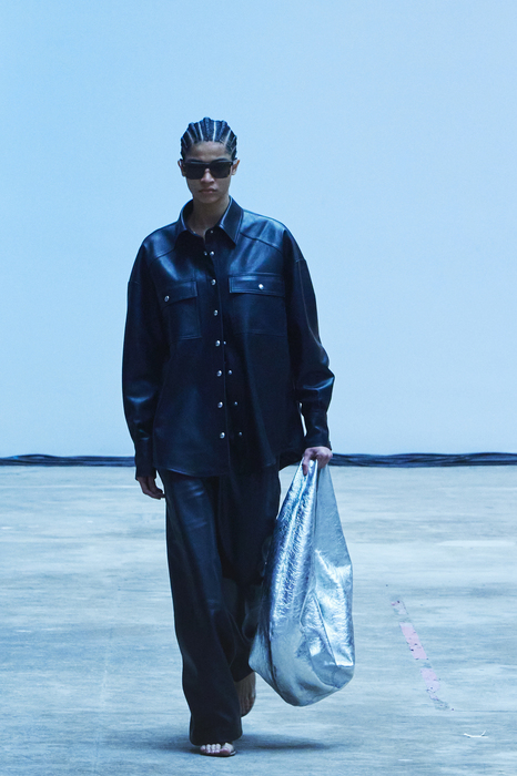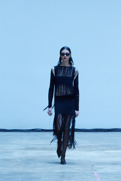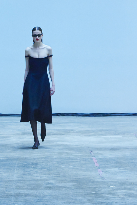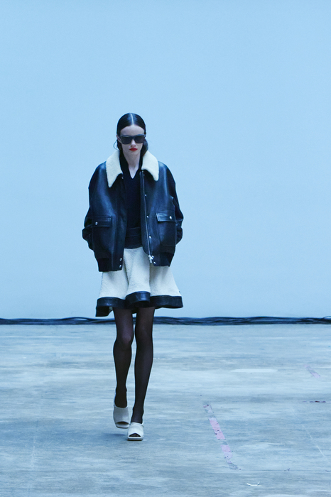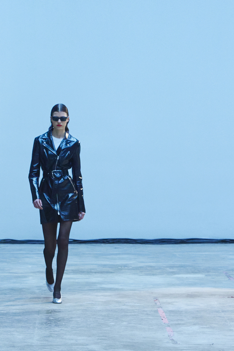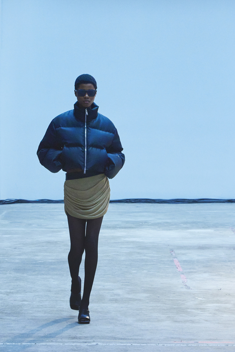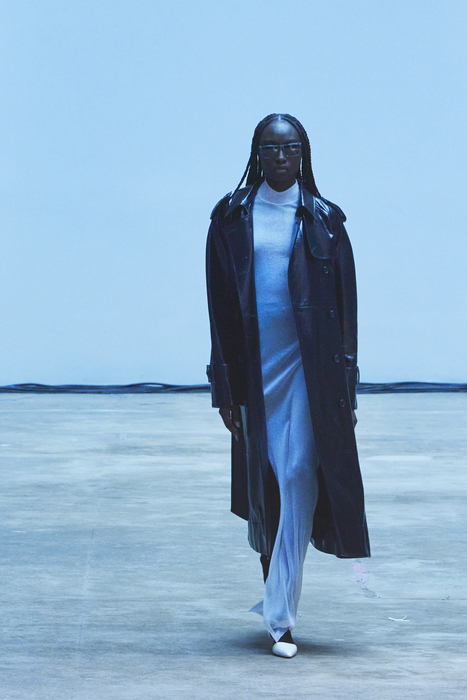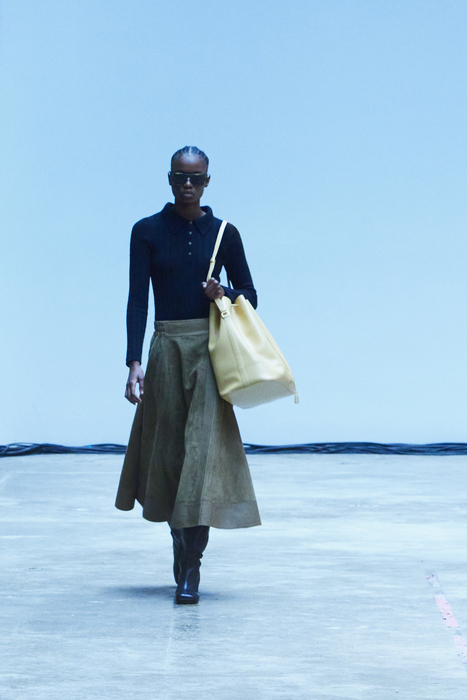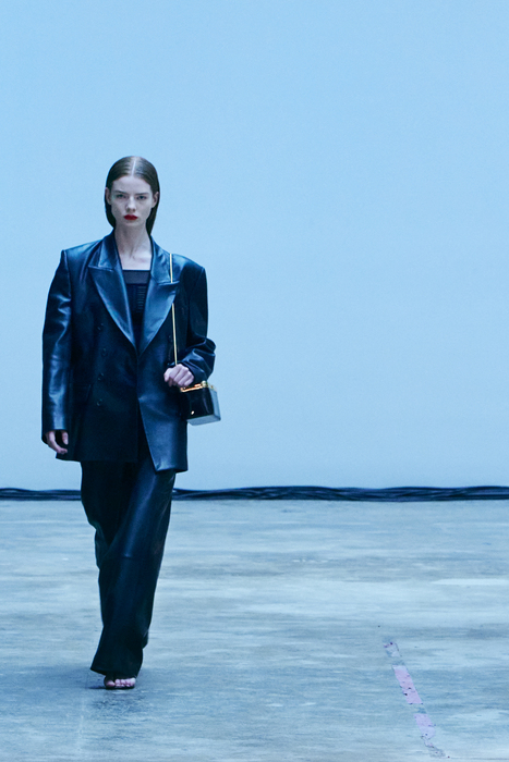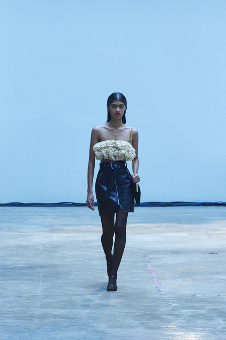 С первых коллекций Khaite дизайнер Кэтрин Гольдштейн работает с кожей. И в сезоне осень-зима 2022 важное место отводится именно этому материалу: из него сделаны плащи, топы, «рабочие» рубашки, юбки на высокой талии и куртки, вдохновленные гардеробом героини Эммануэль Сенье в фильме «Неистовый» 1988 года. Грубые вещи контрастируют с нежными: кожаные юбки на показе носили c топами из слоев тюля, под плащами и кожанками можно было увидеть прозрачные трикотажные платья и легкие мини в драпировках. Также в коллекцию вошли объемные бархатные пуховики, платья целиком из бахромы и блузки, декорированные узлами.