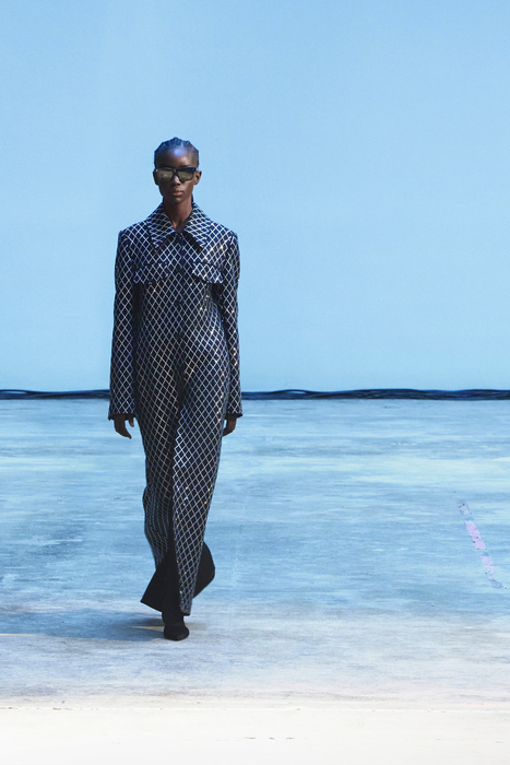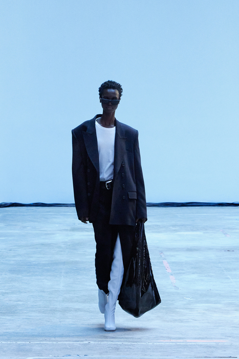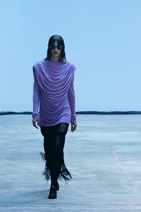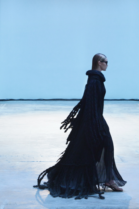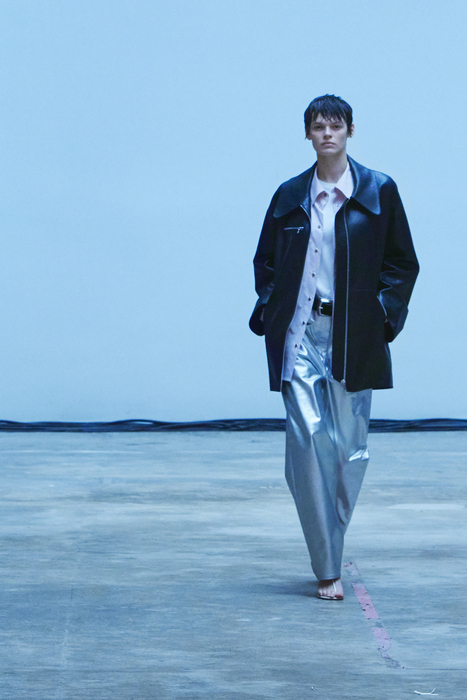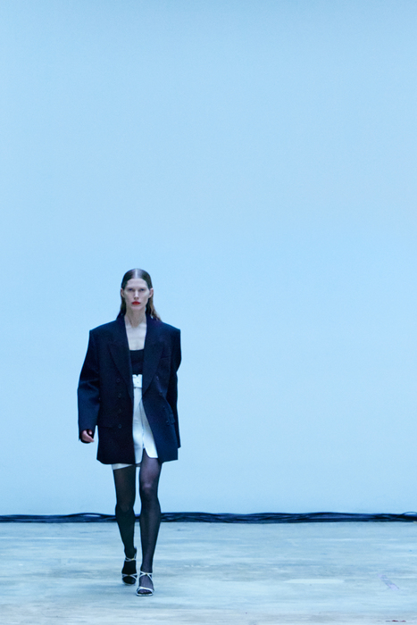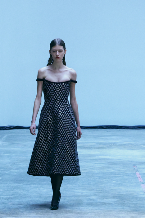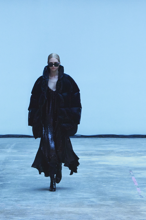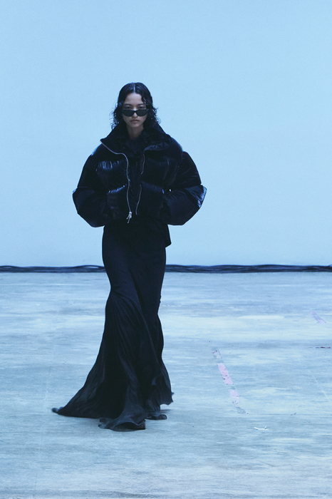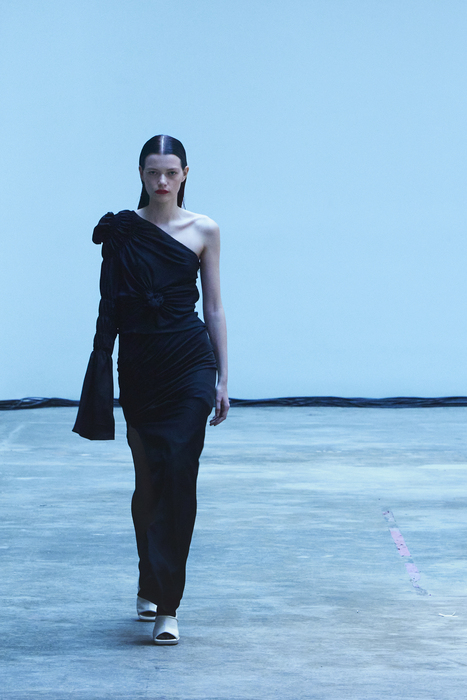 С первых коллекций Khaite дизайнер Кэтрин Гольдштейн работает с кожей. И в сезоне осень-зима 2022 важное место отводится именно этому материалу: из него сделаны плащи, топы, «рабочие» рубашки, юбки на высокой талии и куртки, вдохновленные гардеробом героини Эммануэль Сенье в фильме «Неистовый» 1988 года. Грубые вещи контрастируют с нежными: кожаные юбки на показе носили c топами из слоев тюля, под плащами и кожанками можно было увидеть прозрачные трикотажные платья и легкие мини в драпировках. Также в коллекцию вошли объемные бархатные пуховики, платья целиком из бахромы и блузки, декорированные узлами.