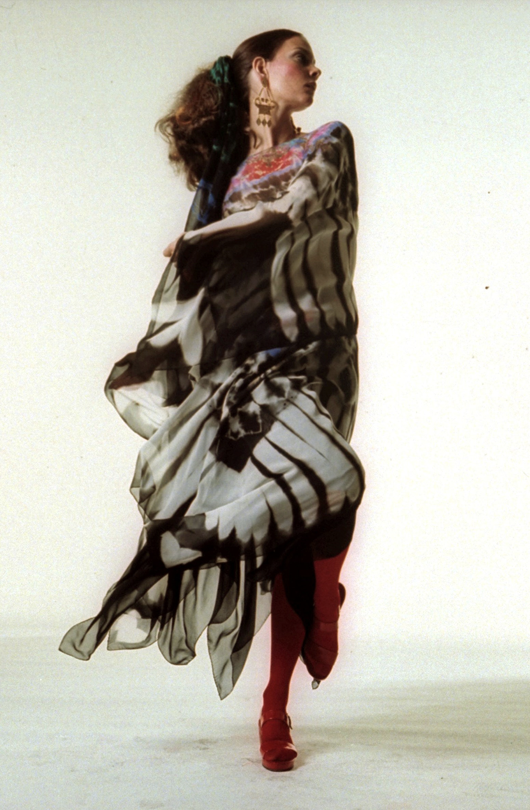 Даже хиппи-кафтаны у Холстона выглядели как вечерние платья. Он шил их из дорогих тканей и все так же кроил под углом в 45 градусов, чтобы вещь струилась по фигуре. В 1970 году вышла его знаменитая коллекция с кафтанами, окрашенными в технике тай-дай. В сериале «Холстон» художница по костюмам Джериана Сан-Хуан воссоздала по архивам Vogue и музейным экспонатам десять тай-дай-вещей из этой коллекции. Среди них будет один оригинальный Halston.
