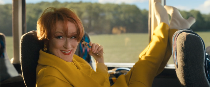 Костюмами в «Выпускном» заведовала Лу Эйрич, постоянный соавтор Райана Мерфи, которая одевала героев «Рэтчед», «Позы» и «Американской истории преступлений» об убийстве Джанни Версаче. Придумывая образы для бродвейских звезд, Лу ориентировалась на афишу мюзикла, по которому поставлен фильм — много, очень много блёсток, а также малиновый, изумрудный, бирюзовый и ярко-фиолетовый цвета. В эти же оттенки облачили героев для первой групповой сцены. На героине Мэрил Стрип — аметистовый костюм с кейпом. Кидман в роли уволившейся артистки кордебалета носит изумрудное мини в пайетках. Корден — ярко-голубой смокинг с кристаллами, Эндрю Рэннеллс — малиновую униформу бармена. В яркие вещи этих персонажей будут одевать на протяжении почти всего фильма. К примеру, по дороге в Индиану Ди Ди Аллен, тщеславная героиня Мэрил Стрип, вальяжно восседает в автобусе в ярко-желтом костюме Valentino (логотип бренда внимательный зритель на протяжении всего фильма увидит не один раз), а на школьное собрание она заявляется в красной накидке с мехом — в забытом богом городке такой кричащий гардероб выглядит особенно абсурдно. Режиссер и художница по костюмам нарочно акцентируют пропасть между буднями Среднего Запада и гламуром Бродвея.