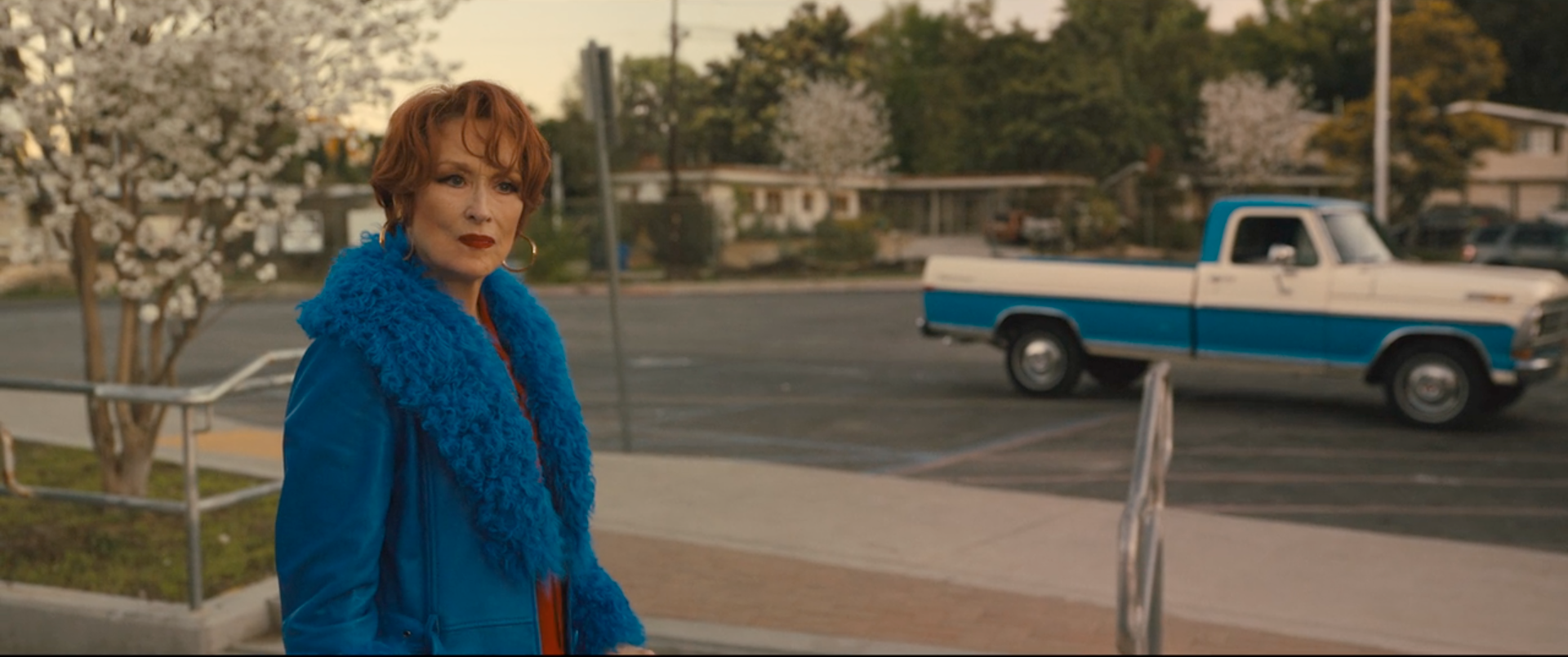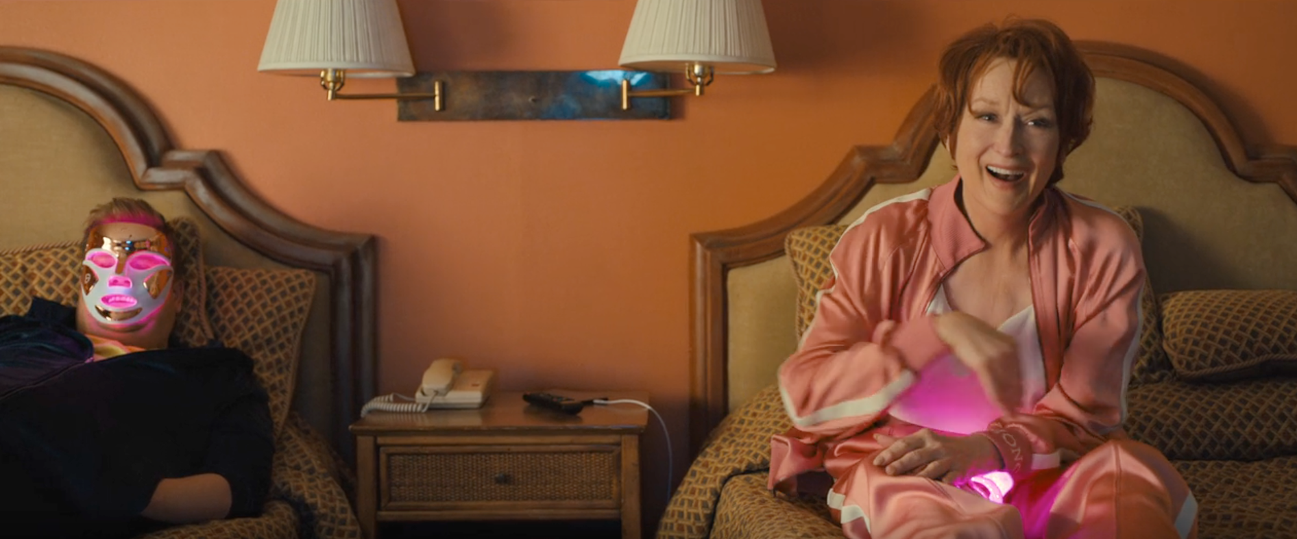 На костюмы Мэрил Стрип пришлось больше всего усилий. Фиолетовый комплект с кейпом красили вручную, потому что не могли найти шифон подходящего блеска и оттенка, а затем расшивали блестками четыре дня подряд. Ди Ди Аллен всегда должна выглядеть ослепительно — как мы узнаем позже, именно эта жесткая дисциплина и преданность выдуманному образу когда-то привела ее, девушку из бедной семьи, к успеху. Она строга к себе и не дает поблажек ни в чем: даже когда дива отдыхает в отельном номере с телевизором и в светодиодной маске, на ней роскошный спортивный костюм Moncler из розового атласа.