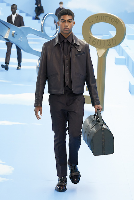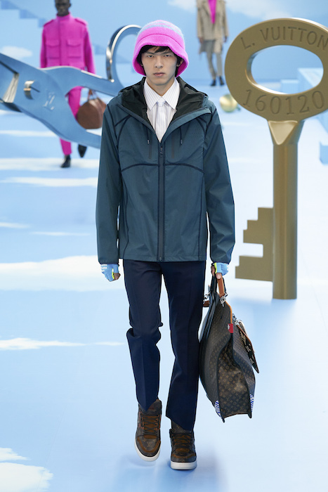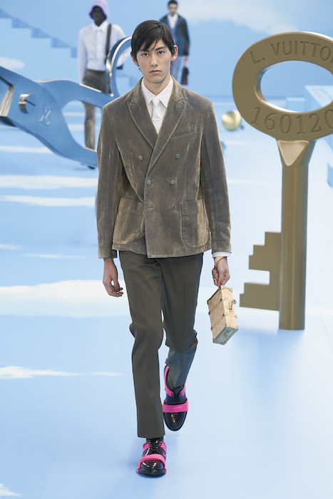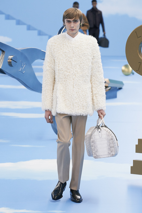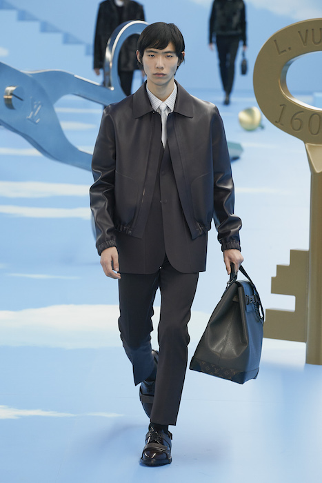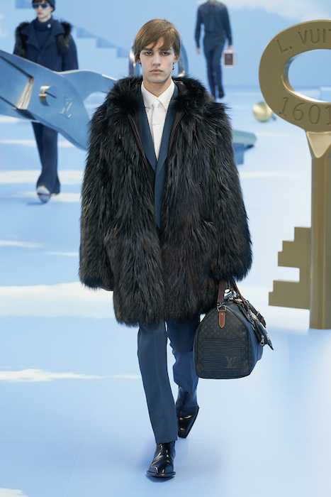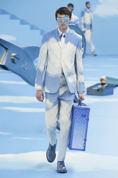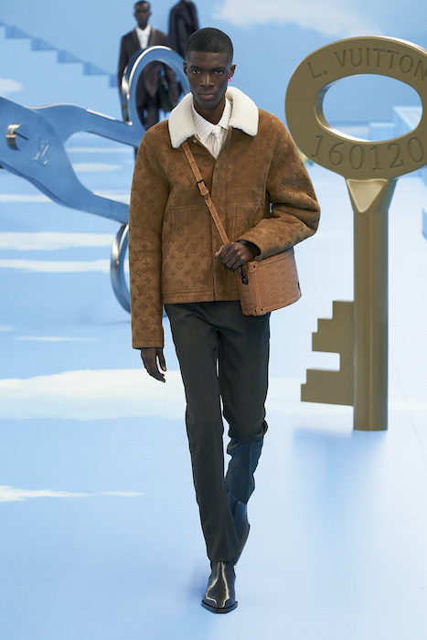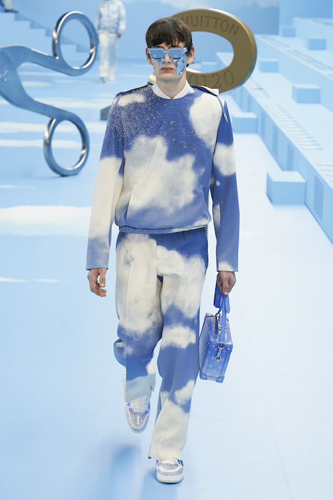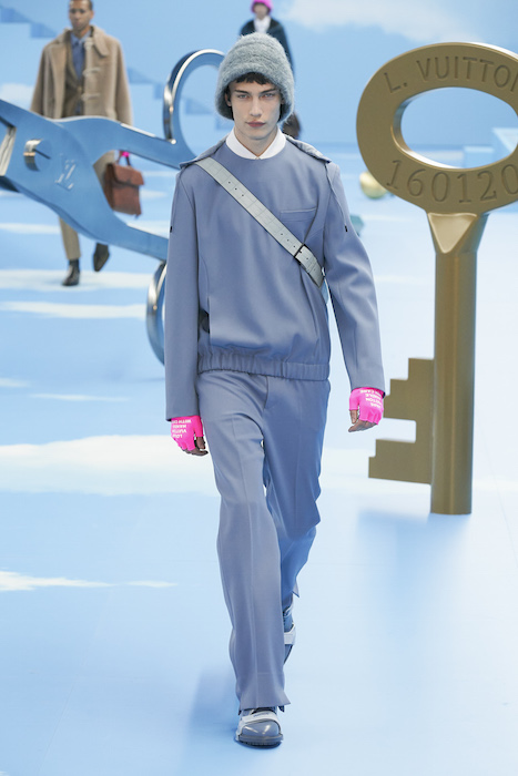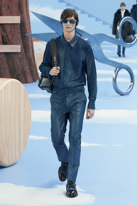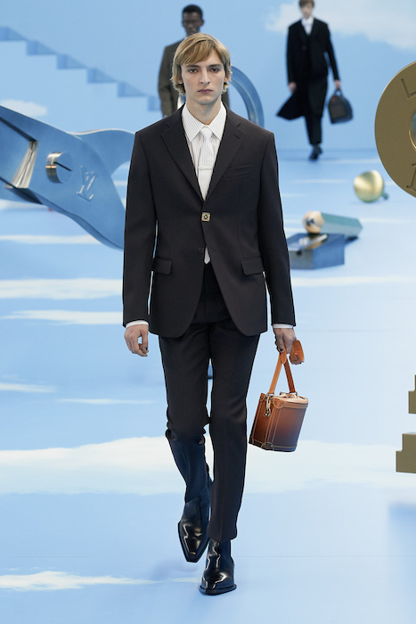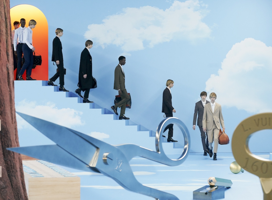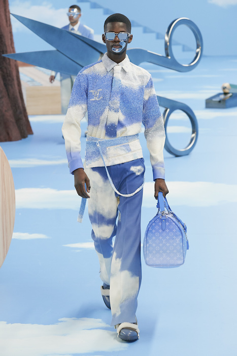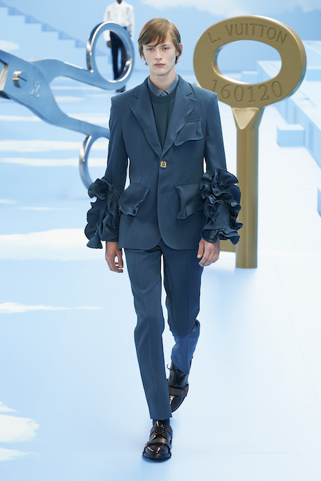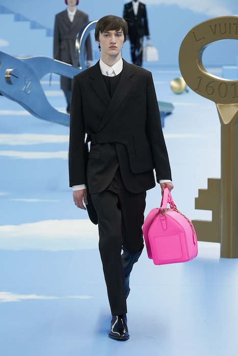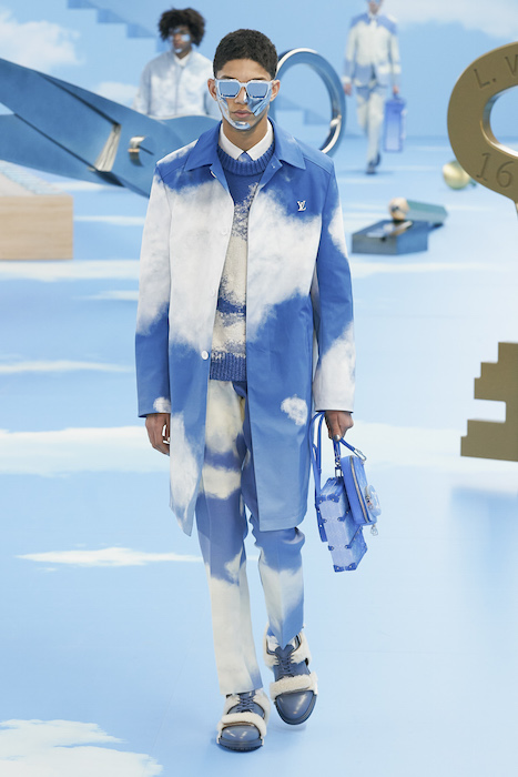 В Париже завершился показ мужской коллекции Louis Vuitton. Новая коллекция креативного директора Вирджила Абло получила название «Рай на земле», поэтому пространство для шоу напоминало небеса, по которым были разбросаны сюрреалистические предметы, например ножницы, катушка ниток, карандаш с точилкой, ключ и малярная кисть. В центре подиума возвышалось дерево. В коллекцию вошли удлиненные жакеты с ремнем, костюмы, будто расписанные баллончиком, рабочие куртки в ярко-розовом цвете и пальто с оборками. Еще были кожаные плащи и пушистые шубы. Закрывали показ образы с фотопринтами в виде неба.