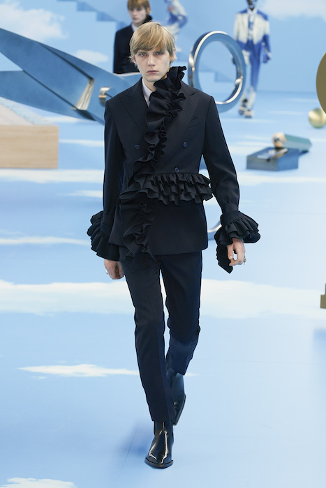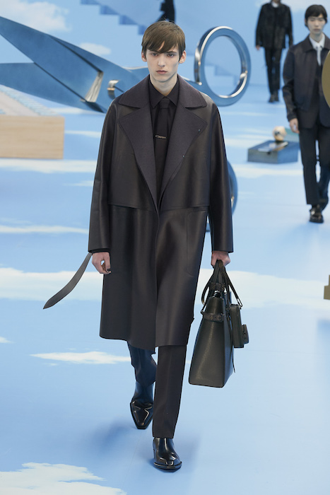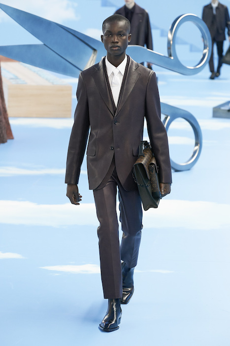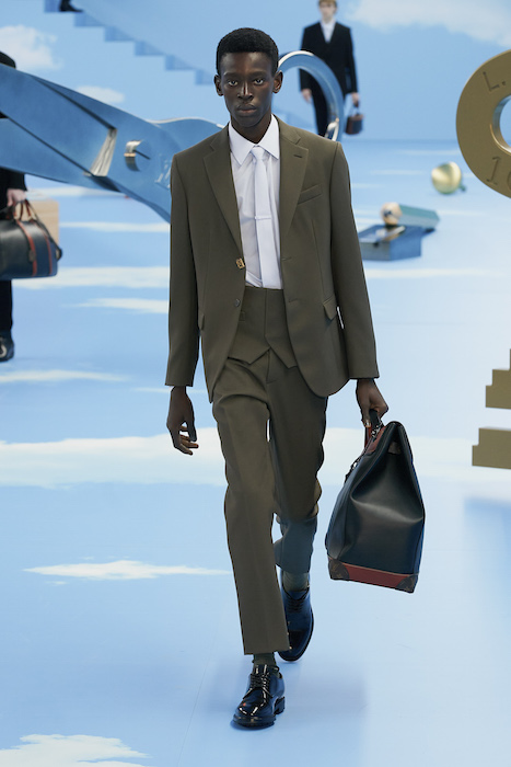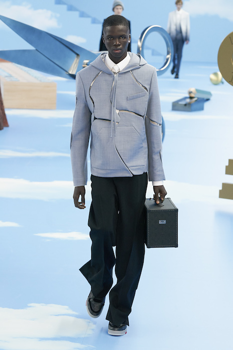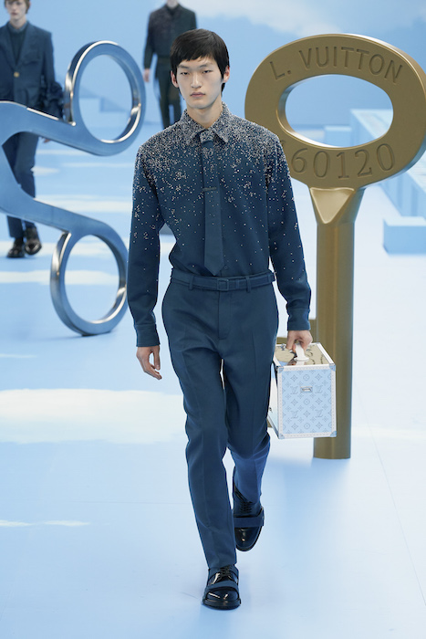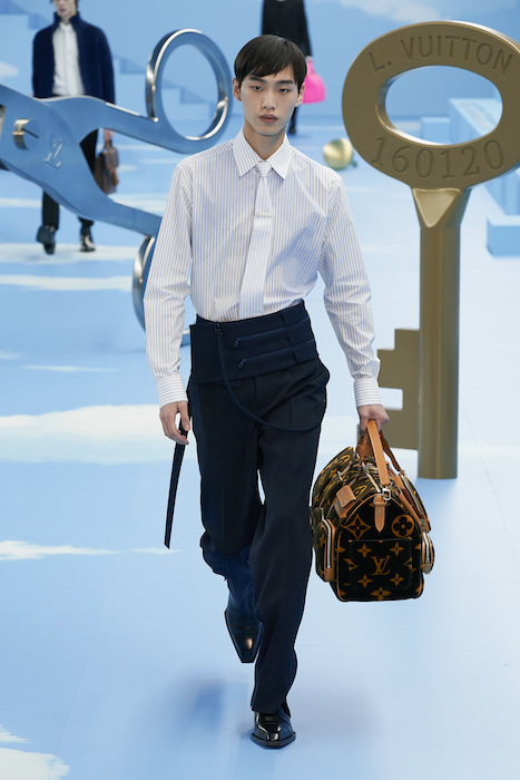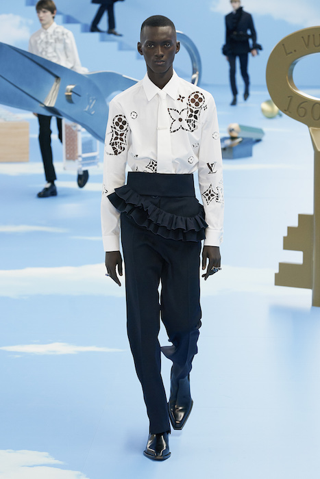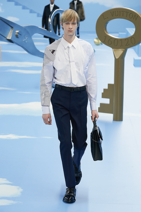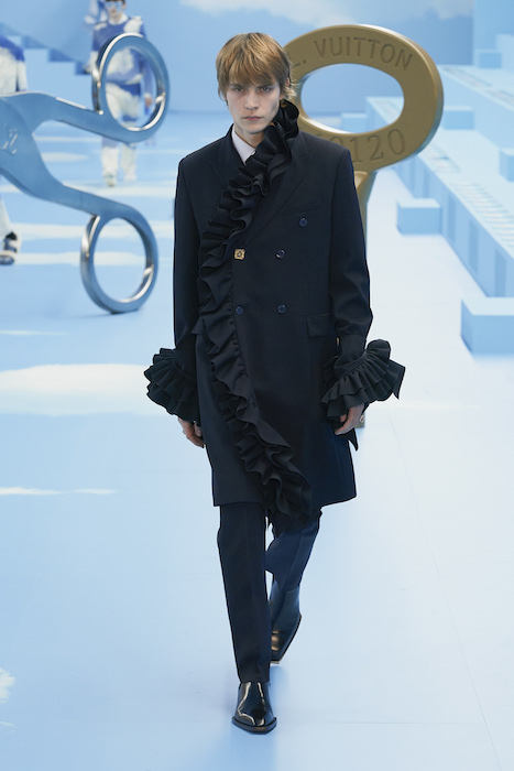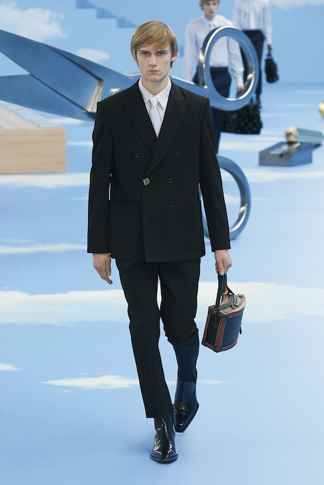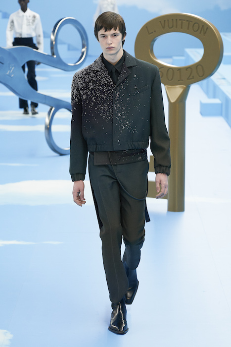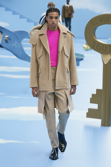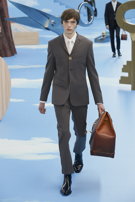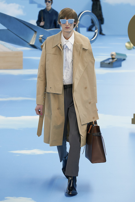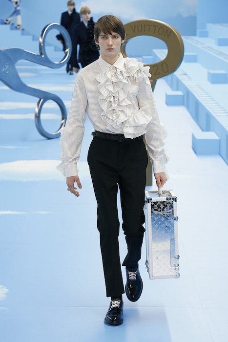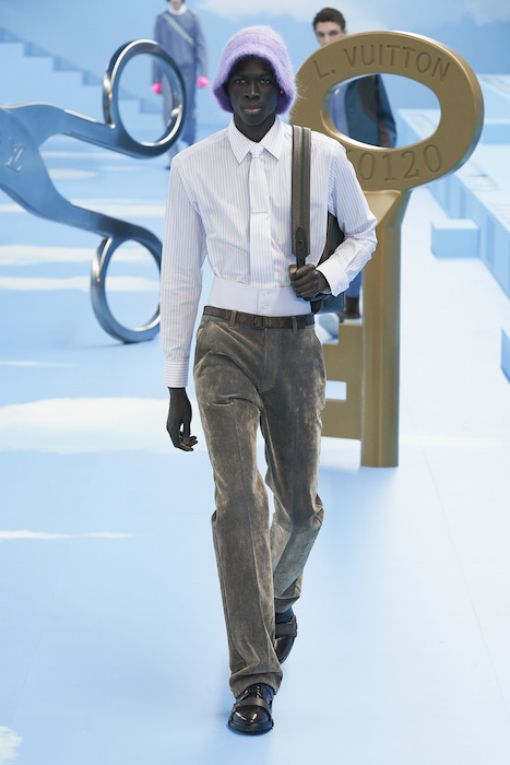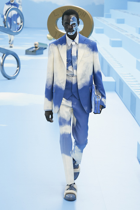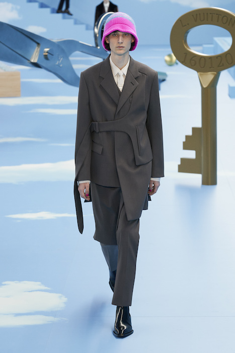 В Париже завершился показ мужской коллекции Louis Vuitton. Новая коллекция креативного директора Вирджила Абло получила название «Рай на земле», поэтому пространство для шоу напоминало небеса, по которым были разбросаны сюрреалистические предметы, например ножницы, катушка ниток, карандаш с точилкой, ключ и малярная кисть. В центре подиума возвышалось дерево. В коллекцию вошли удлиненные жакеты с ремнем, костюмы, будто расписанные баллончиком, рабочие куртки в ярко-розовом цвете и пальто с оборками. Еще были кожаные плащи и пушистые шубы. Закрывали показ образы с фотопринтами в виде неба.