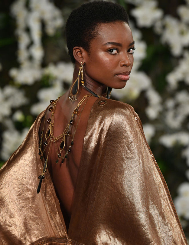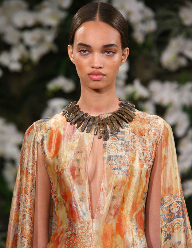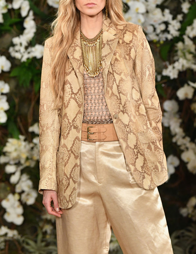 Шоу Ralph Lauren было призвано передать атмосферу тепла и цветения: подиум в молочных и бежевых тонах украшали более ста тысяч белых орхидей. Коллекция в аналогичной бежево-золотой цветовой гамме отсылала к сафари-эстетике и Древнему Египту. Свободные комбинезоны со множеством карманов, атласные шаровары, летящие атласные платья лаконичного кроя, простые блузки, массивные украшения, животные принты — ориентализм в коллекции Лорена сочетается с духом современного мегаполиса.