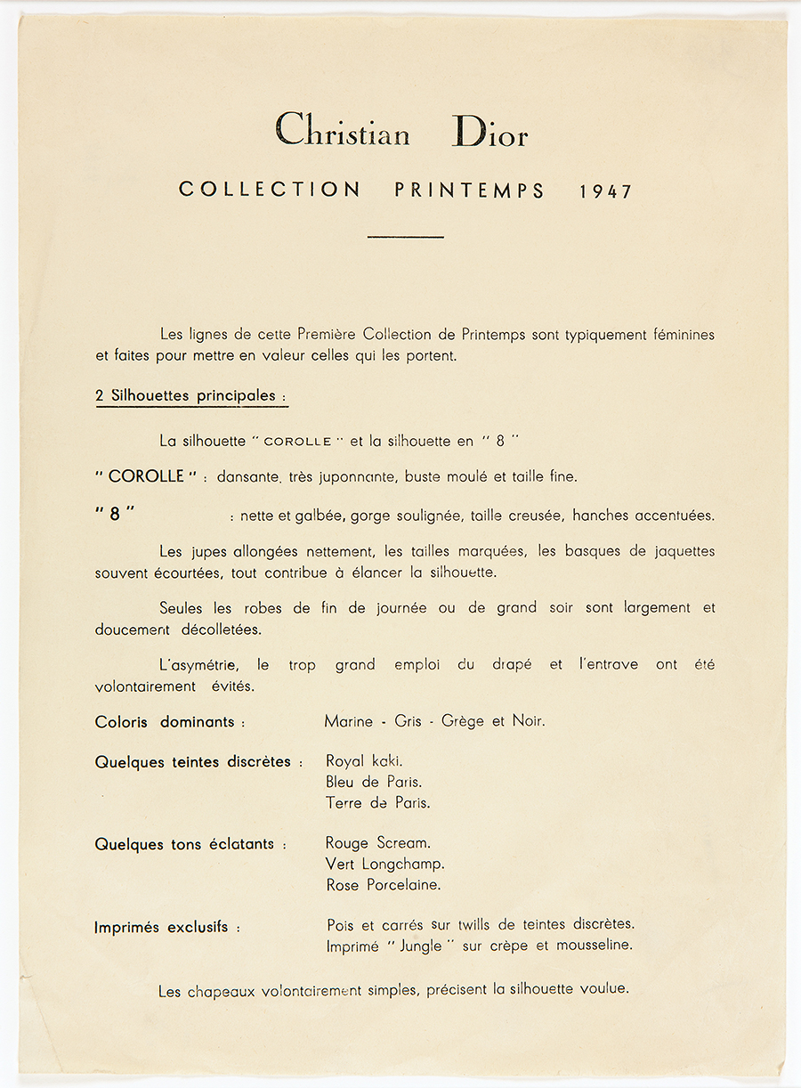 Чтобы добиться идеальной посадки, Диор изменил форму деревянного манекена молотком, добавив ему более выраженные изгибы. «Я хотел, чтобы мои платья были геометрически выстроены, облегали линии женского тела, стилистически оформляли силуэт. Я подчеркнул талию, объем бедер, бюст. Чтобы придать контурам больше жесткости, я подбил практически все ткани перкалью или тафтой, возрождая давно забытую традицию».