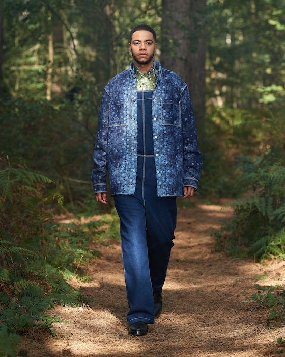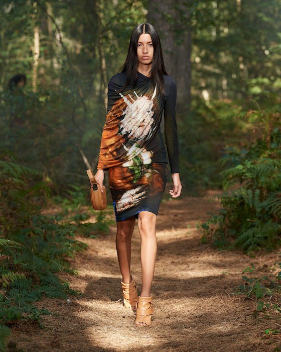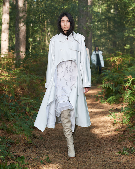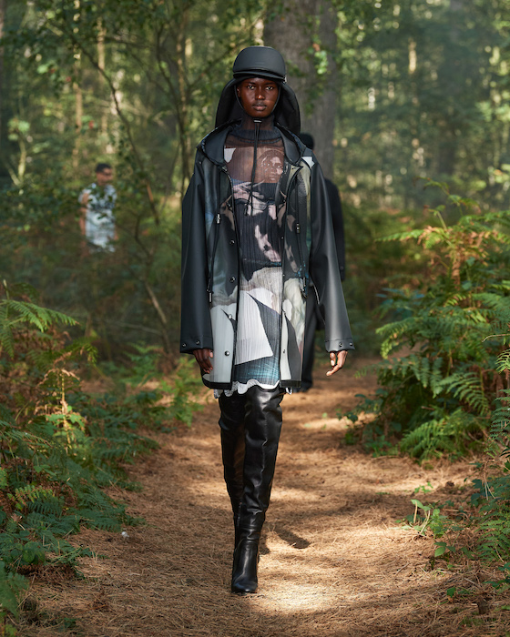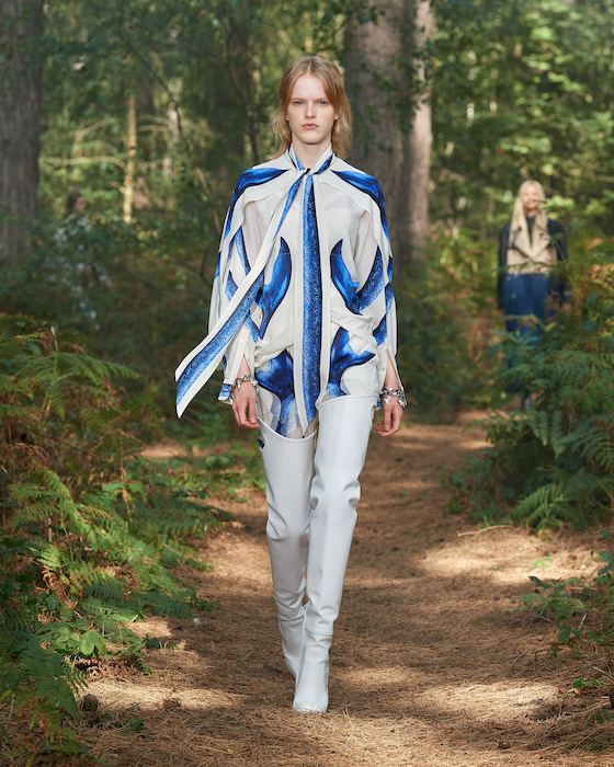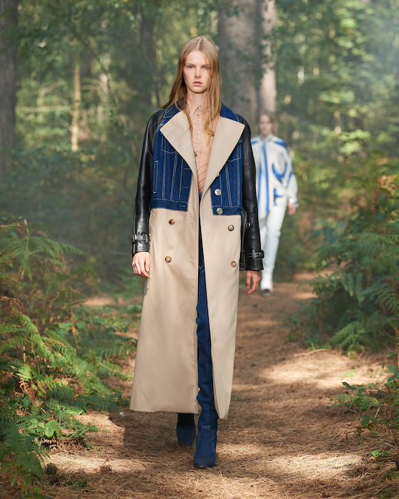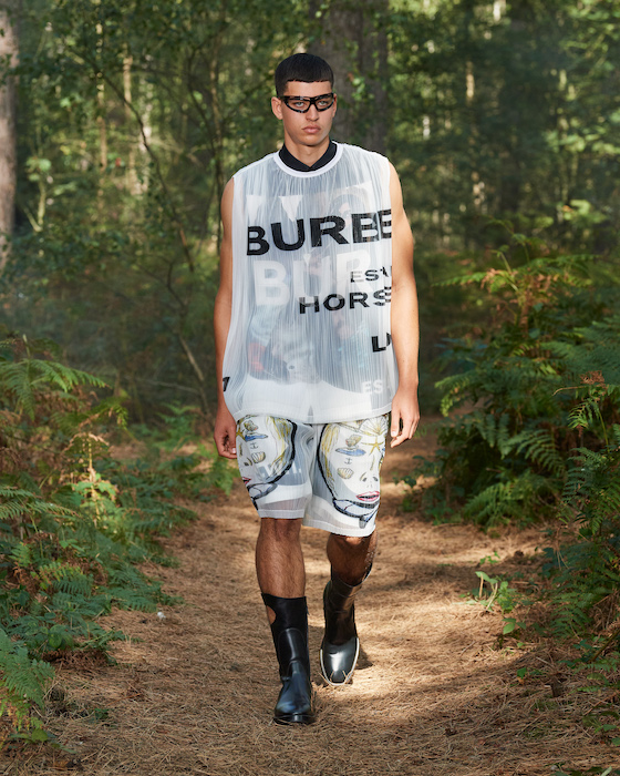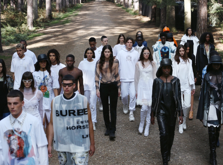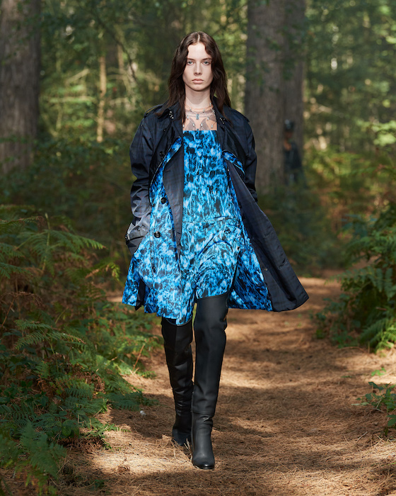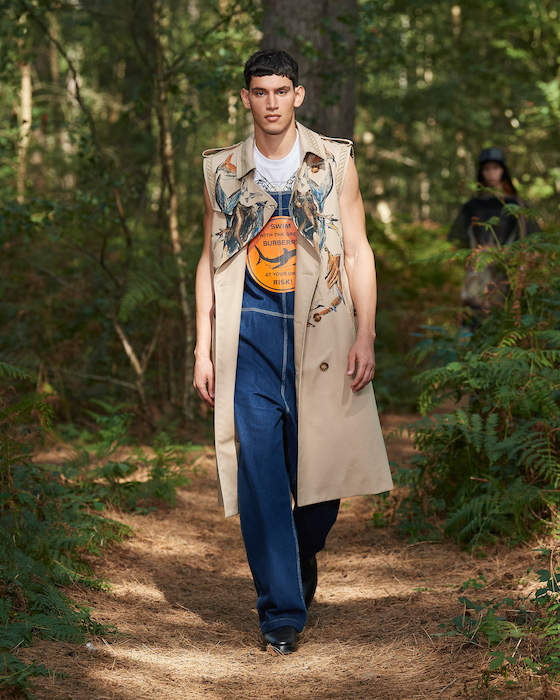 Шоу Burberry проходило на открытом воздухе — в лесу и без зрителей. Сама коллекция получила название In Bloom. По словам дизайнера Рикардо Тиши, он думал о возрождении, молодости и природе, которая всё время воссоздает себя заново. Поэтому круг, в который встали модели после проходки, символичен. В палитре коллекции преобладают морские оттенки, на принтах изображены акулы, бабочки и фрагменты британских пейзажей.