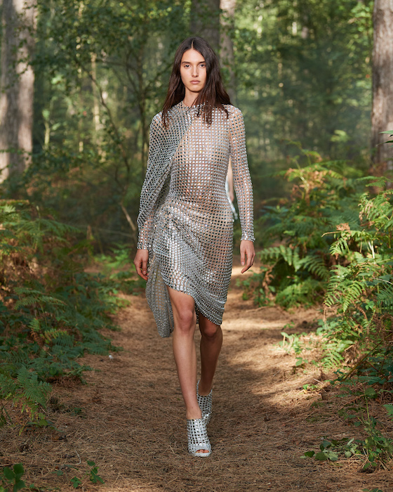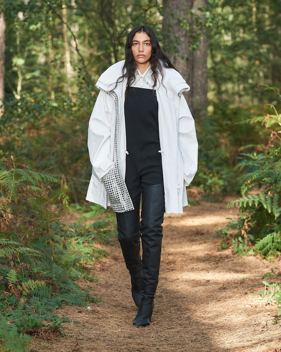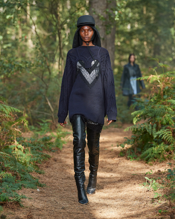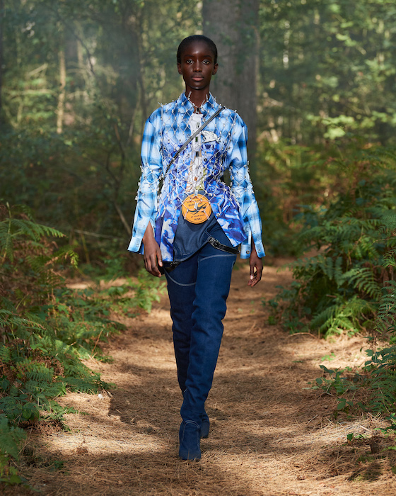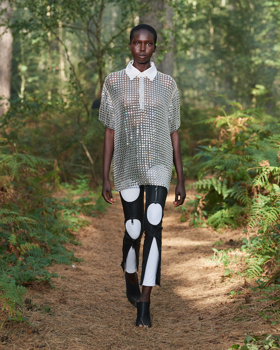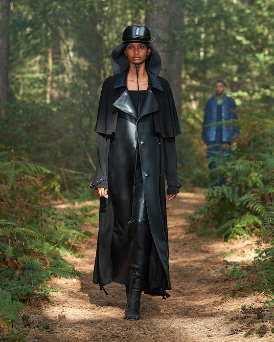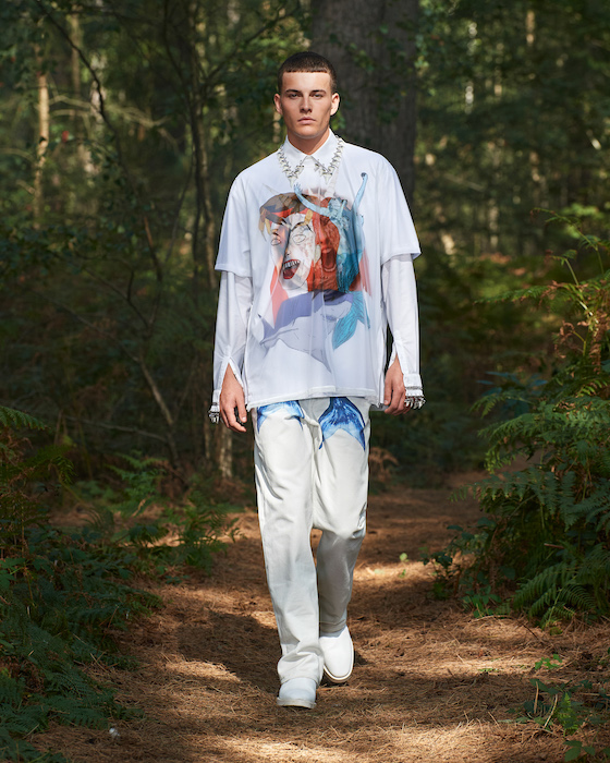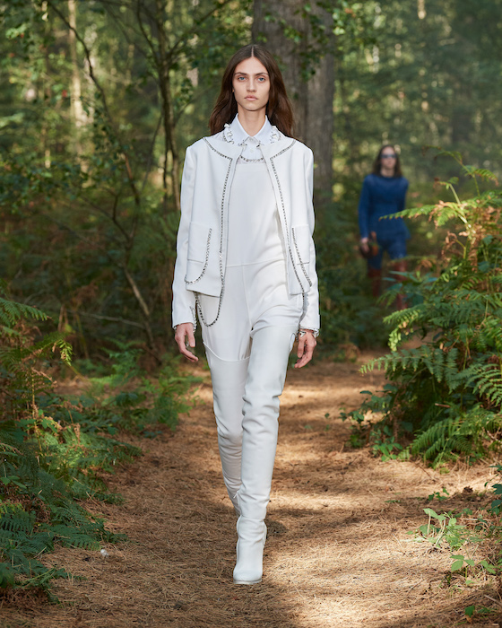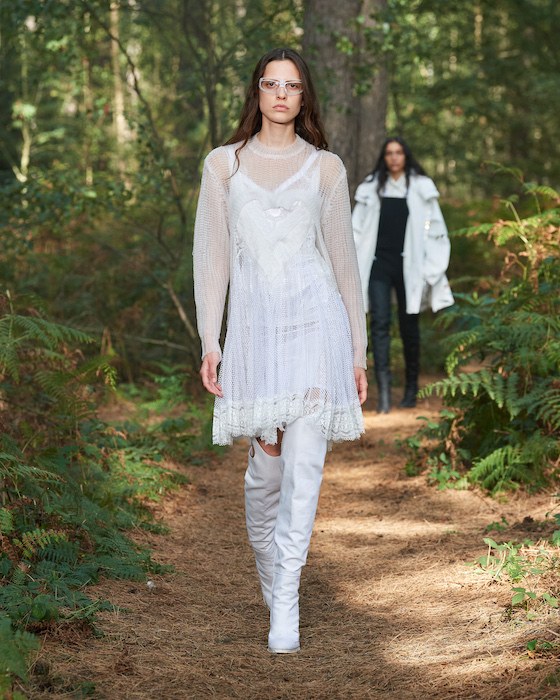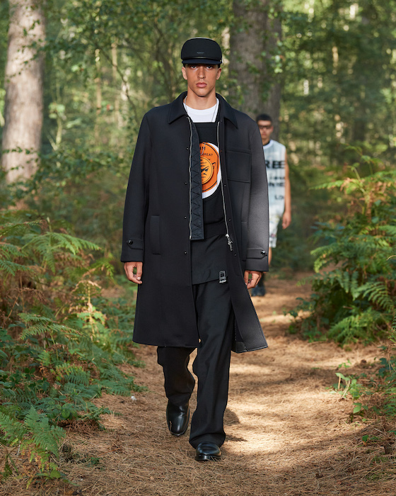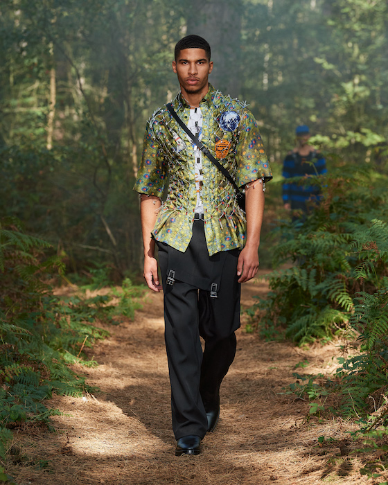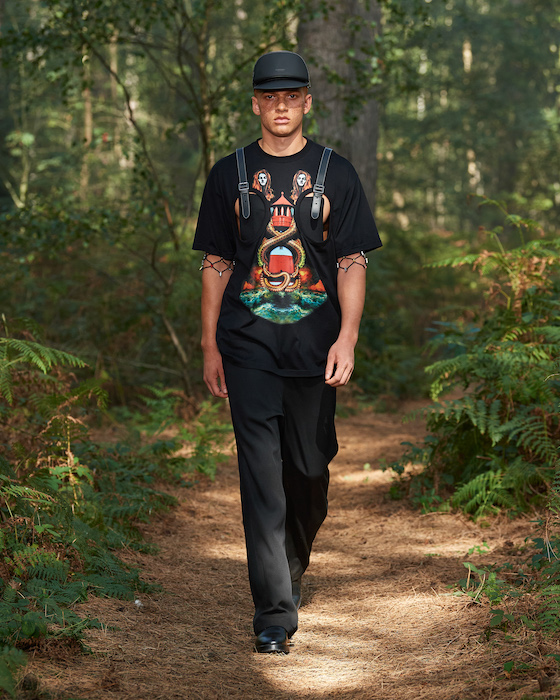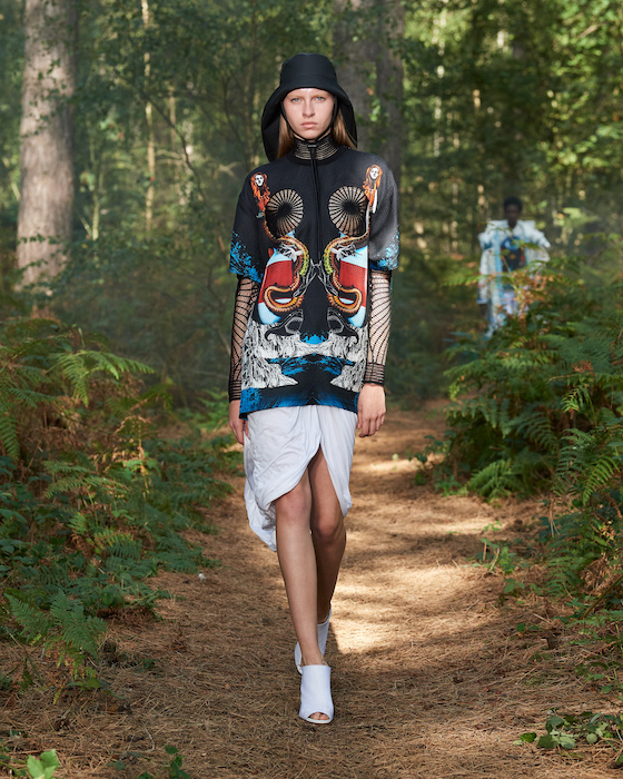 В центре круга — перформансисты в белой одежде, которая сразу вызывает ассоциации с больницей. Они кричат, танцуют, дерутся, а нарядные модели по периметру не обращают на них внимания. Мужчины в костюмах и черных очках похожи на шпионов — это намек на конспирологическую теорию о 2020-м. Над этим лесным перформансом Рикардо Тиши работал вместе с Анне Имхоф — немецкой художницей, получившей главную награду Венецианской биеннале в 2017 году.