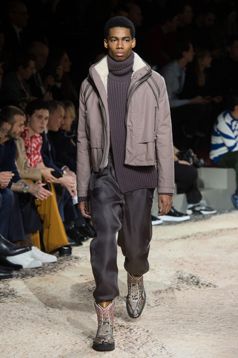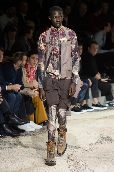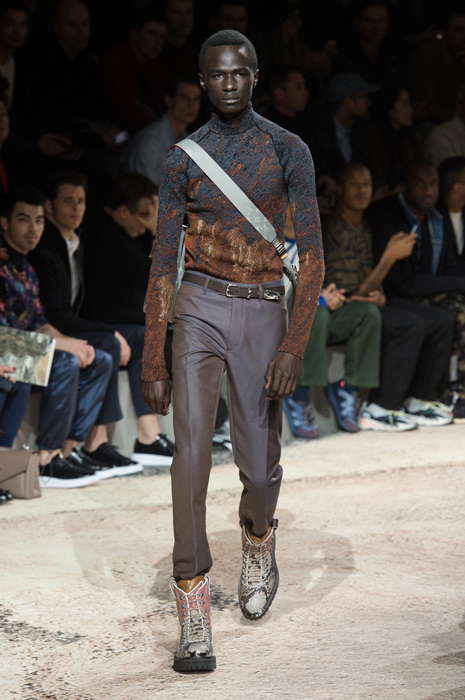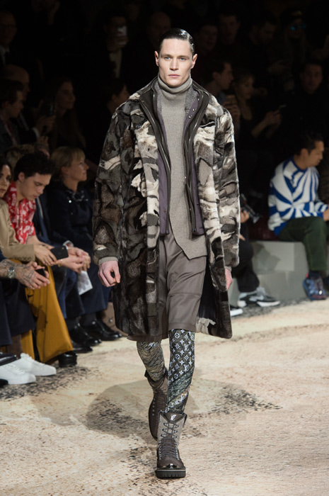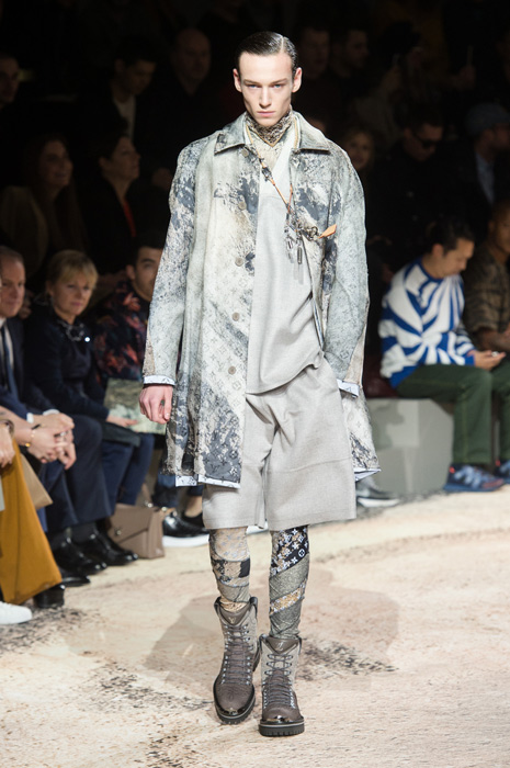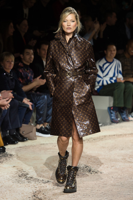 Уже первой своей коллекцией дизайнер внедрил дух улиц и субкультур в исторический французкий дом. Эта традиция продолжилась и расцвела в последней коллекции — мягкие костюмы, классические макинтоши и пальто в ней оттенялись озорным духом улиц и желанием эксперементировать, которого у Джонса всегда было не занимать. Кожаные плащи, шорты и рубашки были выполнены из ткани с рисунком, напоминающим фотопринт природных морских стихий с японских гравюр, другие же были выполнены из серебряной кожи. И, конечно, Джонс нашел очередной способ обыграть логотип LV — в этот раз он украсил мужские леггинсы, появился в виде едва заметной вышивки на плаще и на толстовке. На последней буква V приобрела форму жеста «peace» (предсказываем, что толстовка станет очередным хитом Джонса). Закрыли показ супермодели и по совместительству хорошие подруги дизайнера Наоми Кэмпбелл и Кейт Мосс — в плащах из винила, принтованного узором Louis Vuitton на манер бутлега авторства Дэппера Дэна.