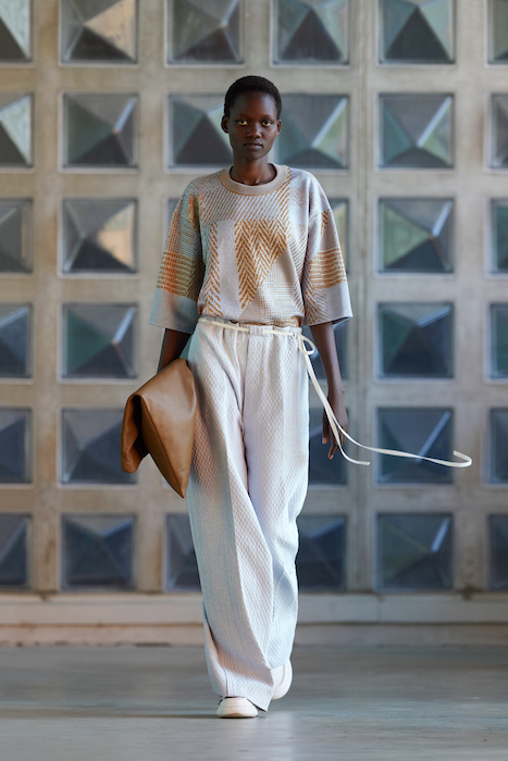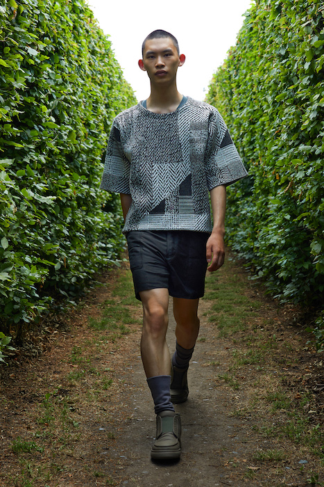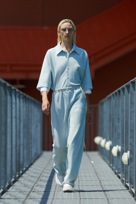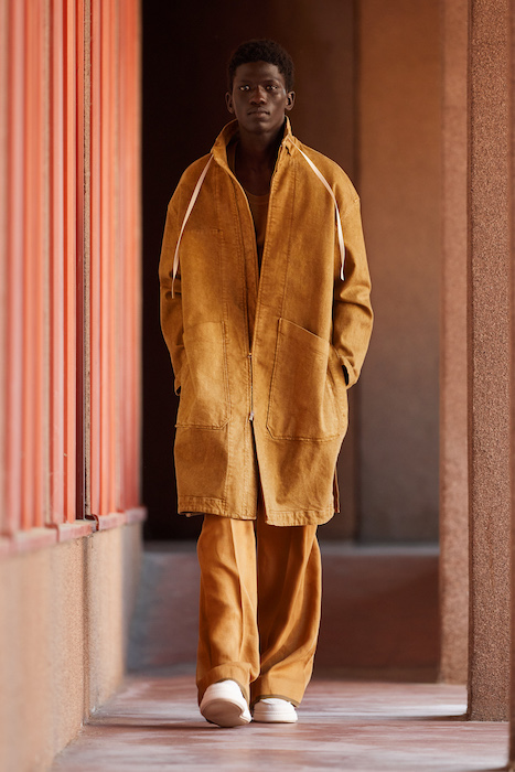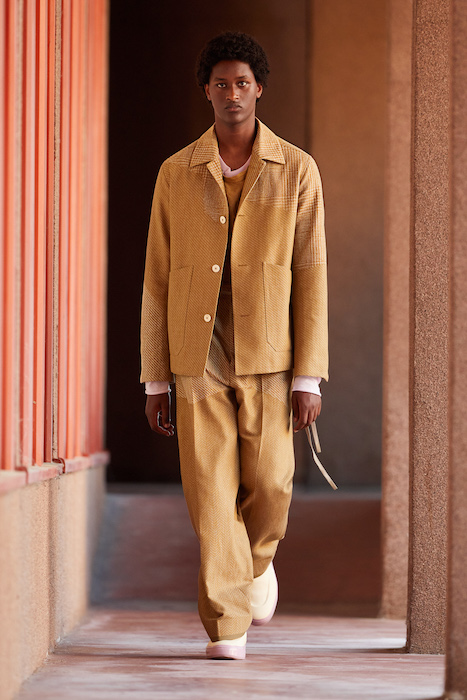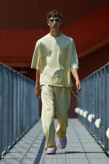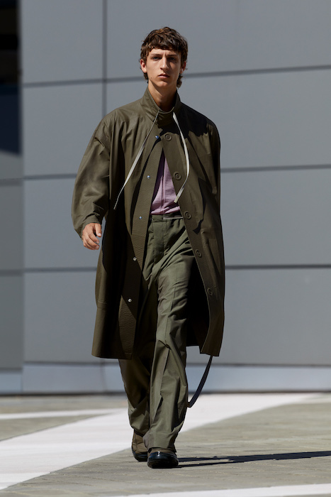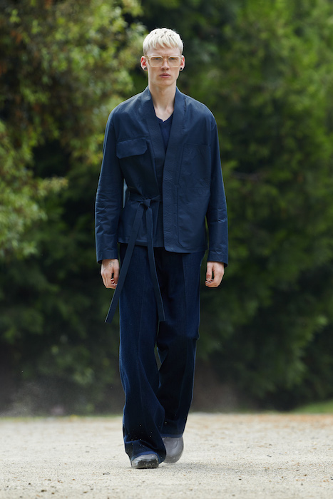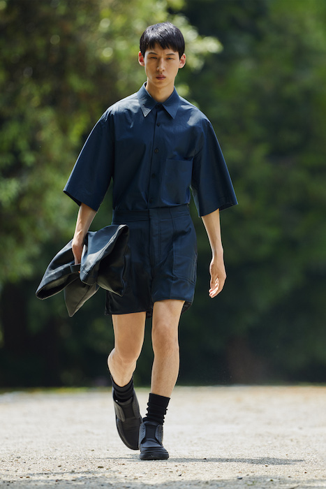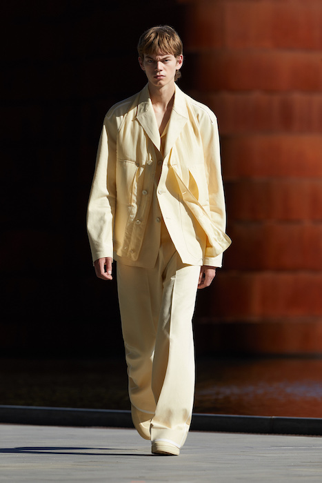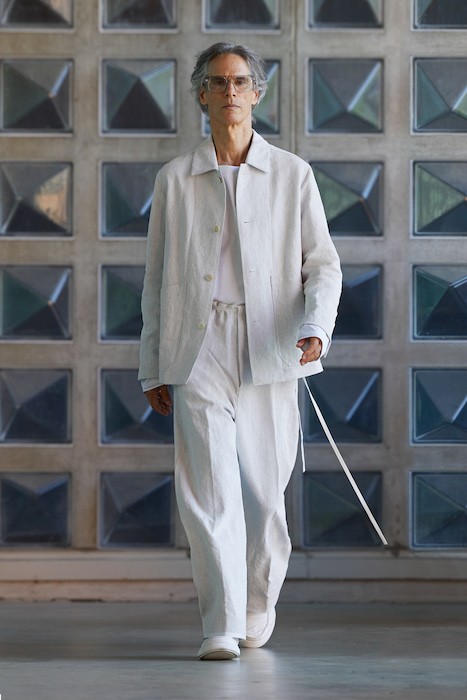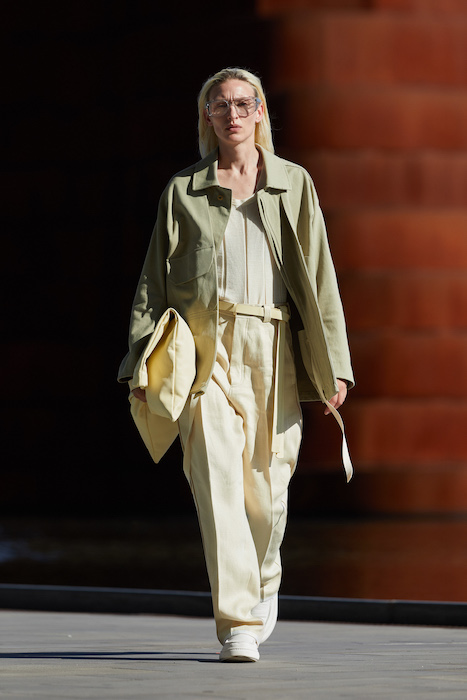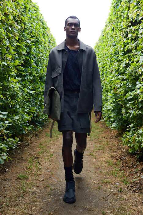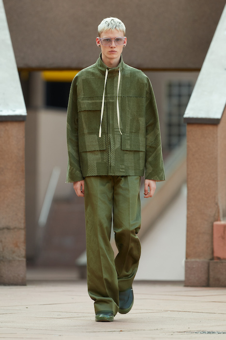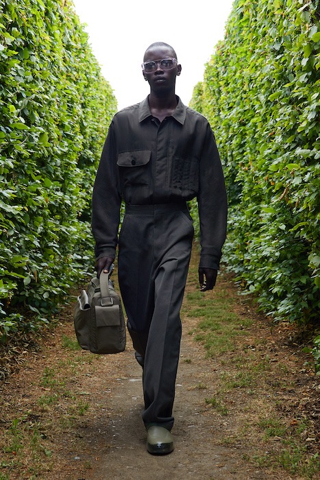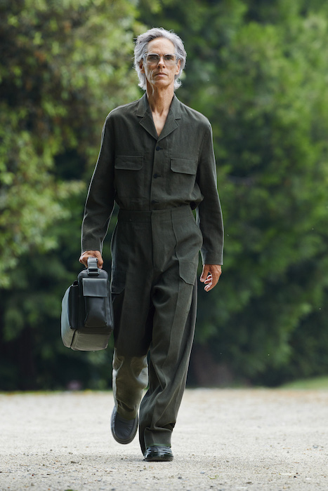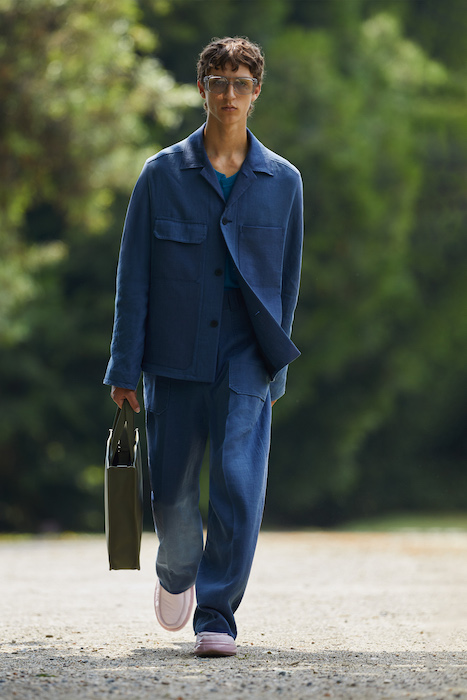 Неделя мужской моды в Милане открылась онлайн-показом Ermenegildo Zegna. В сюрреалистичном ролике модели ходят по зеленому лабиринту, яркой лестнице, а в конце собираются за большим столом, накрытом прямо посреди водоема. Креативный директор Алессандро Сартори говорит, что его цель — объединить тейлоринг с ритмом большого города. Для этого в коллекции есть легкие пиджаки, сделанные из ткани, как для рубашек, куртки-кимоно, костюмы с рубашкой вместо пиджака и брюки на резинке. Последние отделаны снизу резиновой прослойкой — чтобы предотвратить обтрепанный низ. Комбинезоны и куртки, особенно варианты в приглушенном зеленом цвете, хоть напоминают о спецодежде, но сшиты в традициях высокого портновского искусства.