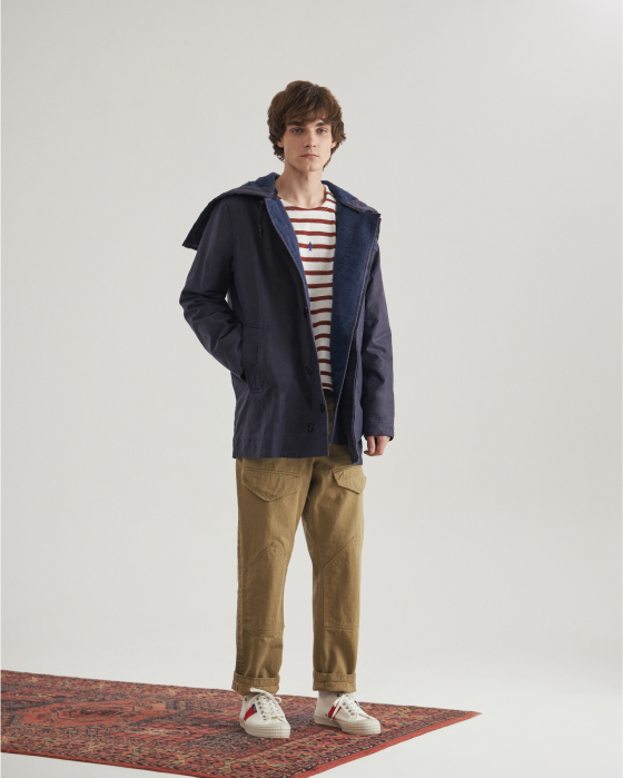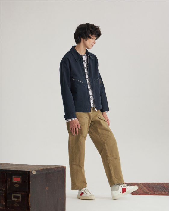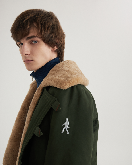 Вещи из новой коллекции бренда «Олово» одинаково подойдут парням и девушкам. Как и прежде, московская марка обращается за силуэтами к советской военной форме. Серый джемпер из хлопка пима сделан на основе свитера подводника ВМФ. Комплект из вельветовых брюк галифе и куртки частично повторяет униформу военного специалиста в странах Азии. Жилет выполнен по образу телогрейки, но из непривычных материалов — замши, кожи, нейлона, английского вощеного хлопка. Еще есть хлопковая куртка ВВС, шинель из шерсти и кашемира, теплый тулуп «караульного» с подкладкой из овчины, а также парка с оригинальной деталью штормовки ВМФ СССР — капюшоном, который трансформируется в откидной воротник. Свои ботинки «Олово» делает на основе ботинок моряка и утепляет войлоком.