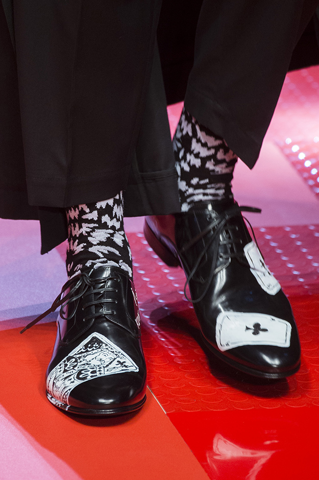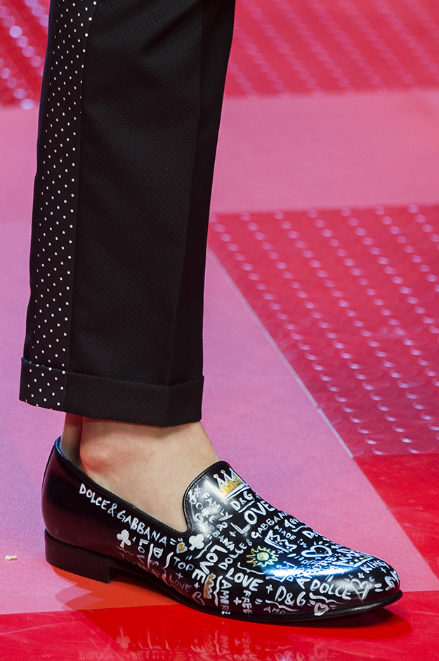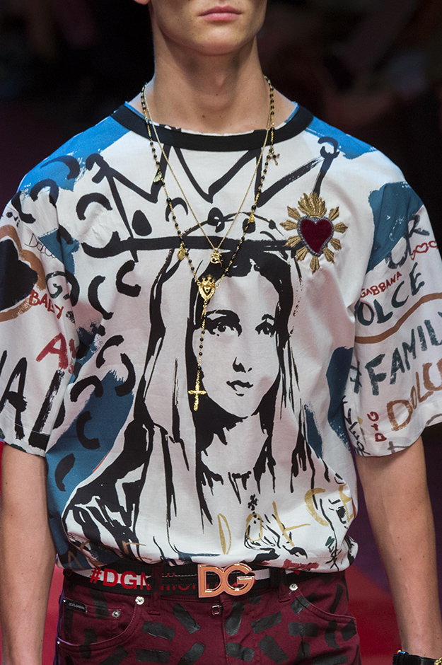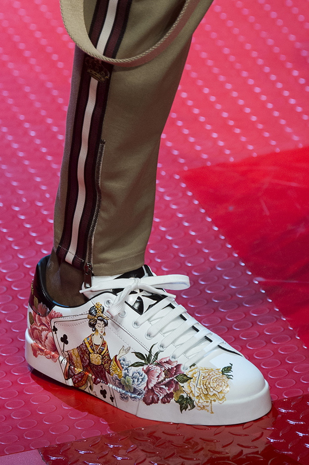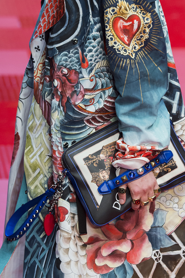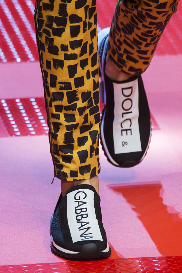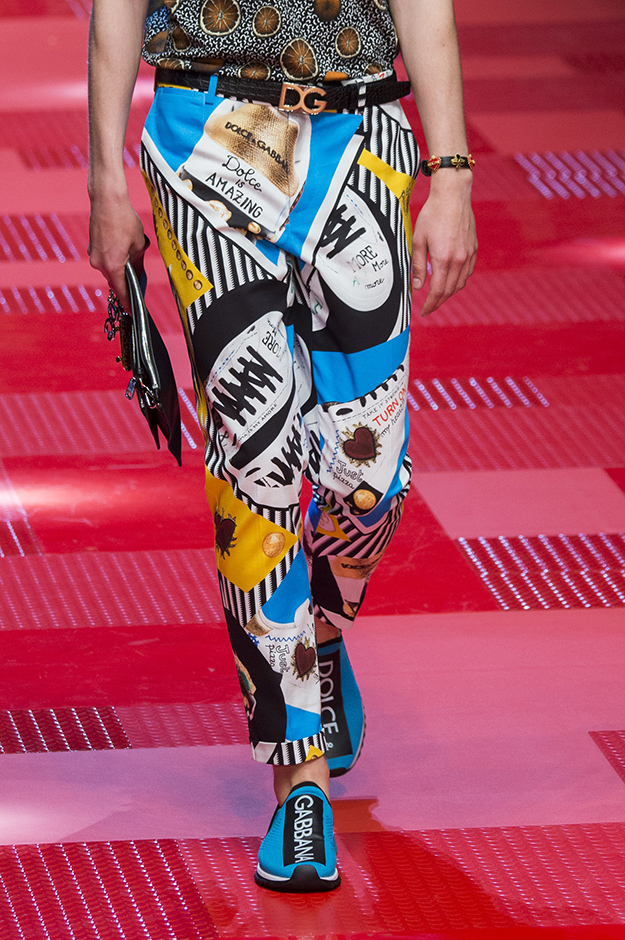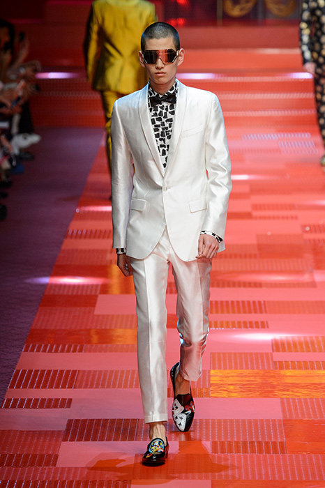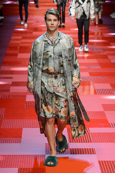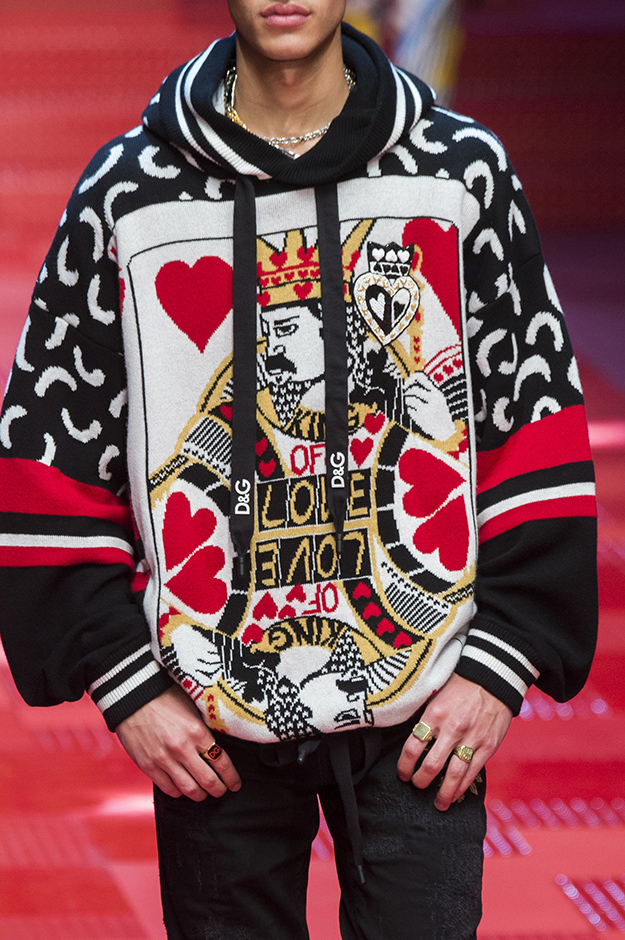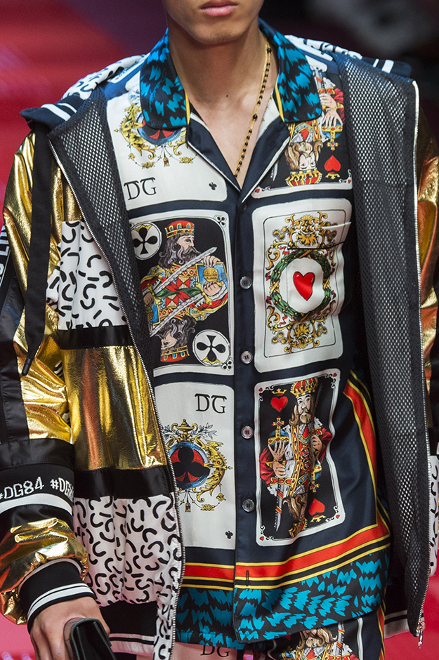 Кастинг прошлого показа женской коллекции сезона осень-зима Dolce & Gabbana в основном состоял из преданных поклонников дизайнерского дуэта: светских львиц, известных инстаграм-блогеров и звездных миллениалов. Бренд продолжил развиваться в сторону молодого покупателя и в качестве моделей для шоу мужской коллекции весна-лето 2018 привлек молодых блогеров и детей знаменитостей: среди них были племянник Билла Клинтона Тайлер, сын Памелы Андерсон и Томми Ли Брэндон, сын Изабеллы Росселини Роберто и многие другие. Что касается самой коллекции, то здесь дизайнеры остаются верными своей любви к эклектике. Так, здесь появились уже знакомые и любимые фанатами бренда яркие принты, громкие надписи и обилие вышивки, а также костюмы из атласа.