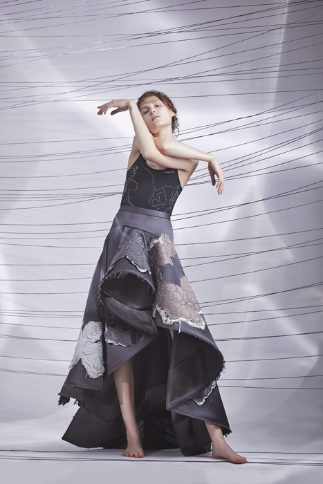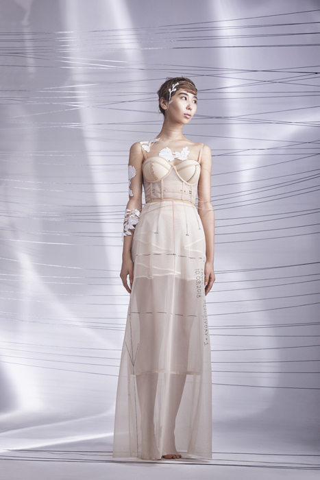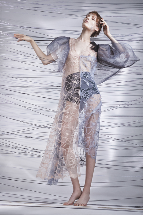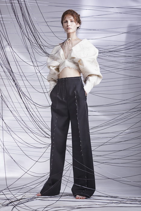 «Мы гордимся тем, что наши вещи идеальны снаружи и хотим показать, что следим за каждым швом и стежком. Мы хотим культивировать наше отношение к изнанке, которая на самом деле — лицо бренда», — так дизайнеры марки Алиса и Юля Рубан комментируют свою вторую кутюрную коллекцию. В ней — девять образов из тонкого кружева, сетки, килограммов бисера, матового шелка, хлопка, льна и нежной органзы карамельных оттенков. На каждом изделии изображены фрагменты работы кутюрных мастеров в ателье: вышивка имитирует технические надписи и линии раскроя, а узоры сделаны в виде наметки, что не мешает им соседствовать с аппликациями из рельефных лепестков, бисерной вышивкой и воланами.