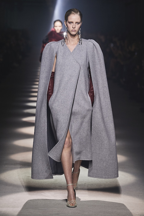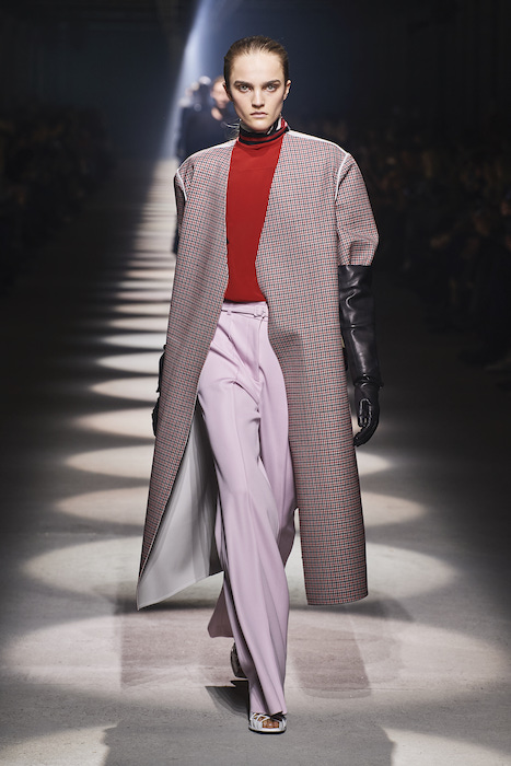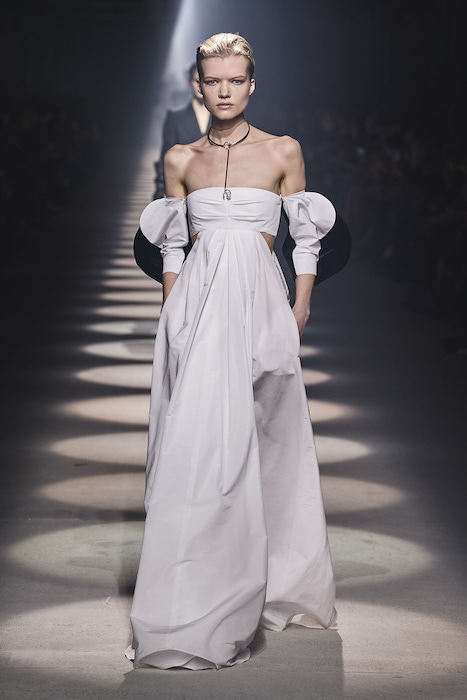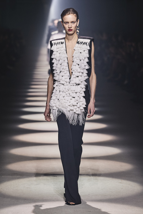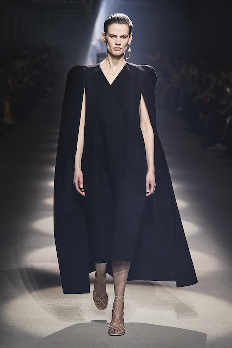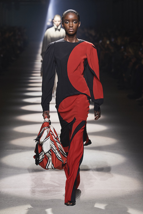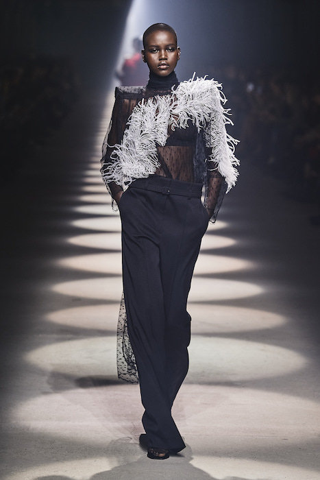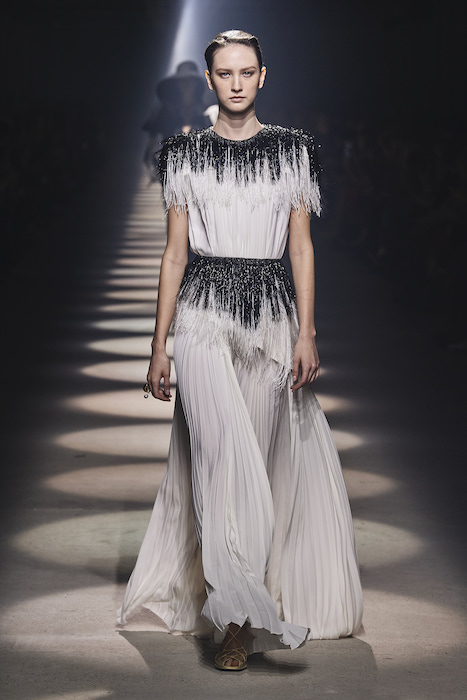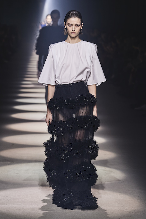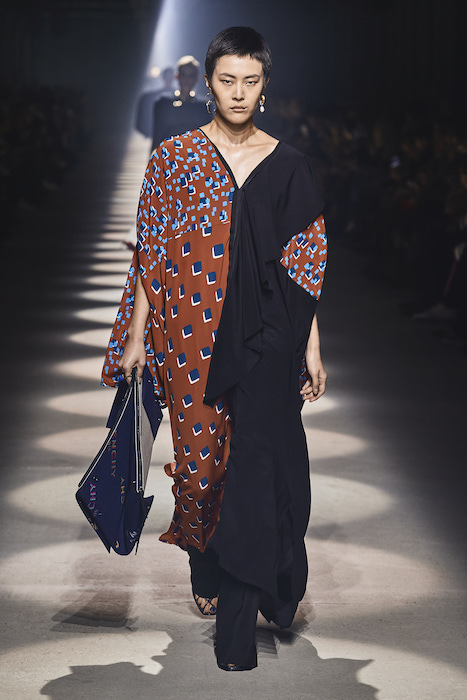 В мудборд новой коллекции Givenchy вошли работы художниц Хелены Альмейды и Кетти ла Рокка, снимки актрисы Анук Эме и постеры фильмов французской новой волны. При этом дизайнер Клэр Уэйт Келлер не забывает и об архивах дома — показ открылся и закрылся образами в широкополых шляпах, как из коллекций самого Юбера де Живанши. Пальто, двубортные пиджаки и платья акцентировались с помощью плеч, при этом сама линия рукава была мягкой. Также дизайнер использовала множество перьев — ими декорированы длинные юбки, жакеты и линия плеч на платьях. Образы дополнили высокие кожаные перчатки и сандалии на танкетке.