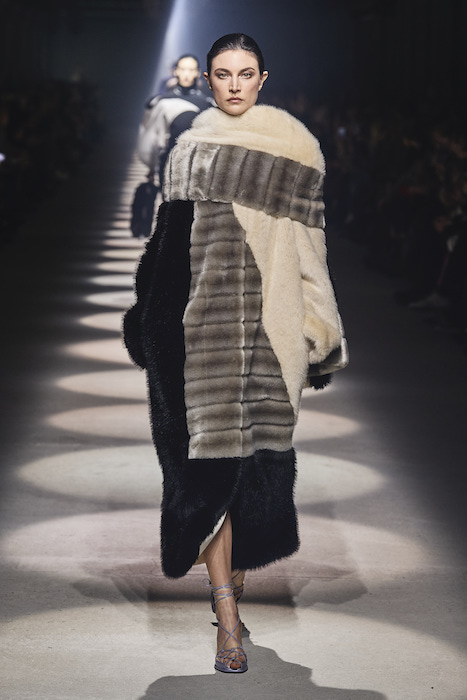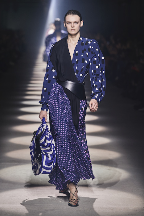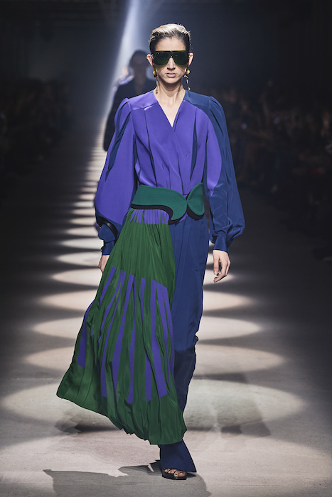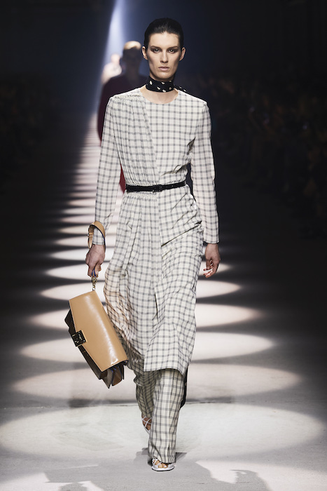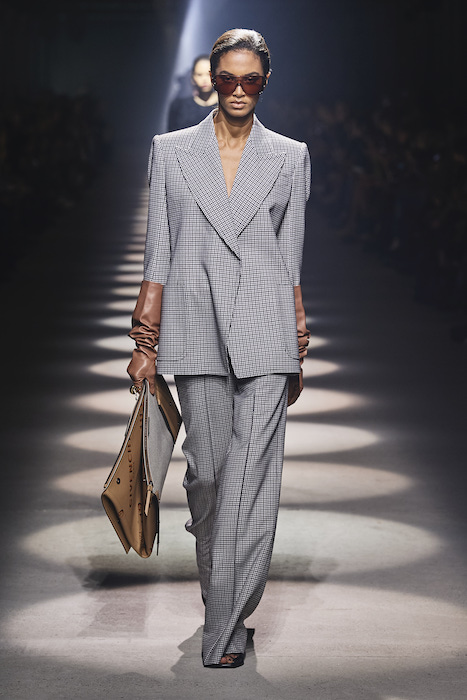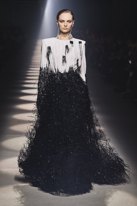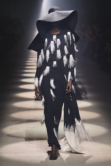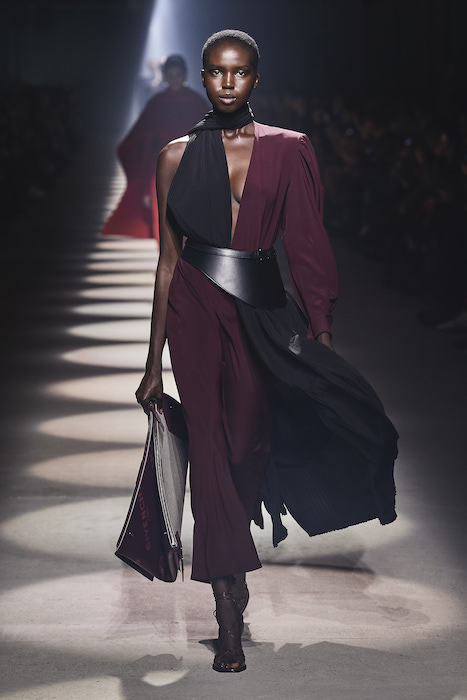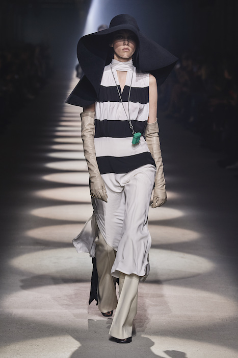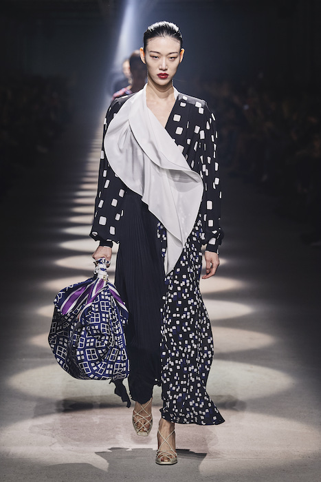 В мудборд новой коллекции Givenchy вошли работы художниц Хелены Альмейды и Кетти ла Рокка, снимки актрисы Анук Эме и постеры фильмов французской новой волны. При этом дизайнер Клэр Уэйт Келлер не забывает и об архивах дома — показ открылся и закрылся образами в широкополых шляпах, как из коллекций самого Юбера де Живанши. Пальто, двубортные пиджаки и платья акцентировались с помощью плеч, при этом сама линия рукава была мягкой. Также дизайнер использовала множество перьев — ими декорированы длинные юбки, жакеты и линия плеч на платьях. Образы дополнили высокие кожаные перчатки и сандалии на танкетке.