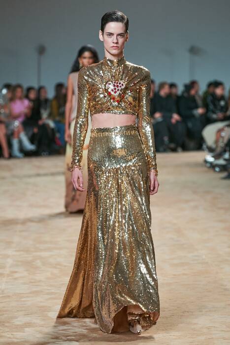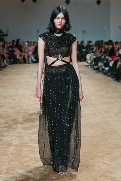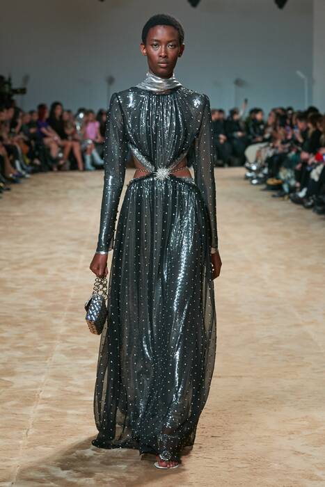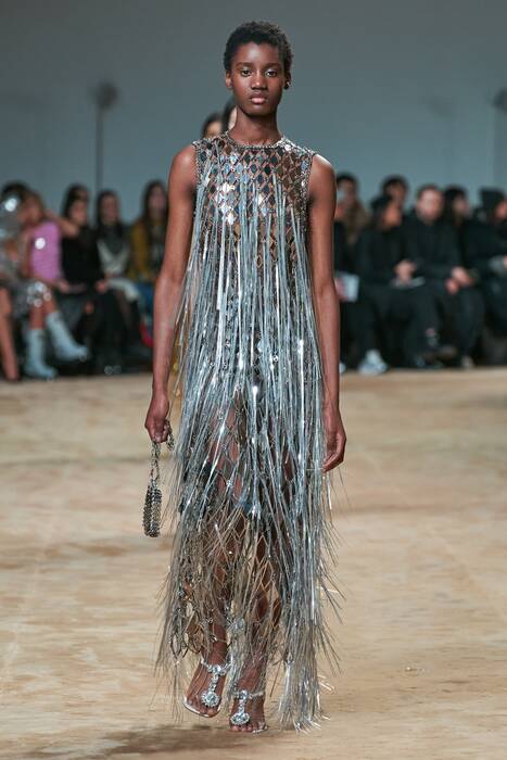 На Неделе моды в Париже прошел показ Paco Rabanne — первое шоу после смерти самого Пако Рабана. И хотя креативный директор бренда Жульен Доссена начал работу над коллекцией еще до печальных новостей, она все равно выглядела как посвящение ушедшему дизайнеру. Были платья из «шуршащего металла», которые использовал Рабан в 60-х, и платья-кольчуги. Пять образов созданы в сотрудничестве с фондом Сальвадора Дали — Пако Рабан дружил и работал с художником-сюрреалистом. Еще в коллекции Доссены были сеты из ангоры, пушистые пальто с металлическими деталями и сверкающие драпированные платья с вырезами на талии и на животе — всех их легко представить на красных дорожках.
