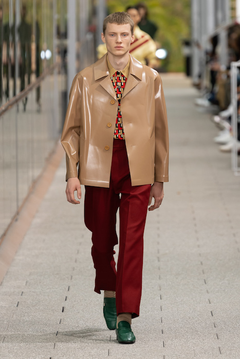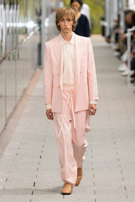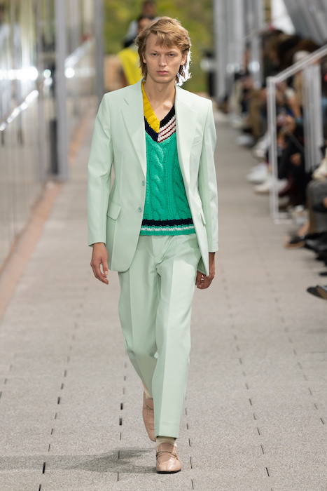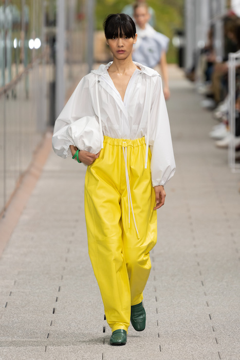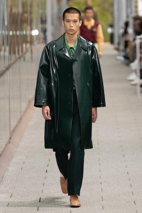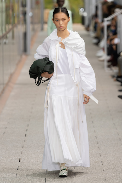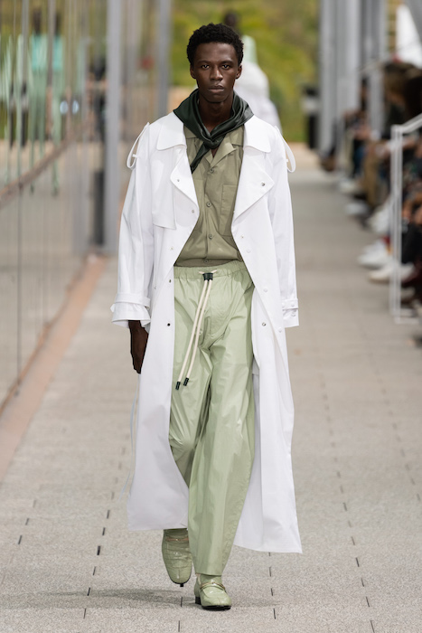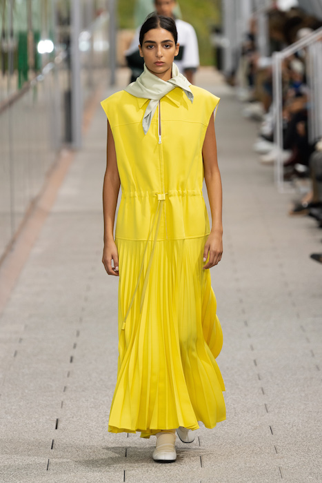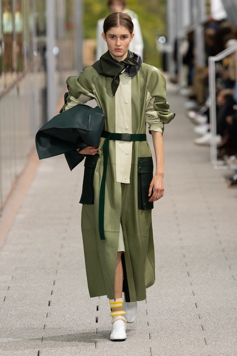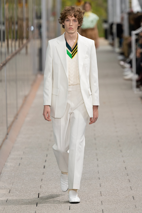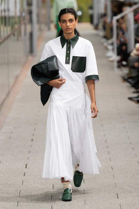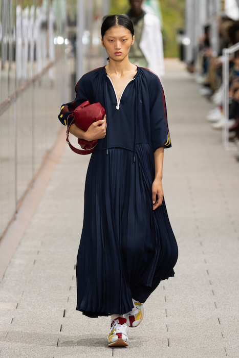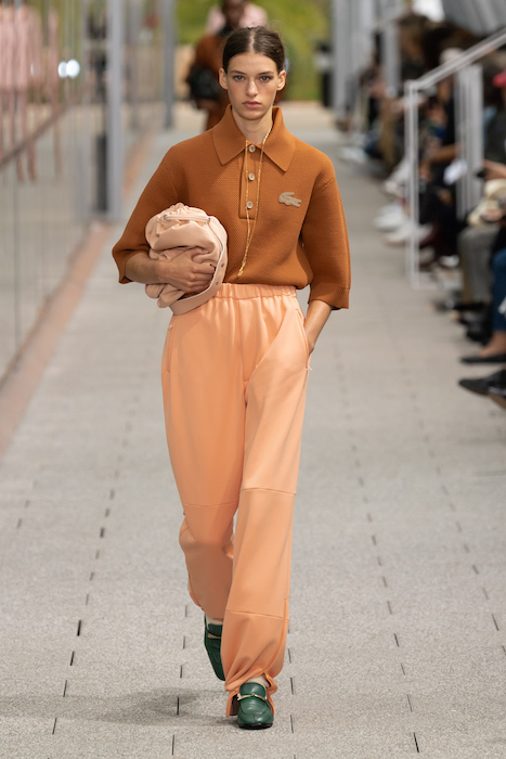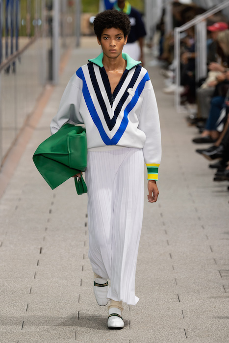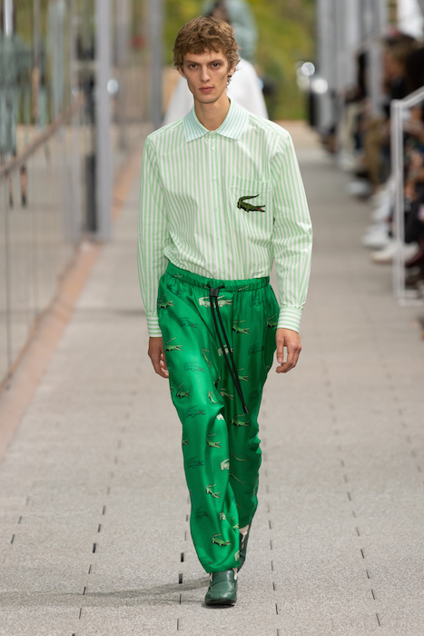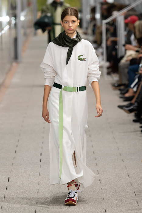 Комментируя новую коллекцию, креативный директор марки Луиза Троттер указывала на аристократическую, но вполне себе уличную идентичность Lacoste. Еще дизайнер говорила, что вещи получились ностальгическими, но современными: спортивные брюки и шорты она, к примеру, сделала из кожи, плащи — из лакированной кожи. В коллекцию также вошли ветровки в пол, много макси-платьев и юбок с характерной для Lacoste плиссировкой и костюмы в пастельных оттенках. Запонки с крокодилами для Lacoste сделала молодая лондонская марка Alighieri, а обувь для шоу — гибриды мокасин и кроссовок — придумала сникер-коллажист Элен Киркум (Helen Kirkum).