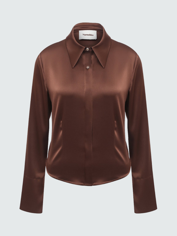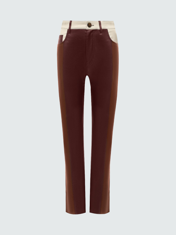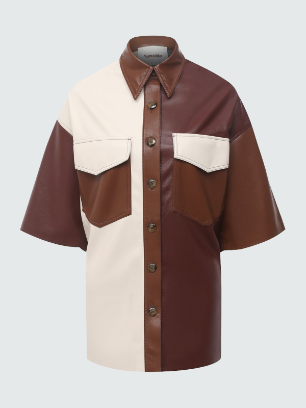 Кожаный пуховик — самая узнаваемая вещь венгерской марки. В новой коллекции к экспериментам бренда с веганской кожей добавляется пэчворк: рубашки и брюки собираются из остатков материала. Важная особенность кожи, которую использует Nanushka, в том, что изделия из нее можно стирать дома.