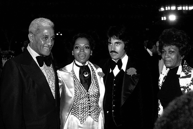 Номинированная на «Оскар» за роль в байопике о жизни Билли Холидей «Леди поет блюз» Дайана Росс продолжила адаптировать традиционно мужские элементы гардероба «на выход». Певица и актриса пришла на премию в кастомизированном атласном смокинге Bob Mackie x Ray Aghayan. Помимо того, что выход был и так довольно смелым, он был еще и парным — муж Дайаны Роберт Сильберстайн пришел в точно таком же смокинге, только черном.