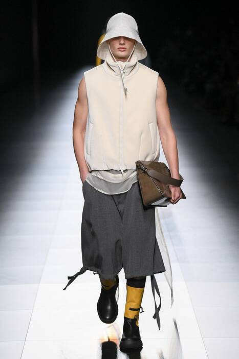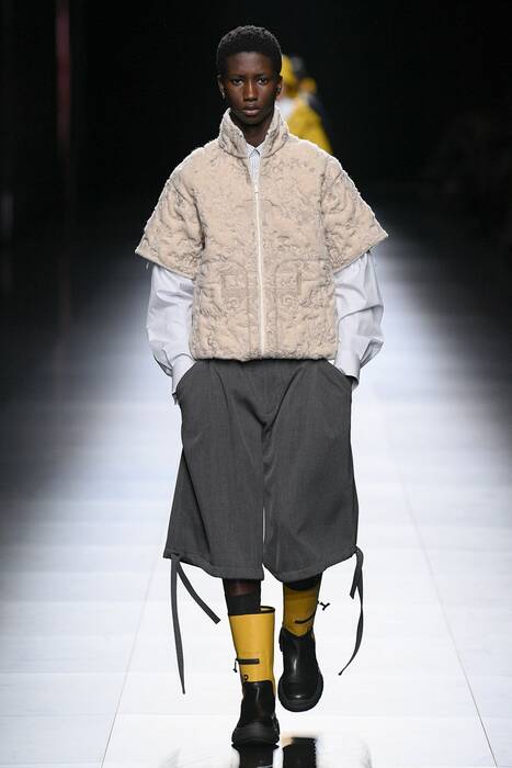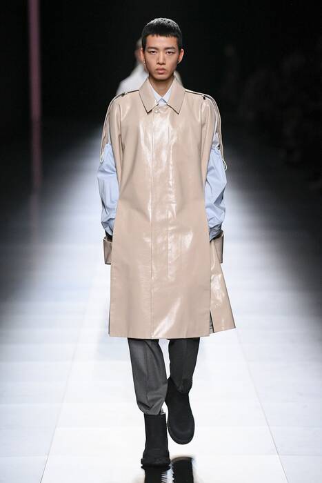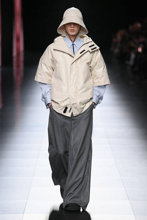 В 1955 году Кристиан Диор принимает на работу студента фэшн-школы Ecole de la Chambre Syndicale Ива Сен-Лорана. Спустя два года Диор назначает его своим преемником. С 1958 по 1960 год Сен-Лоран создал для дома шесть коллекций — именно их изучал креативный директор мужской линии Ким Джонс при подготовке коллекции сезона осень-зима 2023. Обошлось без прямых цитат. Например, о сен-лорановской эпохе в Christian Dior напоминают большие круглые воротники, только теперь они идут к дутым жилеткам. Или спущенные на манер декольте куртки и пиджаки — Сен-Лоран похожим образом акцентировал ключицы. Еще в мужской коллекции Кима Джонса есть пальто и свитеры с молниями на рукавах, пиджаки, как будто подвернутые снизу, плащи из лакированной кожи и свободные шорты на завязках внизу. Из обуви — кожаные ботинки, похожие на обувь садоводов, и резиновые сапоги.