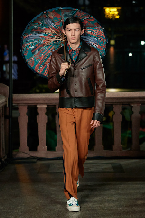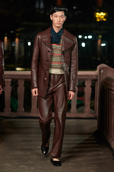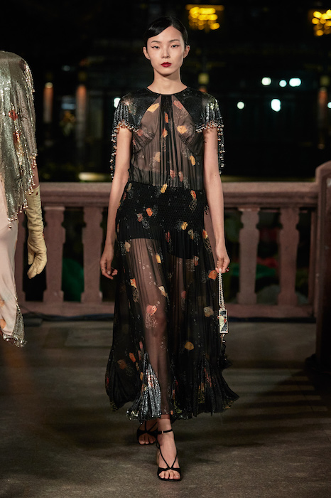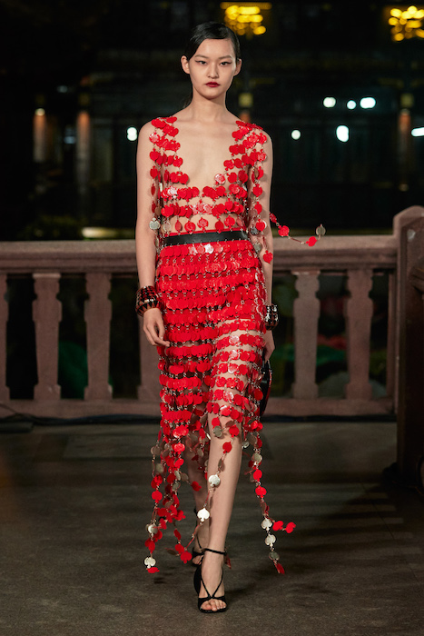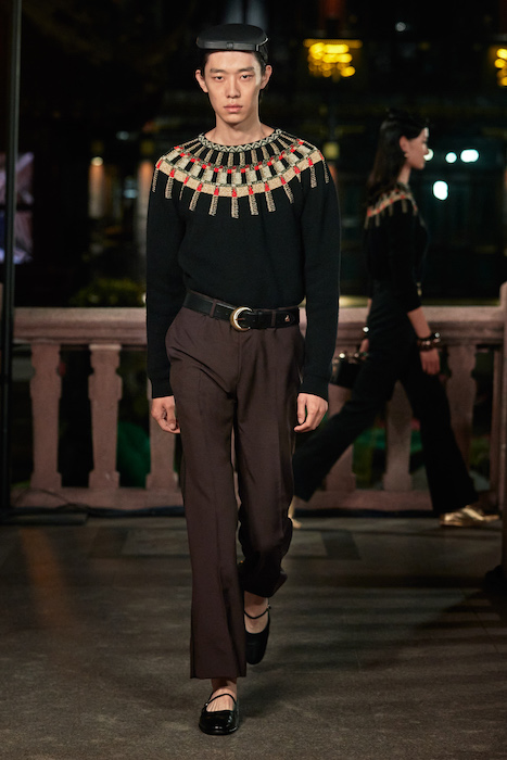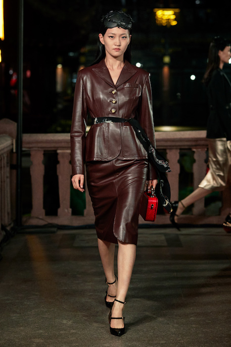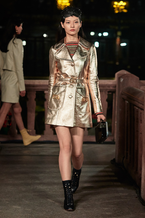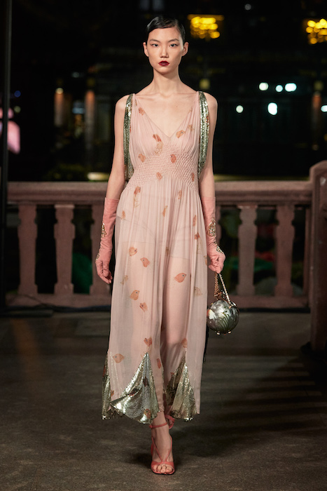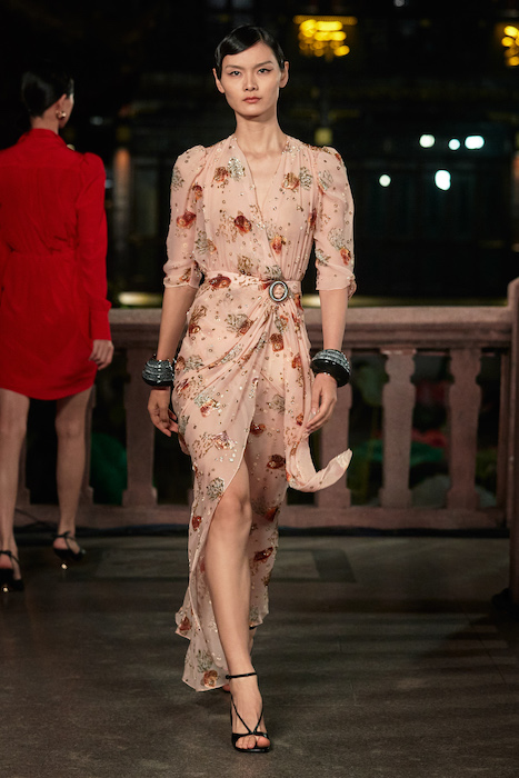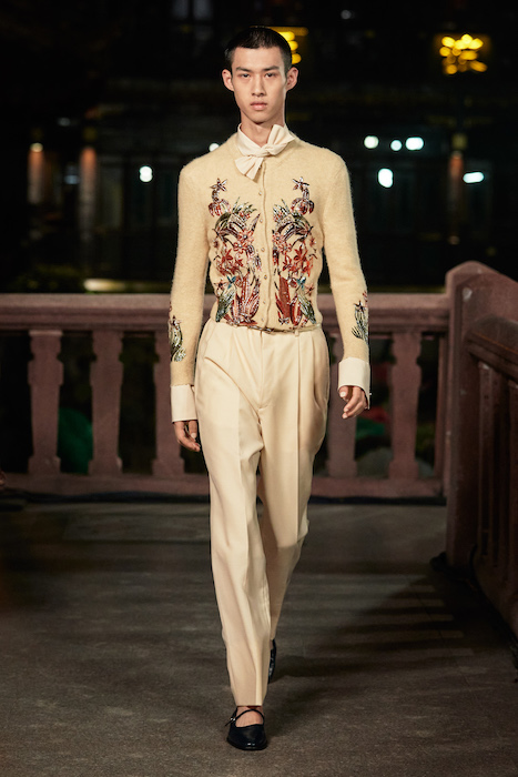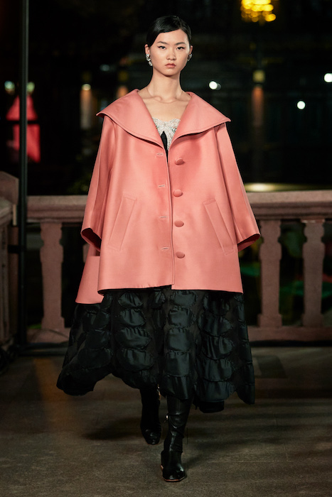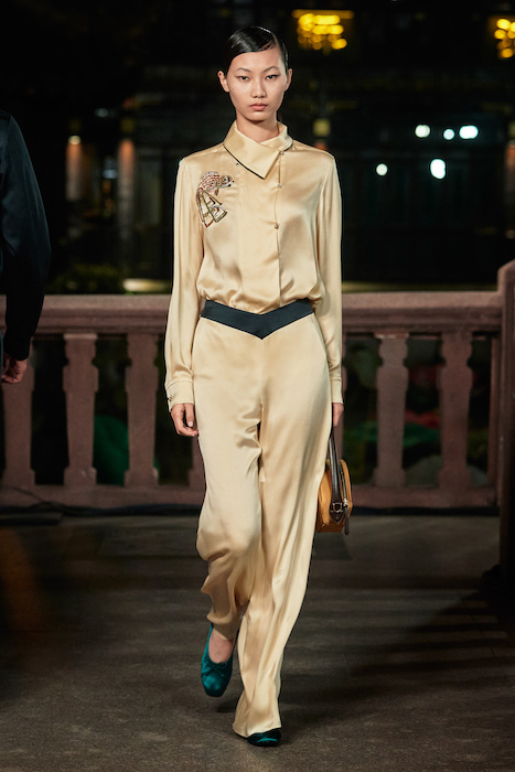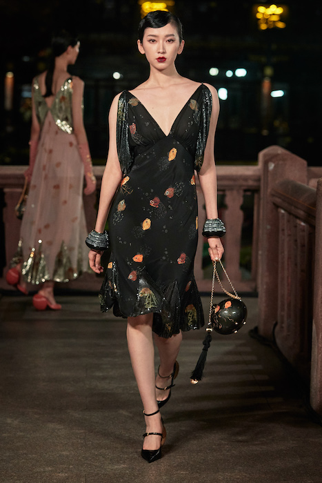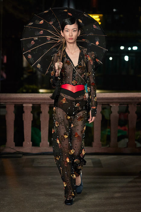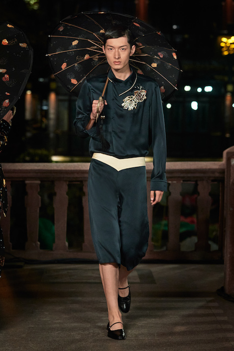 Показ Lanvin прошел не в Париже, как обычно, а в шанхайском саду Юй Юань (бренд принадлежит китайскому конгломерату Fosun International). В новой коллекции креативный директор Бруно Сиалелли обратился к истории дома — первый образ, к примеру, напрямую цитировал платье Жанны Ланван 1920-х годов. Другие архивные вещи Lanvin изобразили на восточный манер: используется традиционная китайская вышивка, а некоторые силуэты напоминают о ханбоке, корейском костюме. Выглядит все это по-голливудски роскошно: объемные многослойные юбки, плащи из позолоченной кожи, кожаные жакеты в ретро-силуэтах и вышитые жемчугом банты на поясе.
