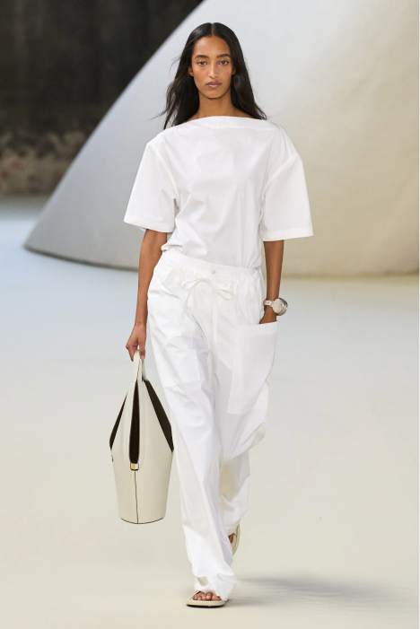 Обратили внимание на подолы платьев, которые здесь крепили кольцами к ремням или фиксировали на шее (греческая тога, ты ли это?); кейпы, в которые хочется закутаться даже летом (и, думается, носить как платье); топы-платки с воротником-халтером; тренчи, жилеты и минималистичные платья бюстье, а также велосипедные шорты с набедренными платками. Из аксессуаров выделили новые сумки-бочонки с длинными ручками — из цельной кожи и с прорезями, напоминающие корзинки.