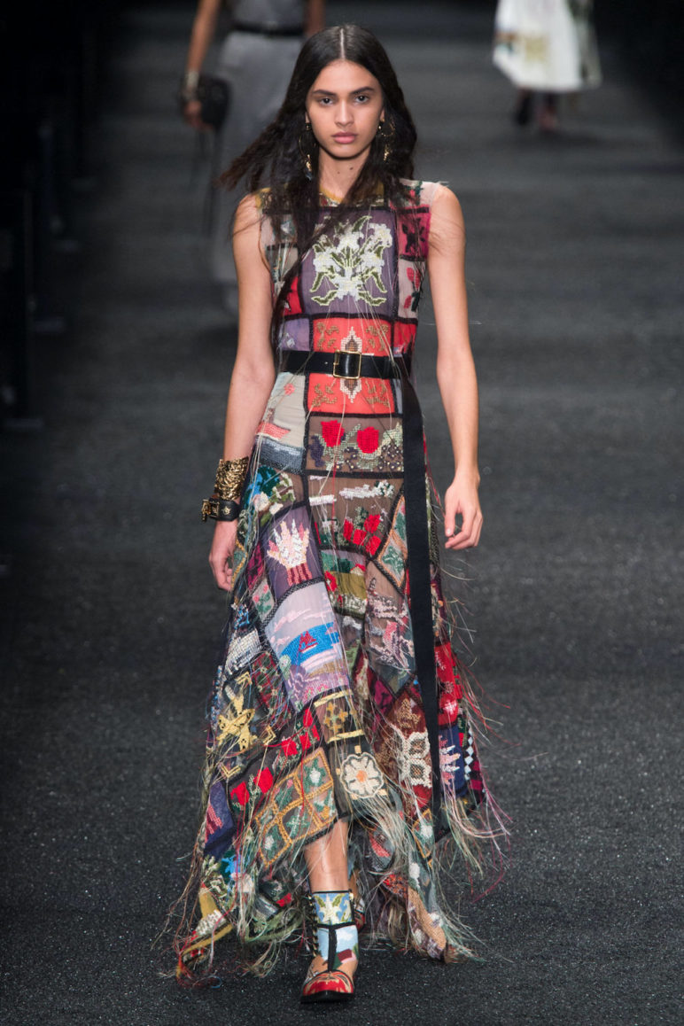 В коллекции Alexander McQueen осень-зима 2017 платья украшены вышивкой с мистическими символами, позаимствованными из трактатов древних златоделов. Солнце, нескромно расположенное в нижней части платья, взято с одной из страниц самого богато украшенного алхимического трактата всех времен «Сияние Солнца», созданного в 1531–1532 годах в Германии. Изображение светила на закатном небе являет собой символ рубедо — финальной стадии создания философского камня, на которой эликсир становился красным и мог превращать неблагородные металлы в золото. Чуть выше мы видим изображения двух «рук философа», уже знакомых нам по коллекции Gucci.