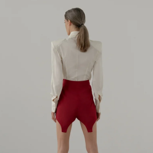 Определение «экокожа» сегодня неуместно добавляют к обычному кожзаменителю — мол, ни одно животное не погибло, а значит, материал можно назвать экологичным. Но это работает не так: производство кожзама считается опаснее для окружающей среды, чем использование натуральной кожи. Для Вики Газинской экологичная кожа — не просто слова. Поставщик бренда не использует поливинилхлорид, клей и другие токсичные вещества и стремится сделать материал биоразлагаемым. Из экокожи в коллекции сделаны кюлоты, платье-рубашка и юбка в самом узнаваемом силуэте дизайнера.