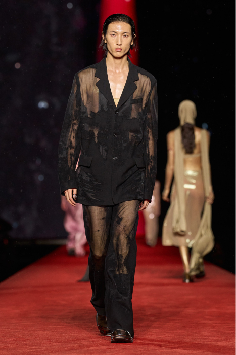 В этом самом моменте модели вышагивали по подиуму в выстиранной в кислоте и потертой джинсе, рваных смокингах и платьях. Некоторые из них были «вывалены в грязи», другие — разорваны и собраны по кусочкам, третьи испачканы цветной красной, как после игры в пейнтболл. Кстати, грязью были вымазаны и лица моделей. Остается надеяться, что лечебной.