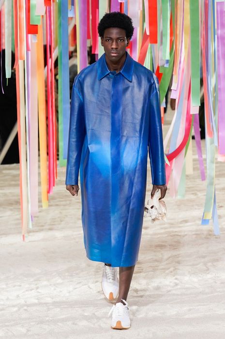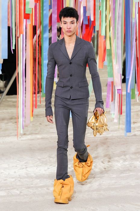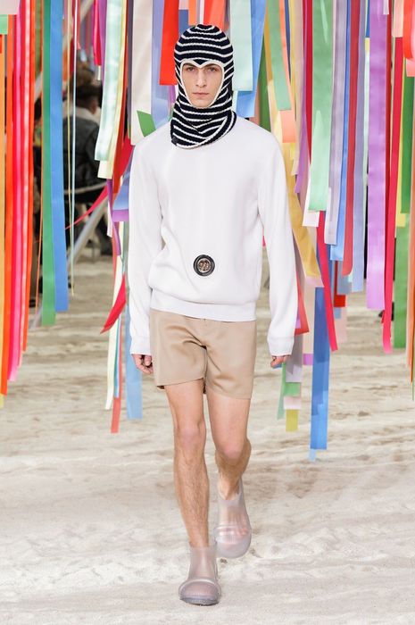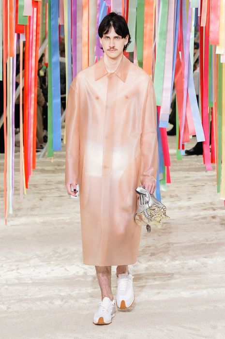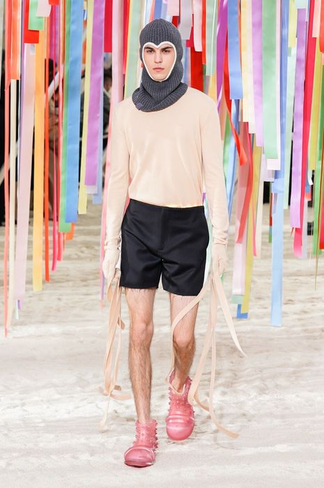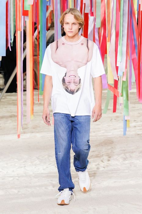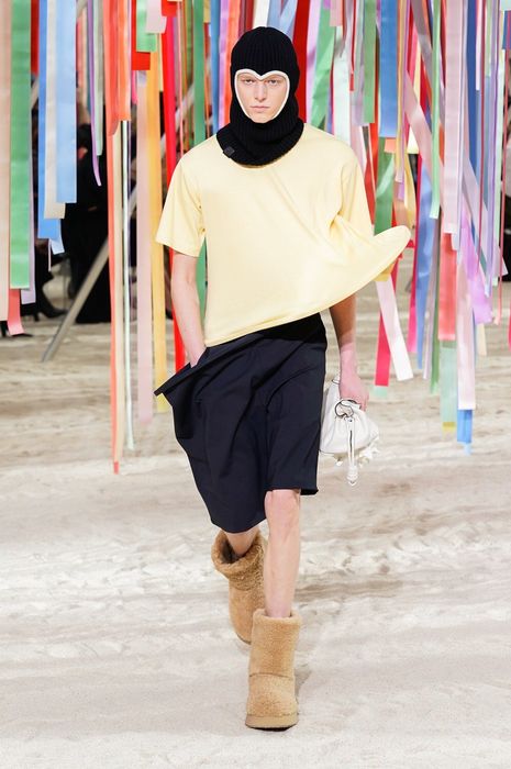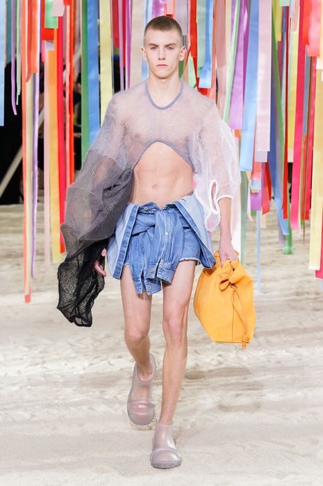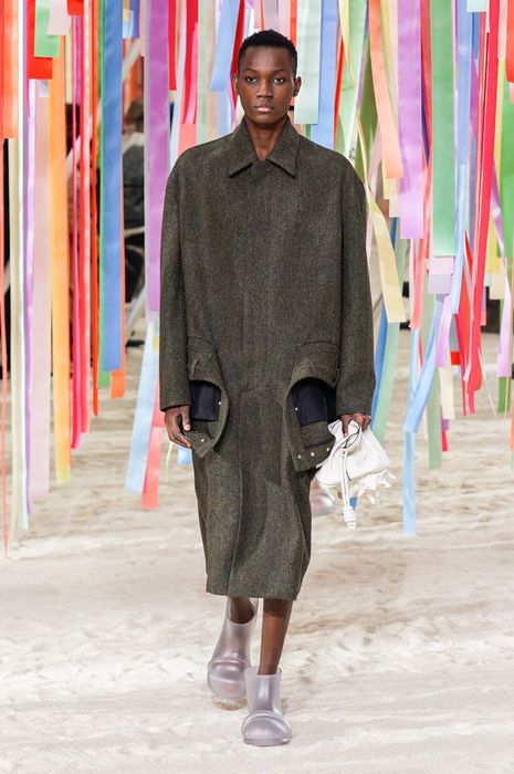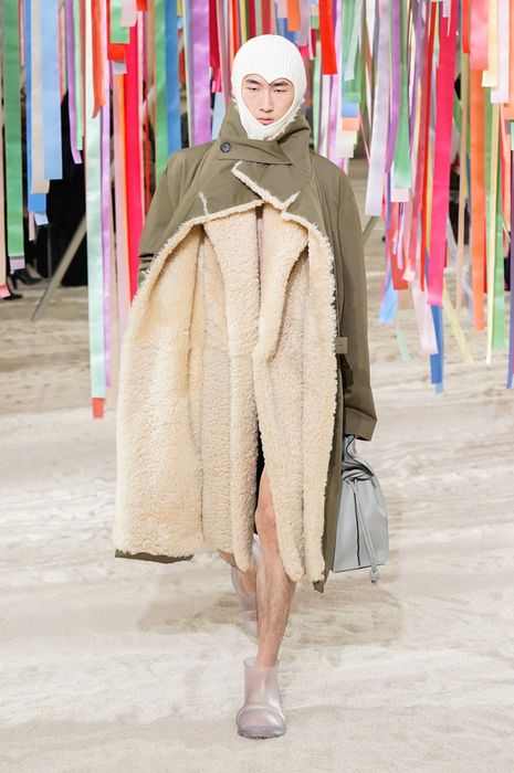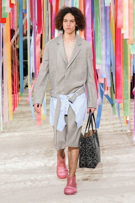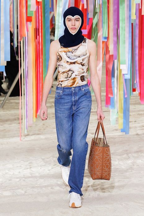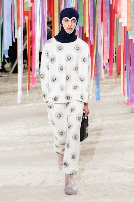 В новой мужской коллекции Джонатана Андерсона одежда живет собственной жизнью. Комбинезоны и майки светятся, потому что украшены светодиодными гирляндами, футболки и шорты-бермуды взлетают в воздухе (этот эффект дают вшитые ободы), а под тельняшкой бьется большое сердце размером с торс. Также в коллекции Loewe есть легкие трикотажные топы, словно морская пена, обтягивающие костюмы и объемные пальто — к некоторым из них идет широкий пояс, имитирующий джинсы с ремнем. Несколько вещей, в том числе пальто и сумки, украшены десятком металлических сеток для раковины. Образы завершали балаклавы с вырезом в форме сердца, прозрачная резиновая обувь и ботинки, повторяющие очертания сумки Flamenco.