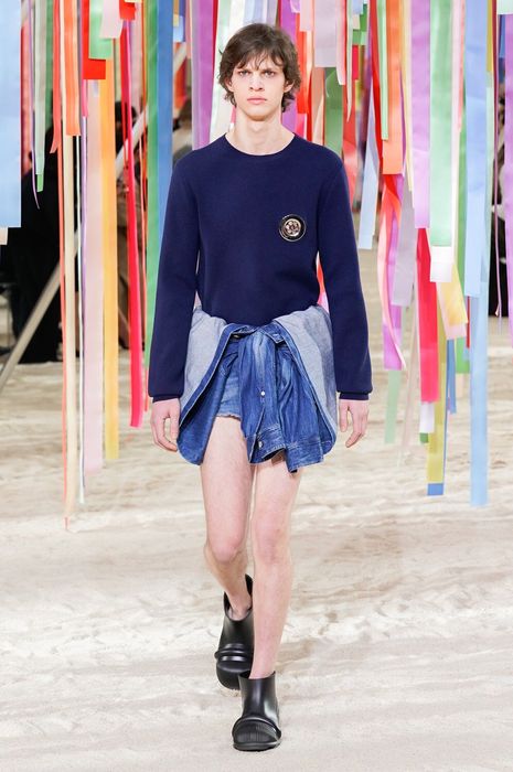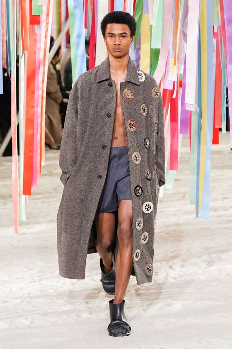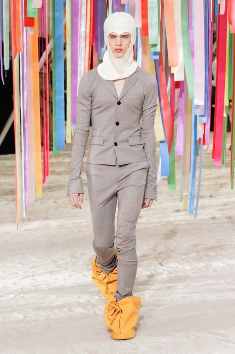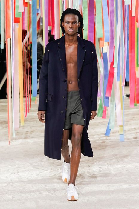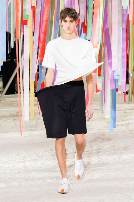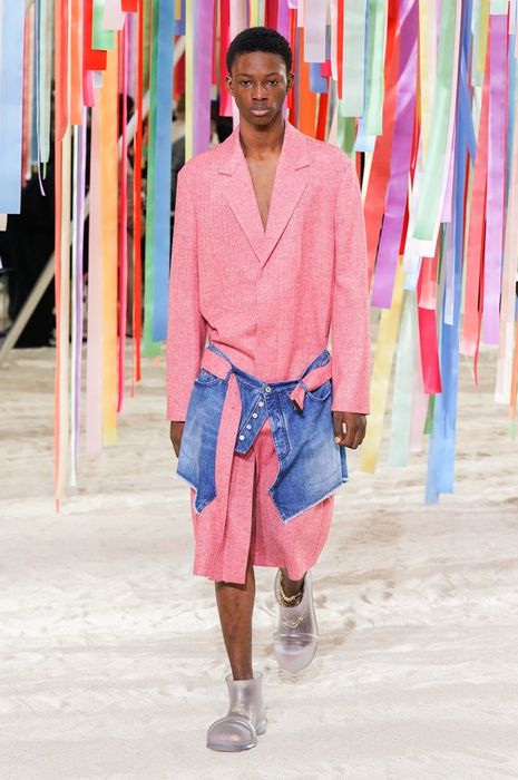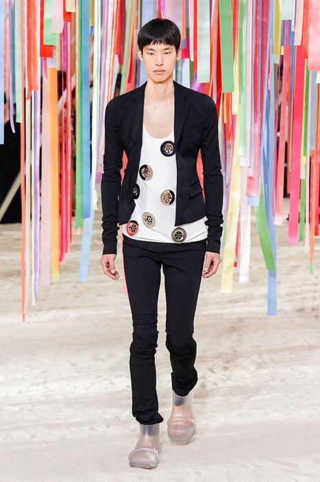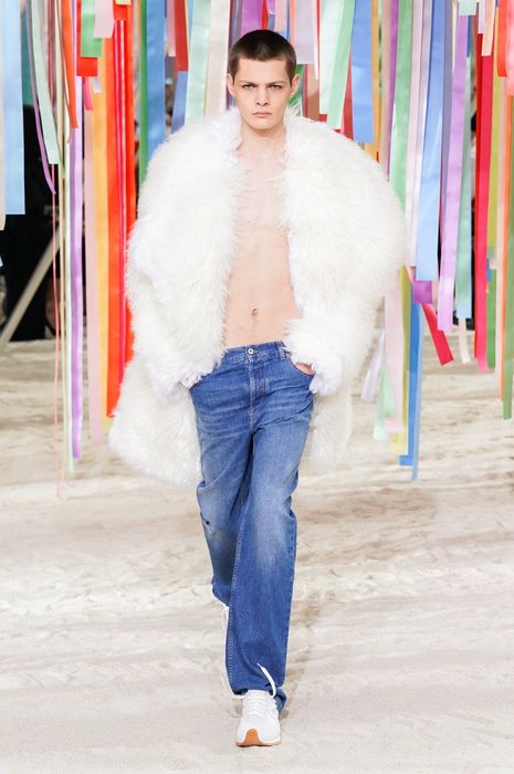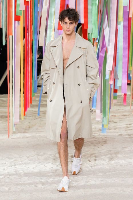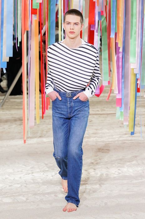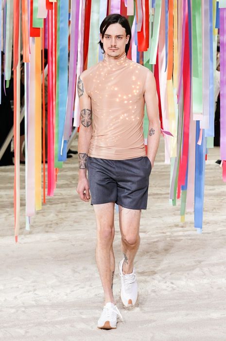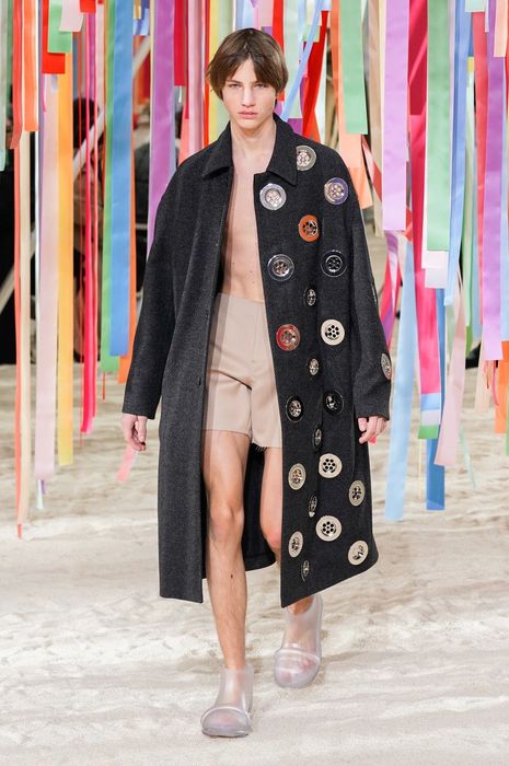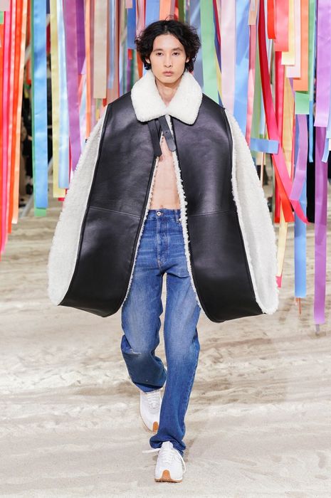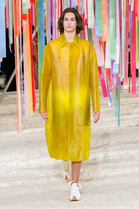 В новой мужской коллекции Джонатана Андерсона одежда живет собственной жизнью. Комбинезоны и майки светятся, потому что украшены светодиодными гирляндами, футболки и шорты-бермуды взлетают в воздухе (этот эффект дают вшитые ободы), а под тельняшкой бьется большое сердце размером с торс. Также в коллекции Loewe есть легкие трикотажные топы, словно морская пена, обтягивающие костюмы и объемные пальто — к некоторым из них идет широкий пояс, имитирующий джинсы с ремнем. Несколько вещей, в том числе пальто и сумки, украшены десятком металлических сеток для раковины. Образы завершали балаклавы с вырезом в форме сердца, прозрачная резиновая обувь и ботинки, повторяющие очертания сумки Flamenco.