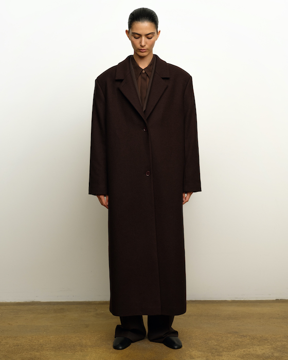 Визитная карточка российской марки Agreeg — это костюмы. В осенне-зимней коллекции есть варианты с однобортным жакетом, жакетом без лацкана и прямыми брюками. Брюки можно заменить макси-юбкой из шерсти Loro Piano, а вместо строгого костюма выбрать комплект из шелкового трикотажа. В секции верхней одежды — пальто в коричневом оттенке, пончо из кашемира в двух оттенках и классическое пальто в длине макси из шерсти мериноса. Также осенний гардероб Agreeg включает топы и платья из шелка шоколадного оттенка, футляры из джерси и прозрачные рубашки — все эти вещи тактильно приятные и настраивают на безмятежность.
