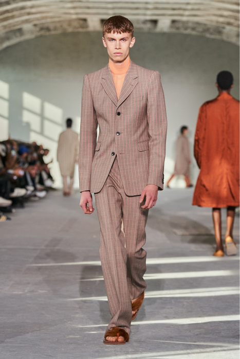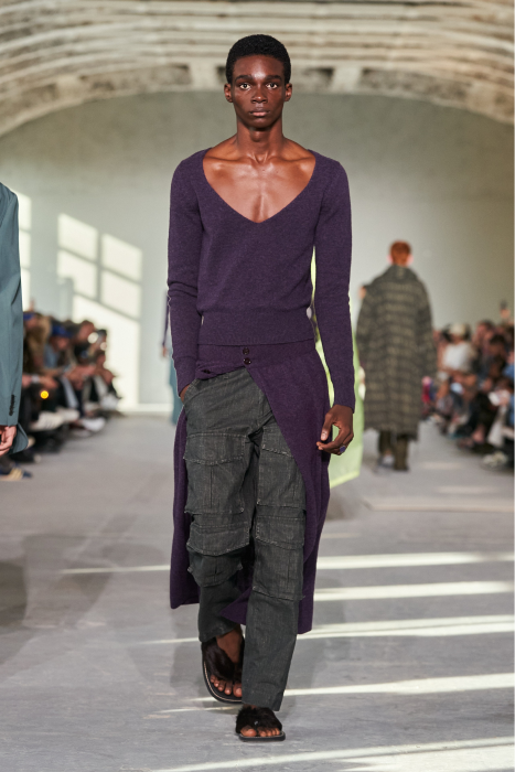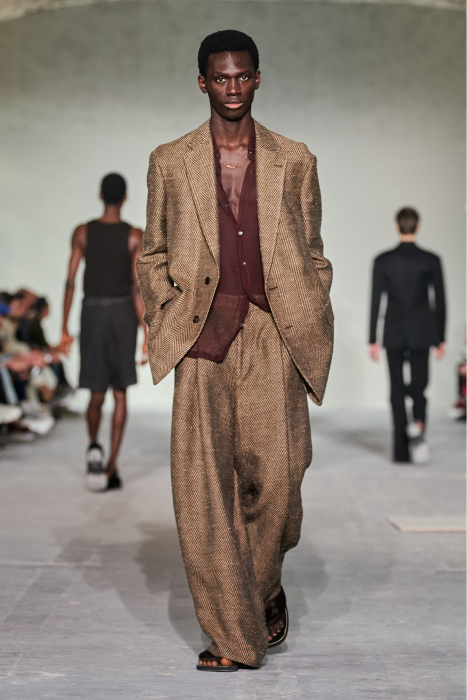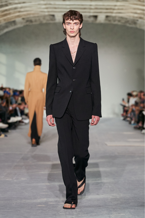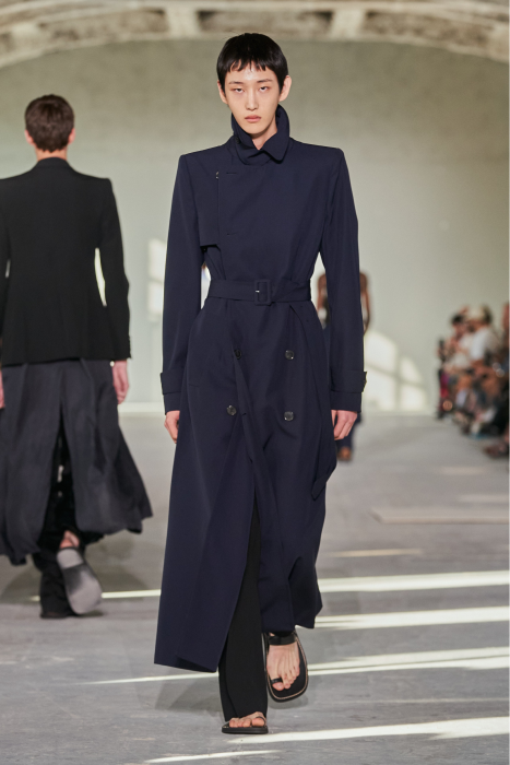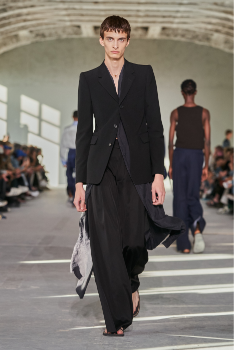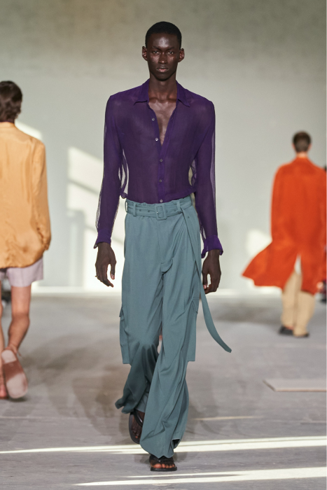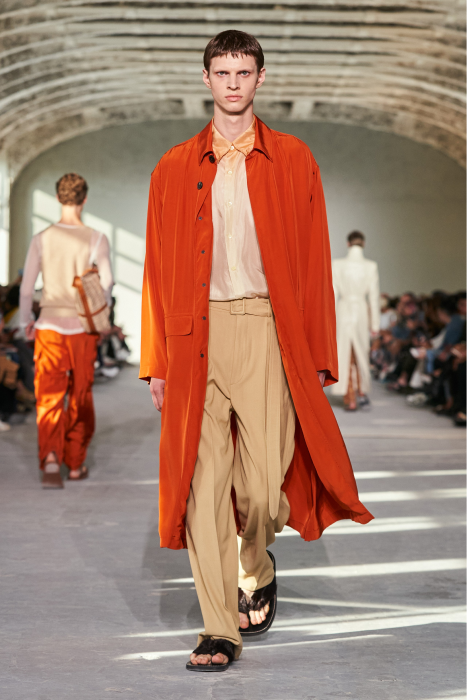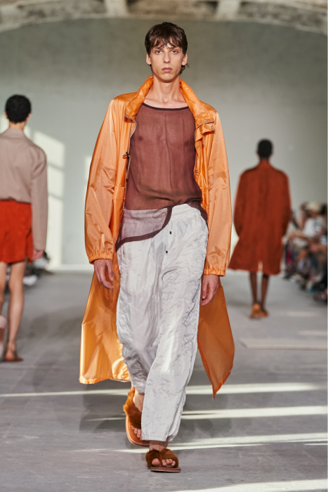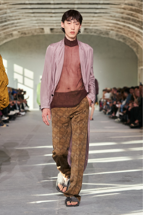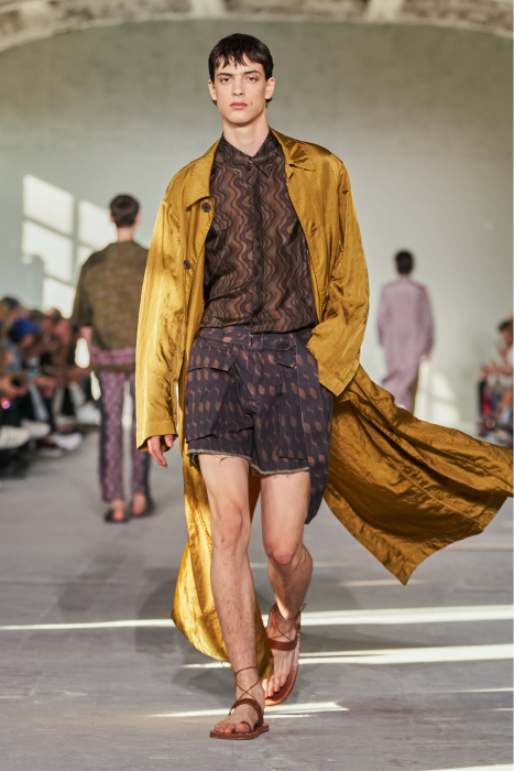 Дизайнер, равно как и его коллеги, задался вопросом: «А что есть мужественность сейчас и как она может быть интерпретирована и раскрыта с помощью одежды?» Ответ получился по-дрисваннотеновски изобретательным, легким (за счет струящихся тканей и расслабленных силуэтов) и по-настоящему красивым. Дикий шелк шантунг шел рядом с сетчатым трикотажем, а лен — с бархатом в приглушенных оттенках с гипнотическими принтами. Поверх бронзовой рубашки было накинуто такое же бронзовое пальто, которое сочеталось с шортами, расшитыми золотыми пайетками. Прозрачные топы из муслина отлично смотрелись с сандалиями, вьетнамки и клогами, отороченными мехом, жатый бомбер — с прозрачным гольфом и джинсовыми шортами, а в пару к черному брючному костюму был подобран принтованный халат.
