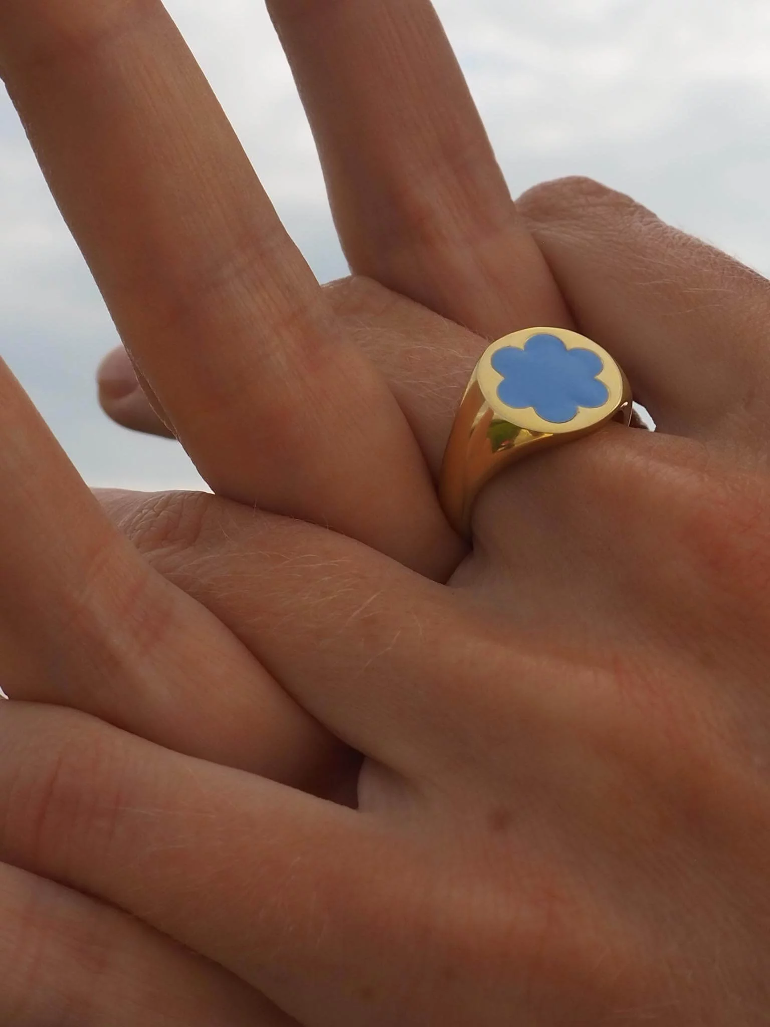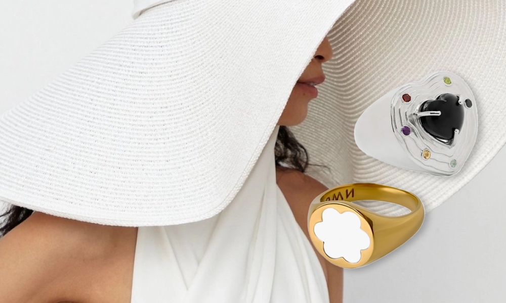 Наши фавориты здесь — кольца-печатки с перламутром «Незабудки». Почему они? Все просто: ирония на тему своего незабываемого выбора. Отдельно хочется отметить кольцо «Двойное сердце» — издалека выглядит просто, но при детальном рассмотрении считывается идея (цитируем) «любви, которая никогда не перестает».